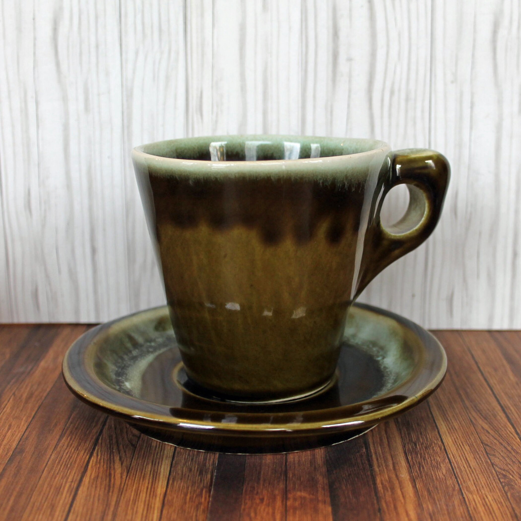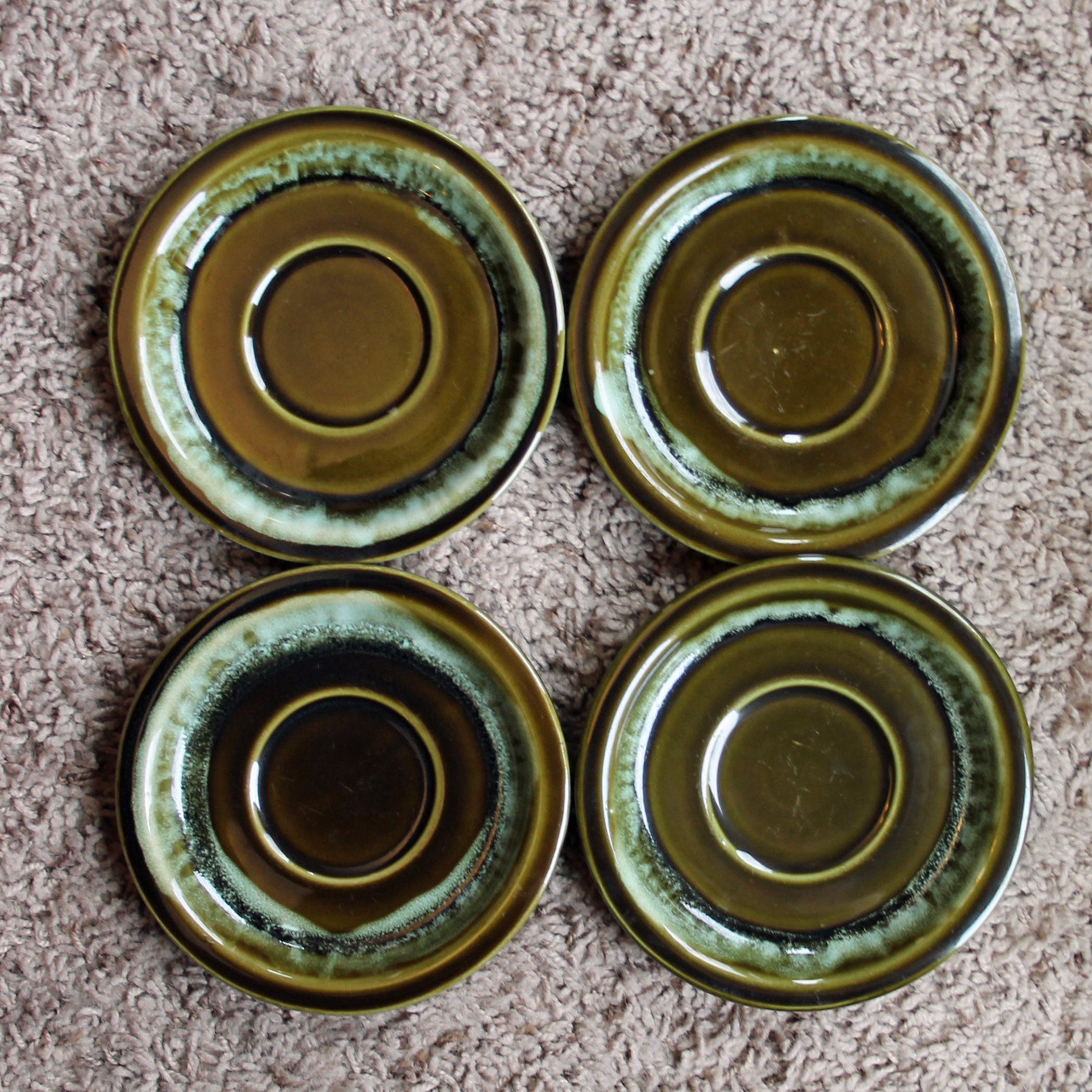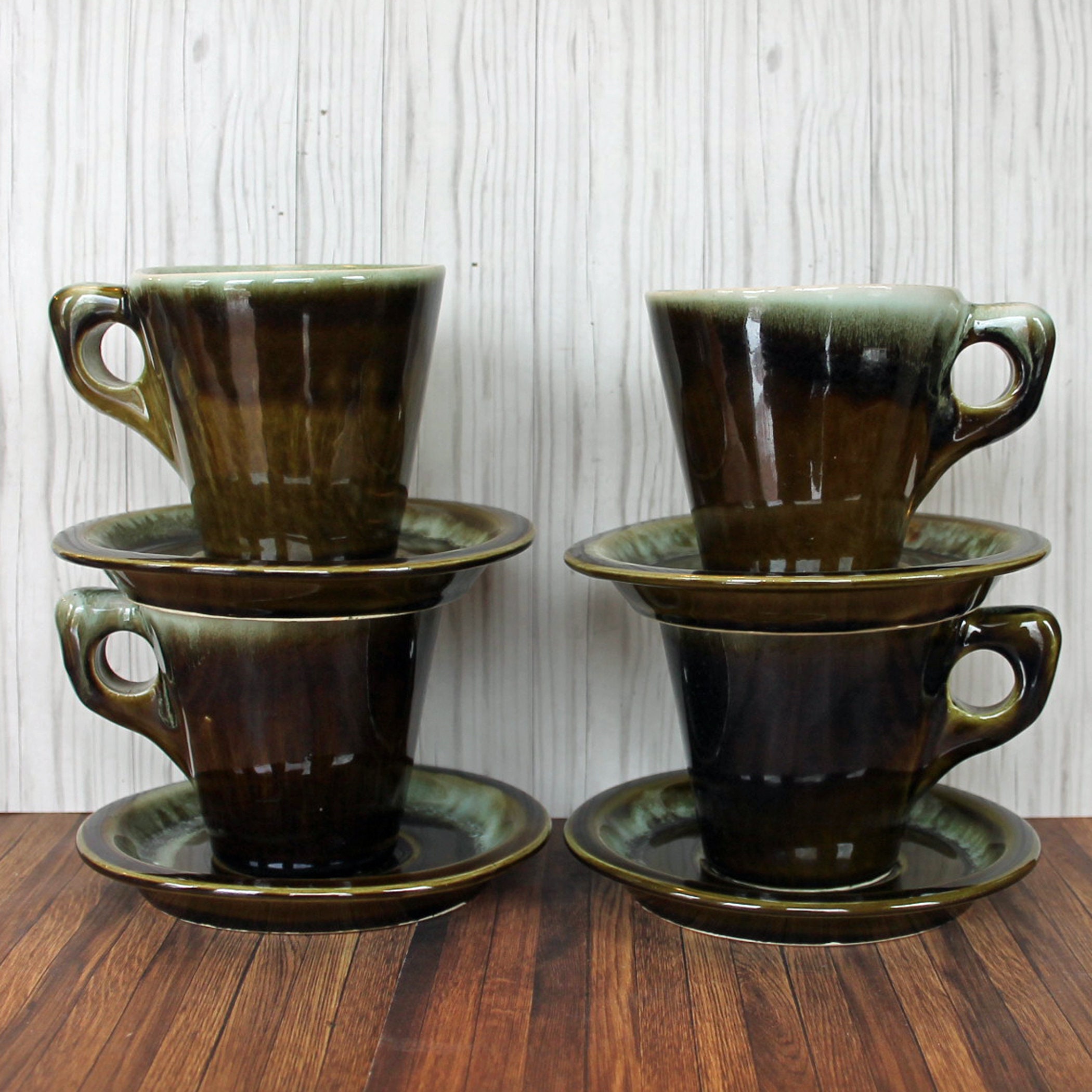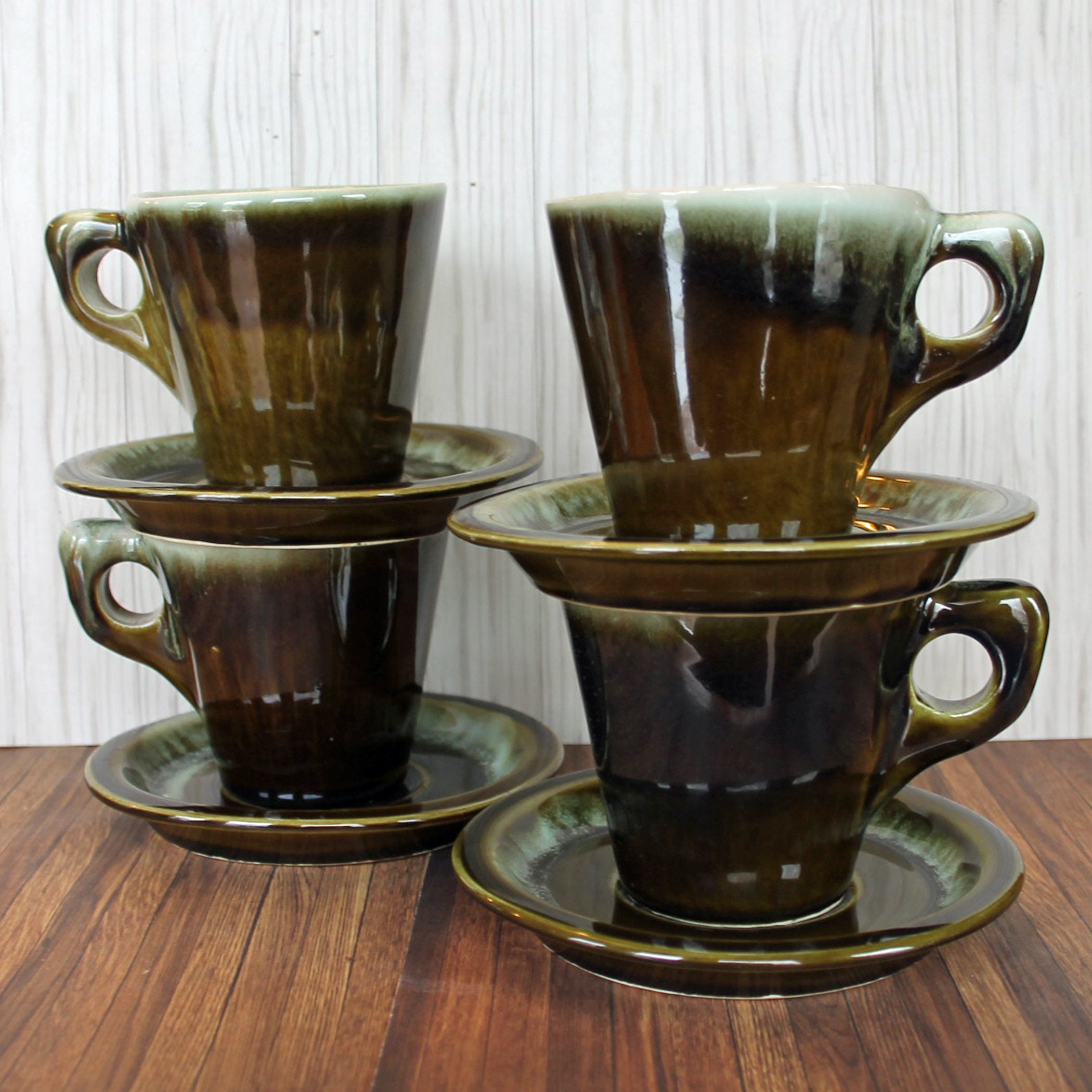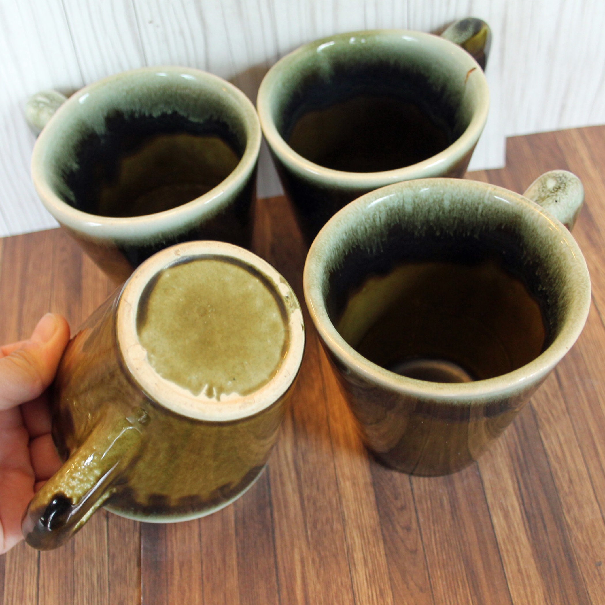 This set of 4 cups and saucers by Pfaltzgraff are in the Copper Green pattern. The mugs are each 3.5" tall and 3.5" in diameter at the top. They taper to 2.25" in diameter at the bottom. The saucers are 5.75" in diameter. They are a deep olive green, with a white drip glazing down the rim and edges, creating a a cool blend of colors ranging from dark green, to lighter green, then to white. There are no makers marks on these pieces. These are thick, heavy ceramic pieces and each cup and saucer set weighs 1.25 pounds.