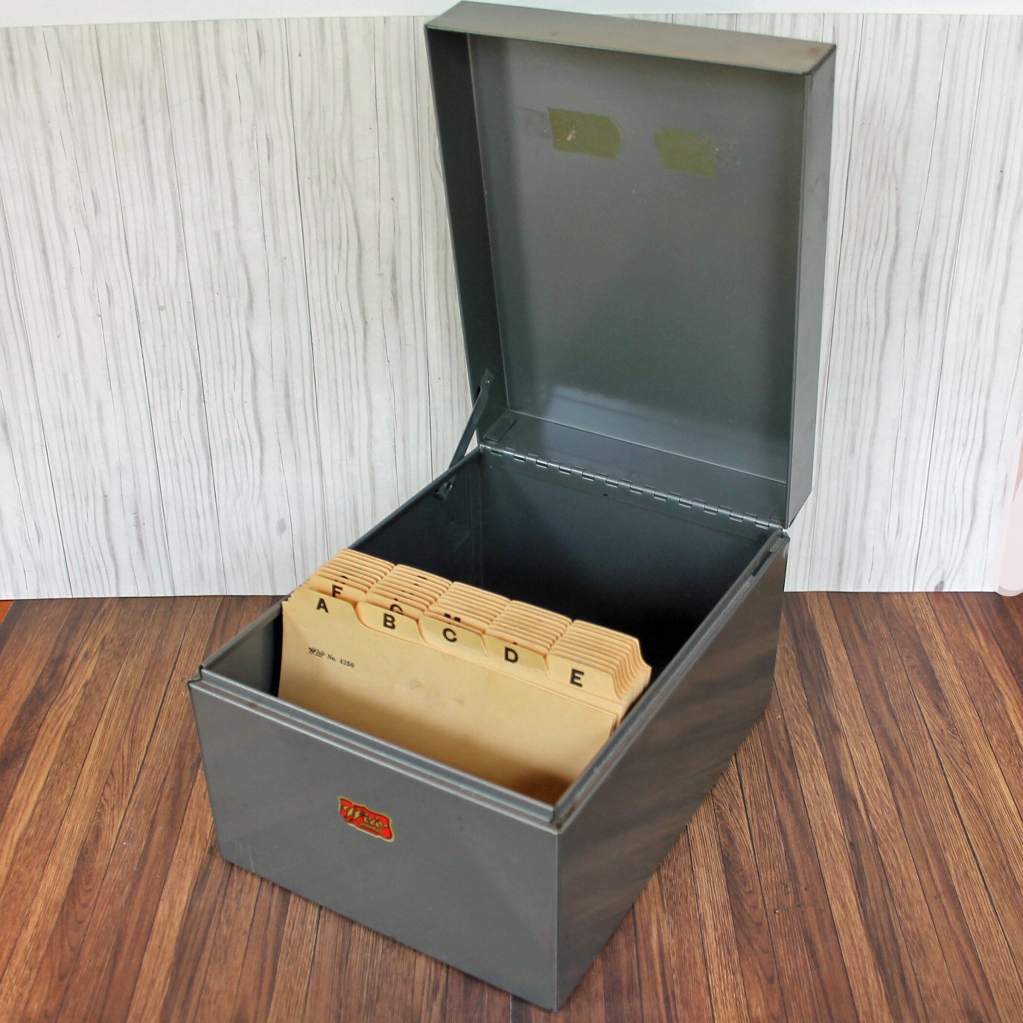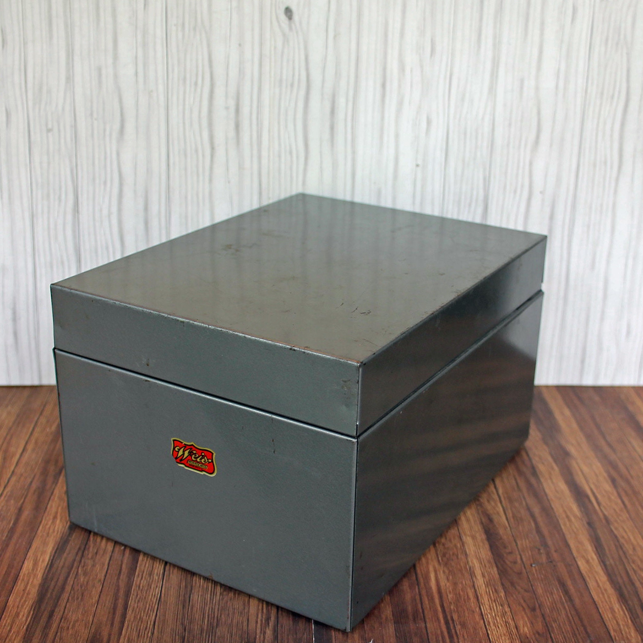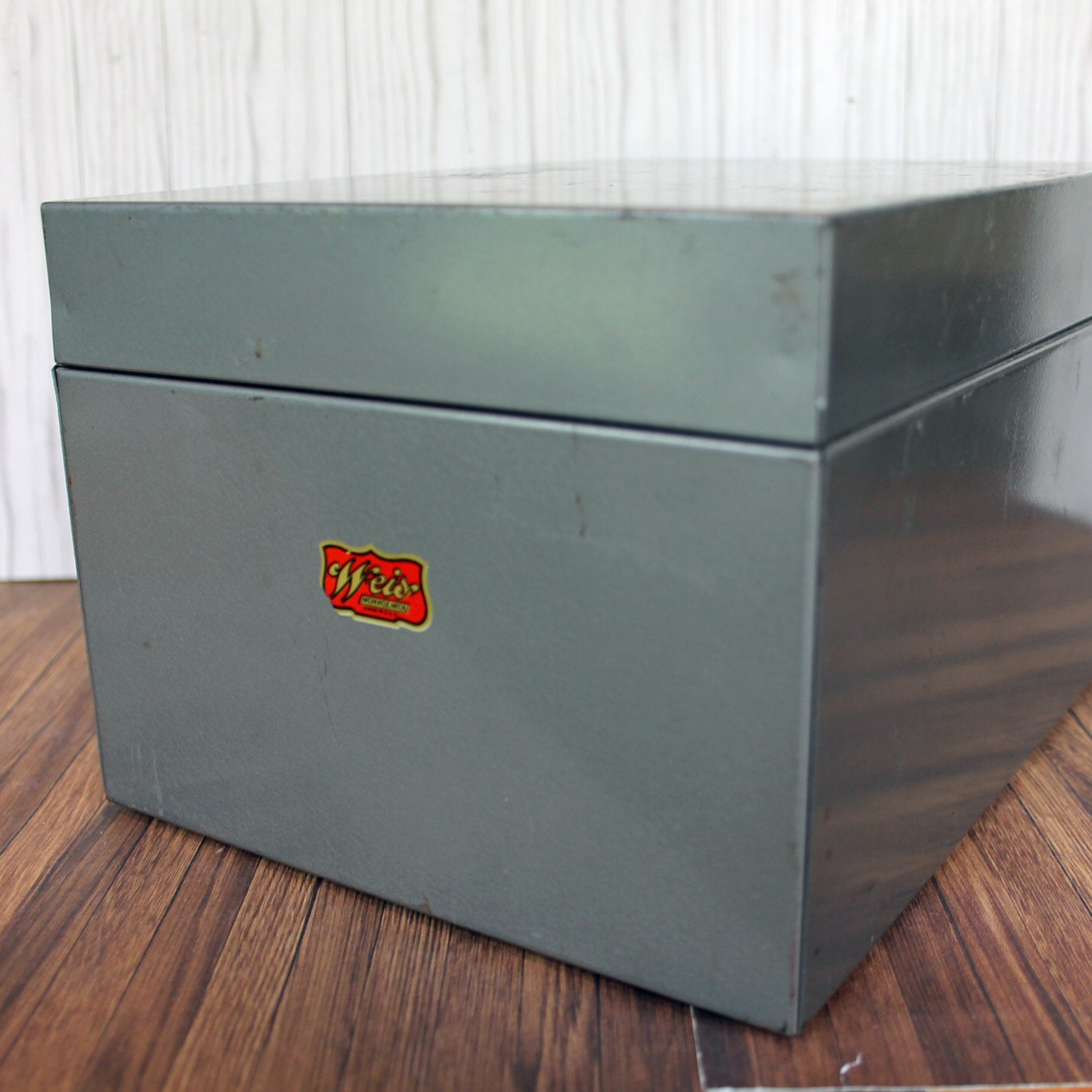 This gray metal card file by Weis Manufactuing is 8.5" long, 6.5" wide, and 5" tall. It has a flip top lid, and inside has it's original card file dividers. There is an adjustable piece to hold the cards in position. The box can hold 4" x 6" file or index cards. The front of the box is labeled with a Weis logo decal.
