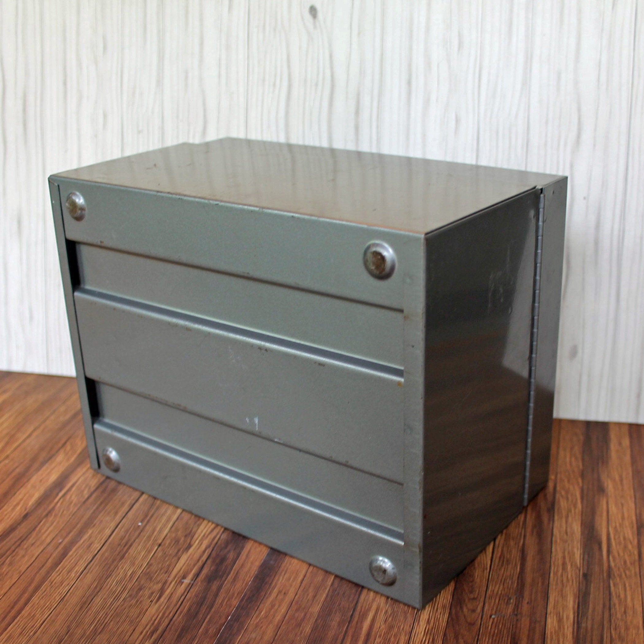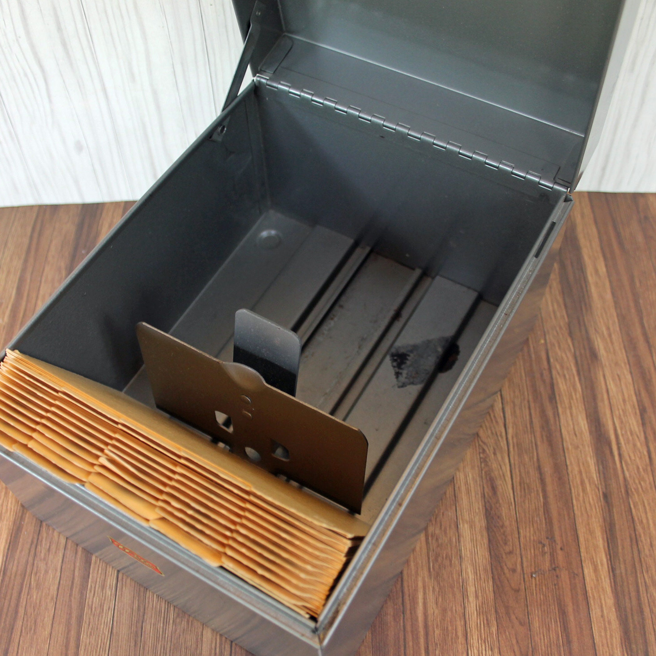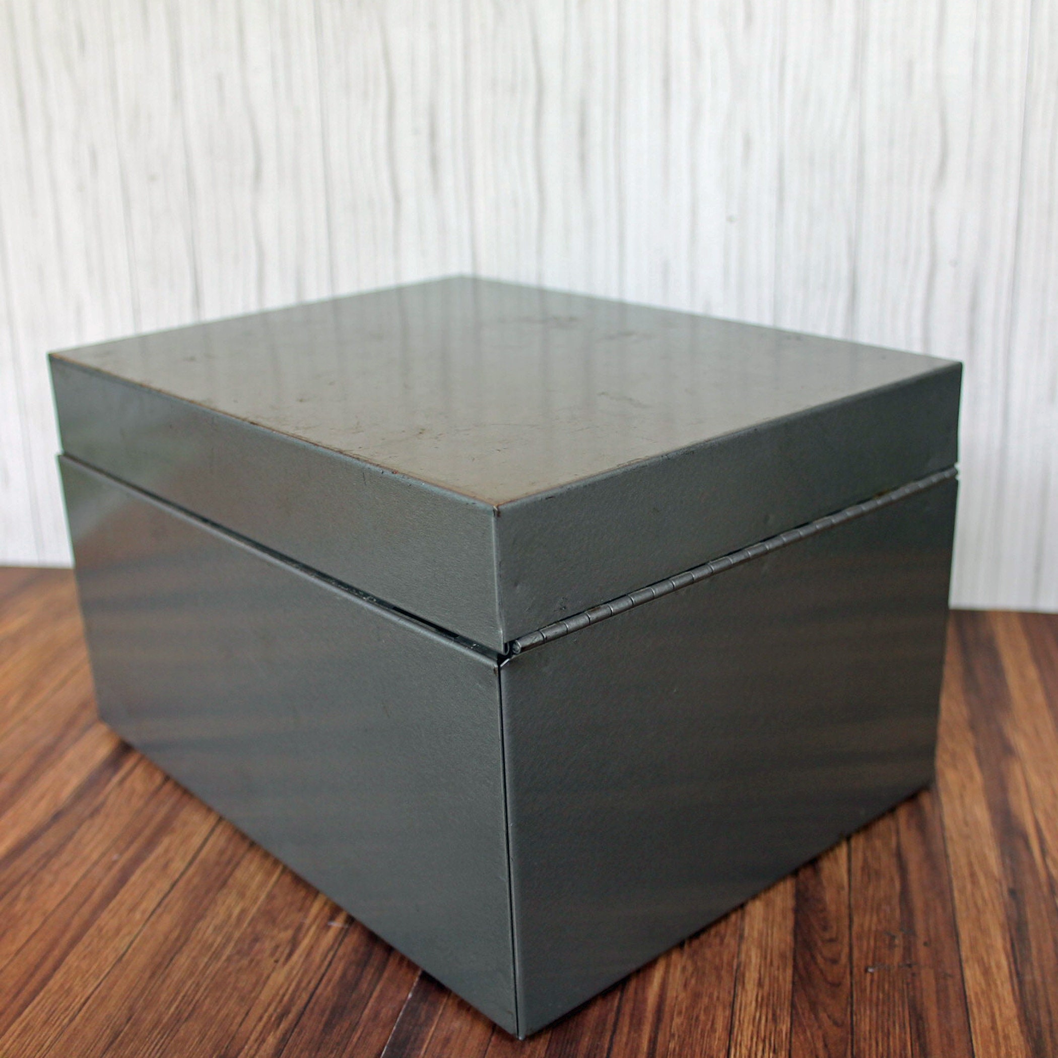 This gray metal card file by Weis Manufactuing is 8.5" long, 6.5" wide, and 5" tall. It has a flip top lid, and inside has it's original card file dividers. There is an adjustable piece to hold the cards in position. The box can hold 4" x 6" file or index cards. The front of the box is labeled with a Weis logo decal.