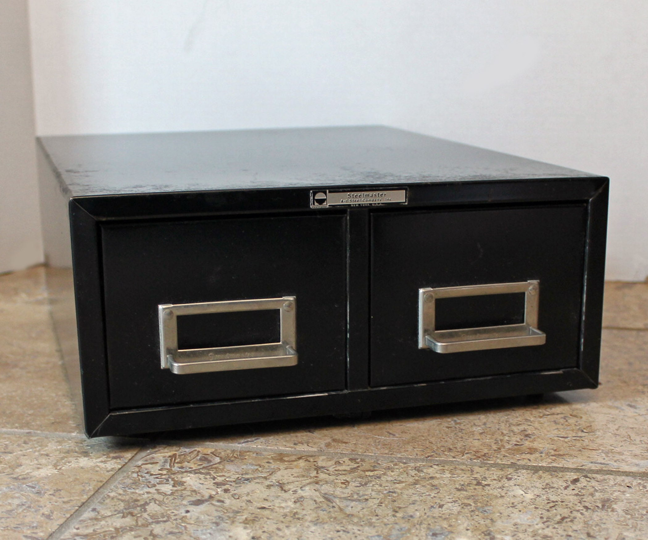 This nice 2 drawer card file by Steelmaster is 12.25" wide, 16" long and 5.5" high. It is a black metal cabinet with 2 sliding drawers. The drawers have silver metal handles, and each drawer has an adjsutable divider to hold the index cards. There is a silver metal label on the front that reads: STEELMASTER / ART STEEL COMPANY, INC / NEW YORK U.S.A.