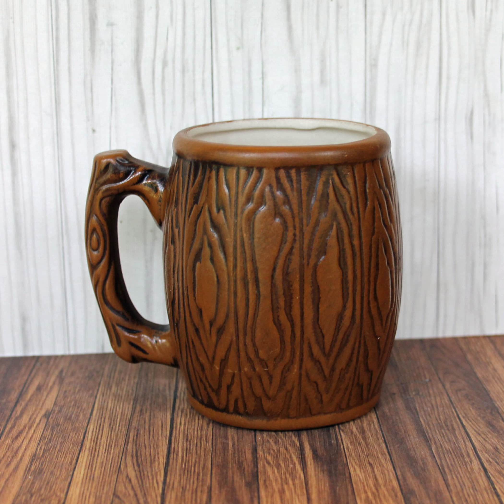 This cool cold Las Vegas souvenir mug is 3.75" tall and 3" in diameter. It has a faux wood grain texture, and the front of the mug depicts the Las Vegas strip, with buildings, casinos, and hotels. On the mug you can read the signs for the Golden Nugget and the Horseshoe. The front of the mug has LAS VEGAS and NEVADA in gold colored letters.