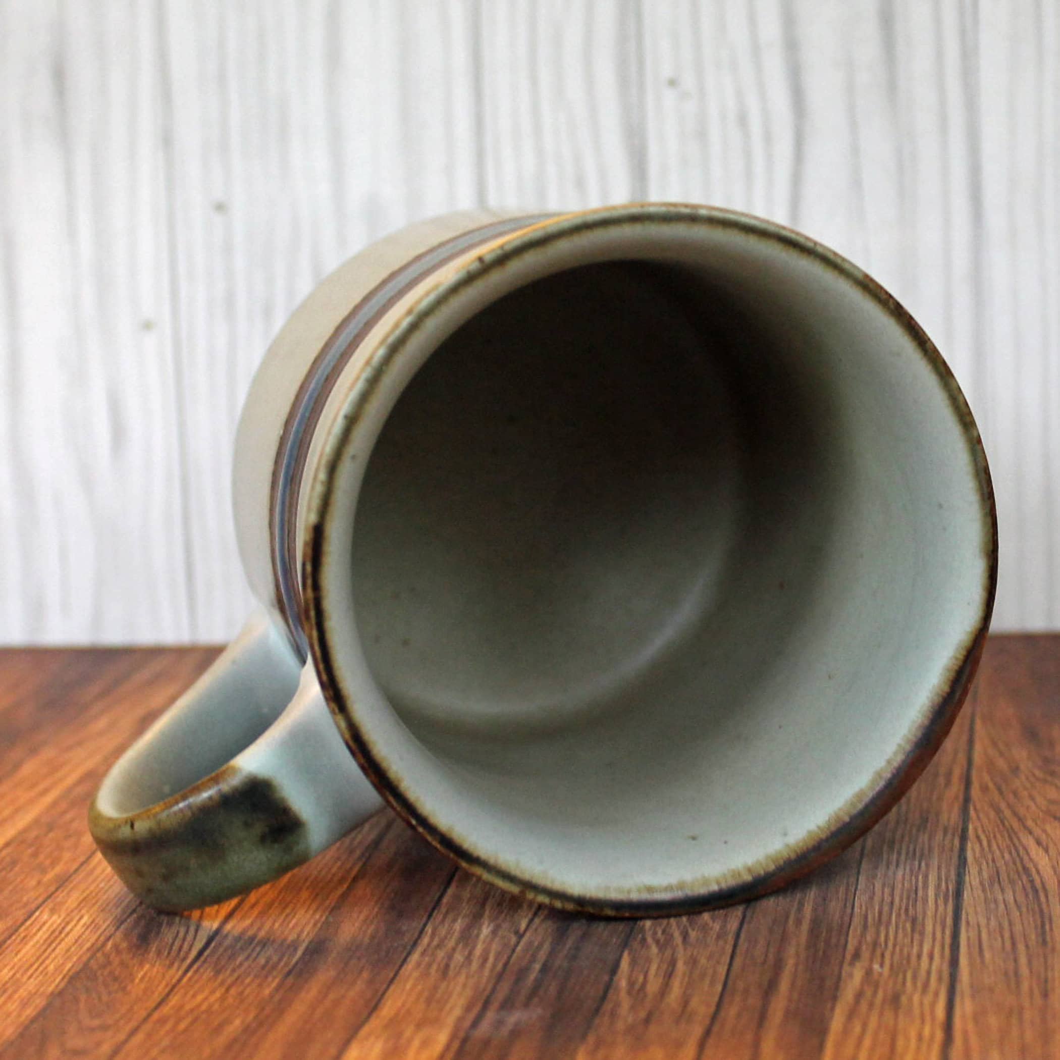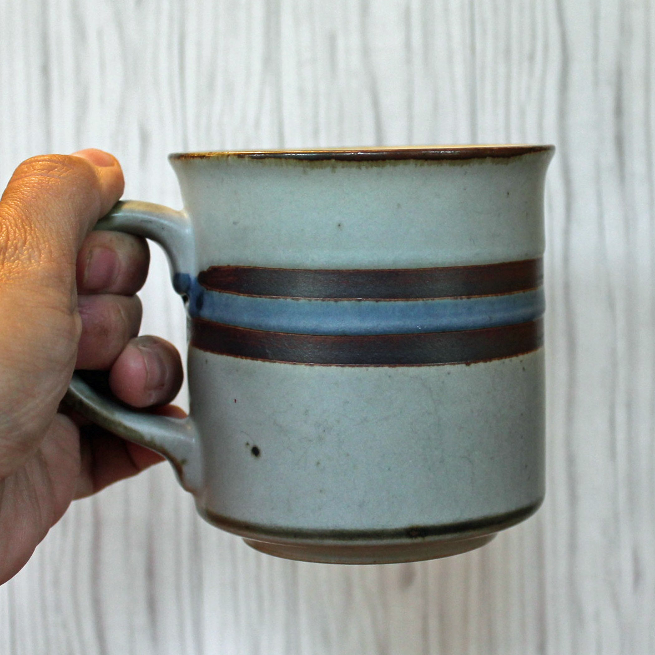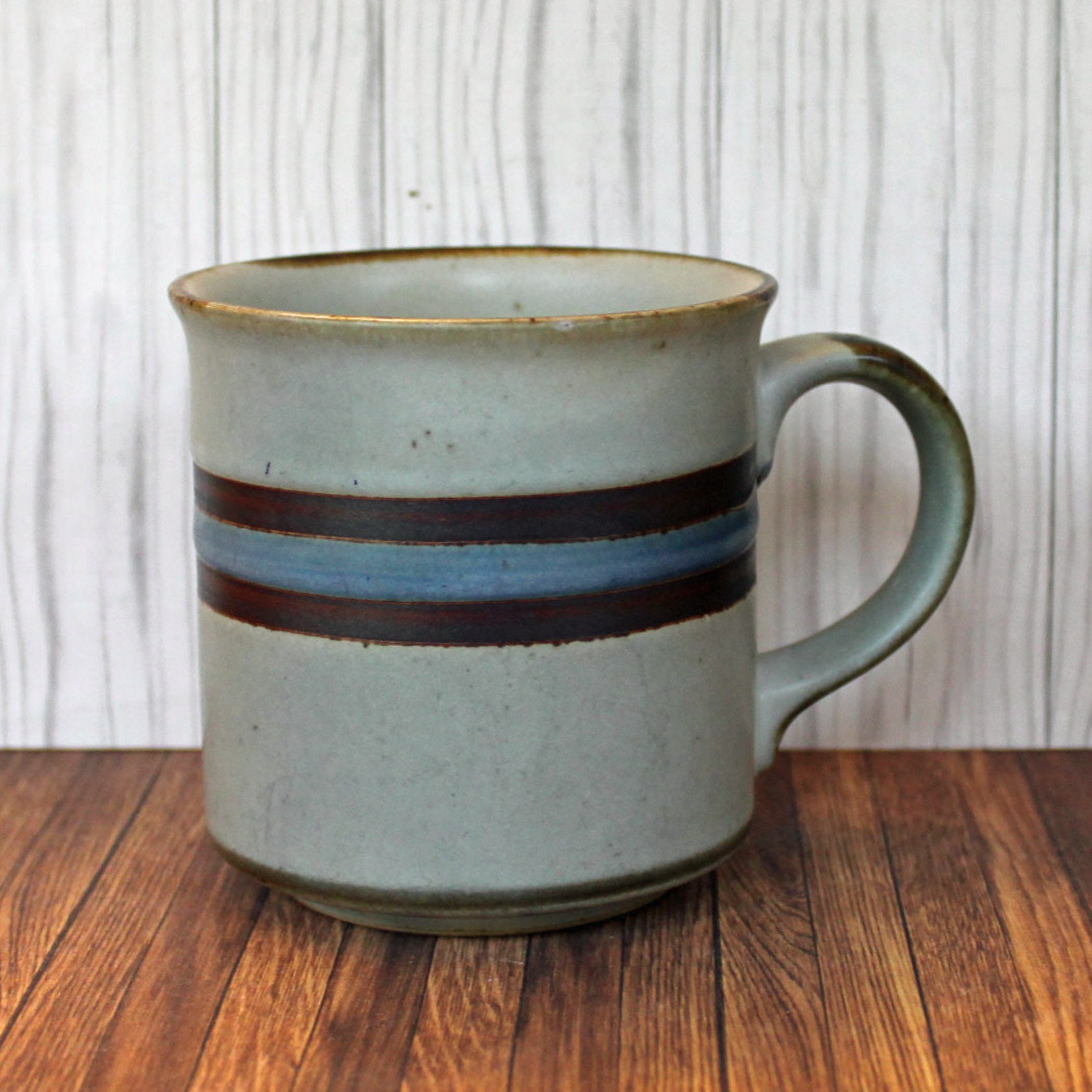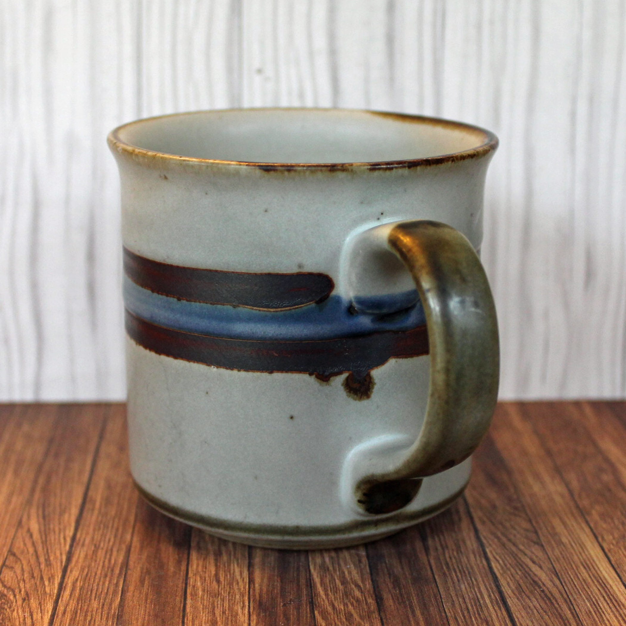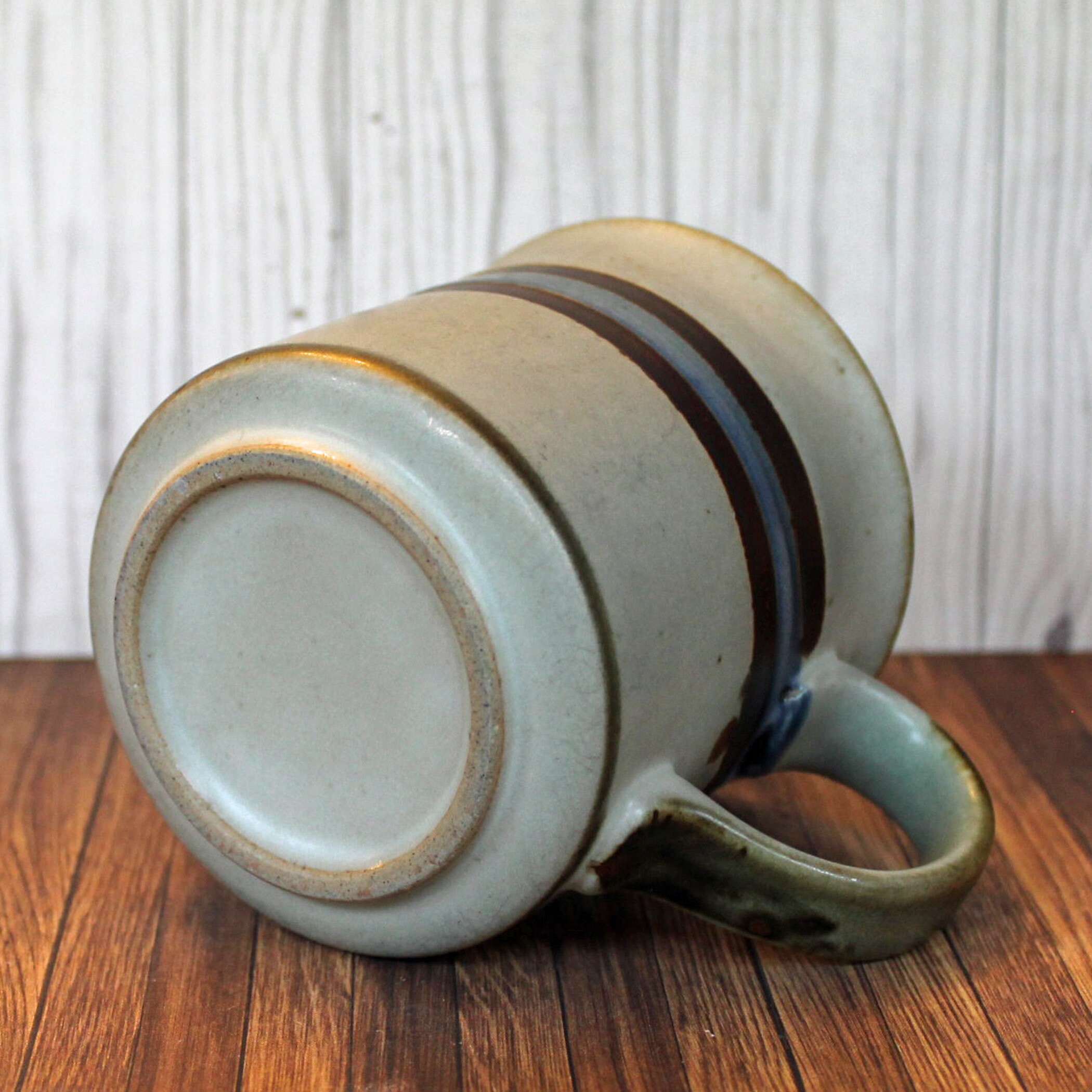 This Otagiri mug is from the Horizon collection and is a light gray stoneware with blue and gray/brown accent band around the mug. The mug is 3.5" tall and 3.5" in diameter, with the handle it is 5" wide. The mug is in very good condition with no chips or crack.