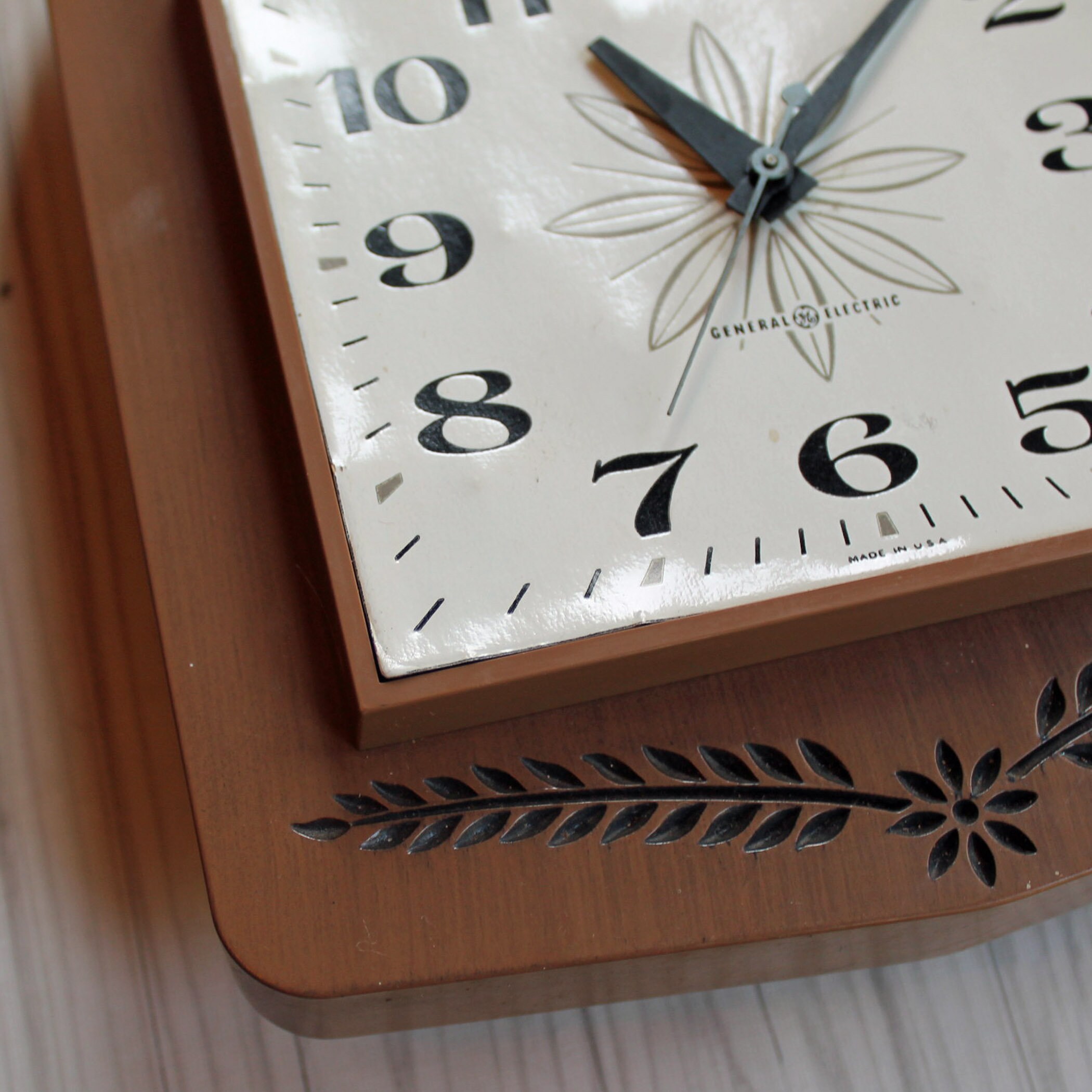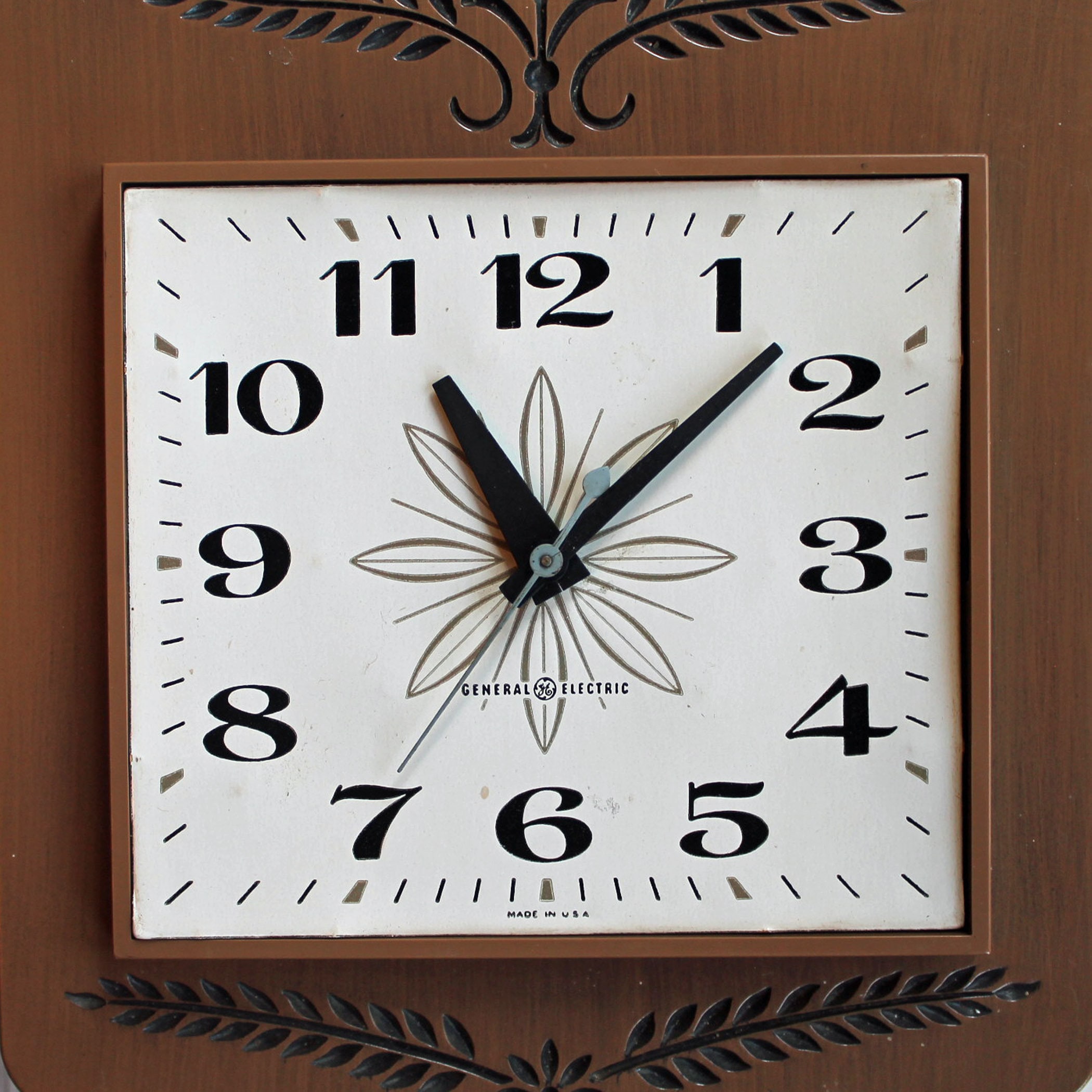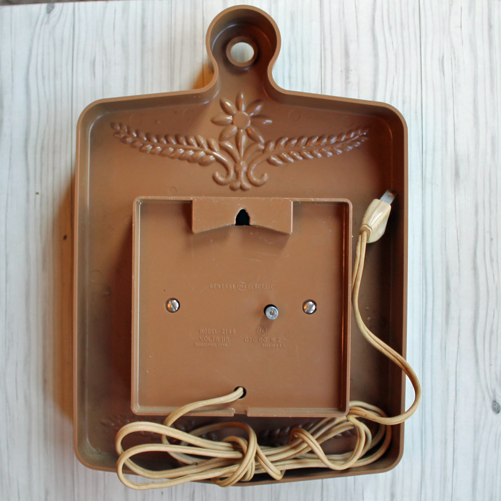 This cute wall clock is a plastic clock y General Electric, and is 7" wide and 10" tall. It is 2.25" deep. This clock has an rectangular shape with a faux wood finish. The face of the clock is a white square, with a brown leaf or flower design in the center, accened with black numbers and hands on the clock. The back of the clock is marked: GENERAL ELECTRIC / MODEL 2146 / VOLTS 115 / CYC 60 W 2 / BRDGEPORT, CONN / MADE IN USA. This is a plug-in electric clock - it is NOT batter operated. The original tan cord is atached.
