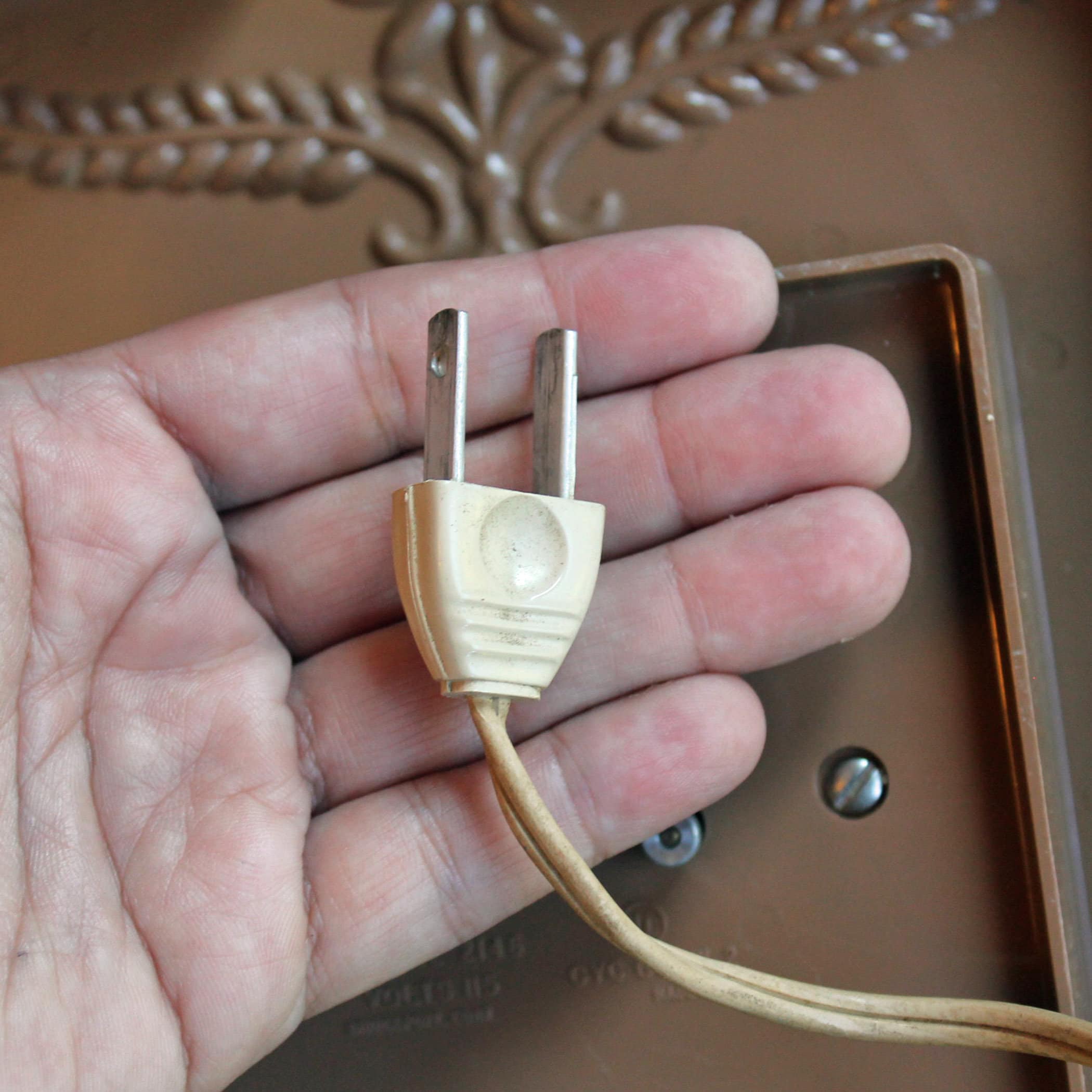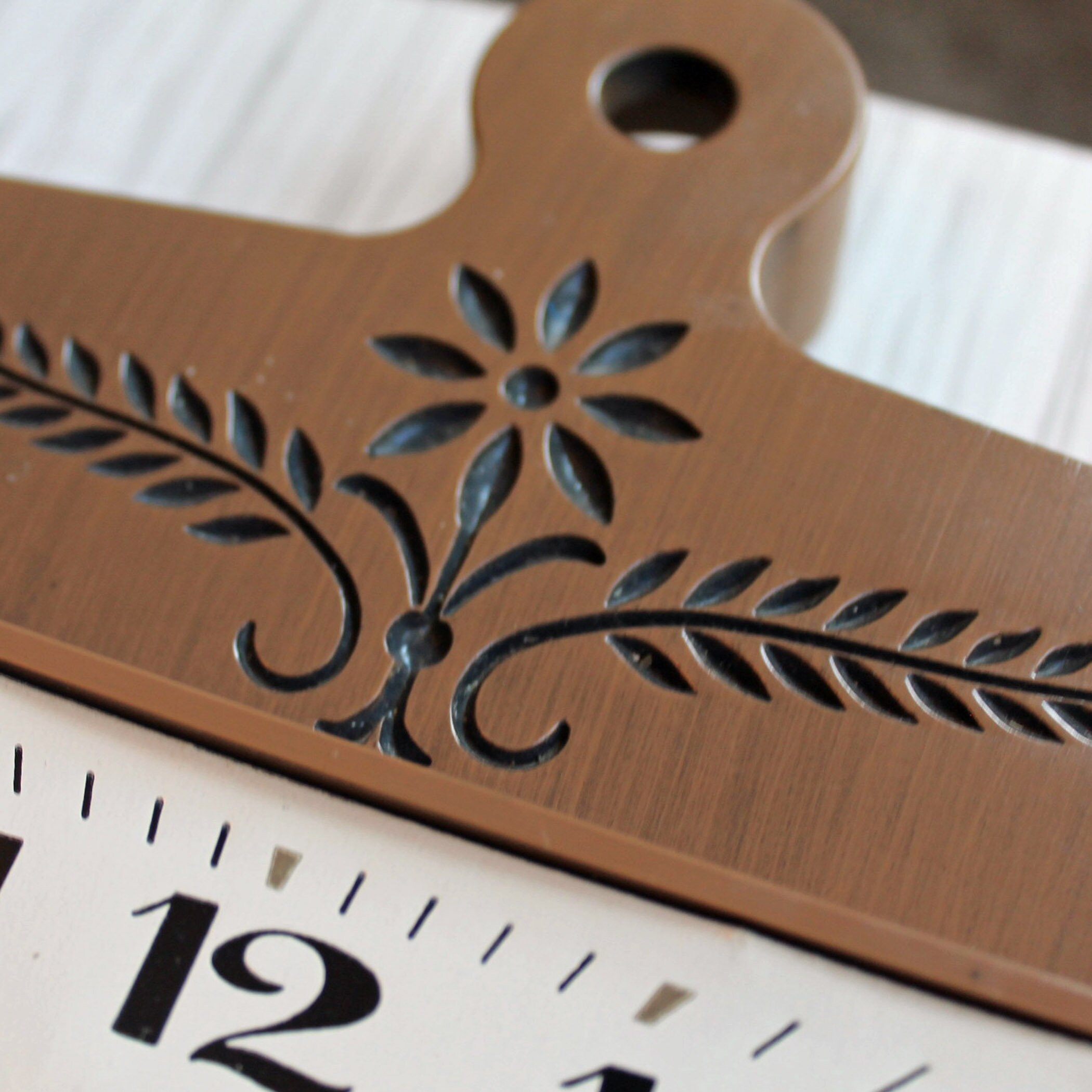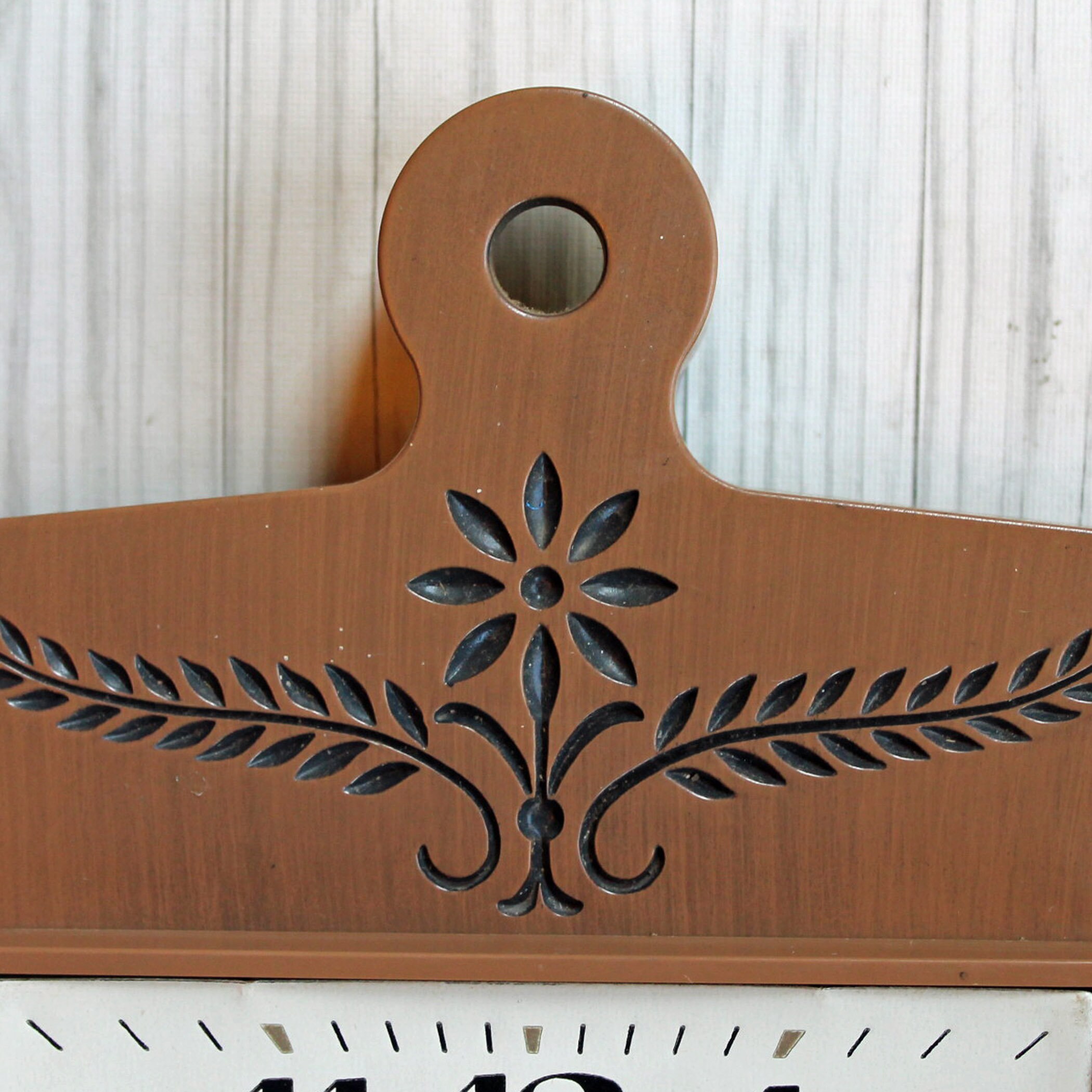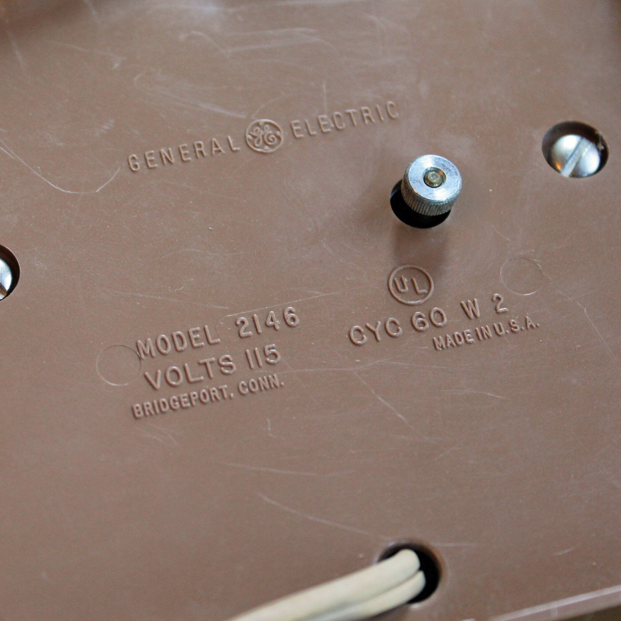 This cute wall clock is a plastic clock y General Electric, and is 7" wide and 10" tall. It is 2.25" deep. This clock has an rectangular shape with a faux wood finish. The face of the clock is a white square, with a brown leaf or flower design in the center, accened with black numbers and hands on the clock. The back of the clock is marked: GENERAL ELECTRIC / MODEL 2146 / VOLTS 115 / CYC 60 W 2 / BRDGEPORT, CONN / MADE IN USA. This is a plug-in electric clock - it is NOT batter operated. The original tan cord is atached.