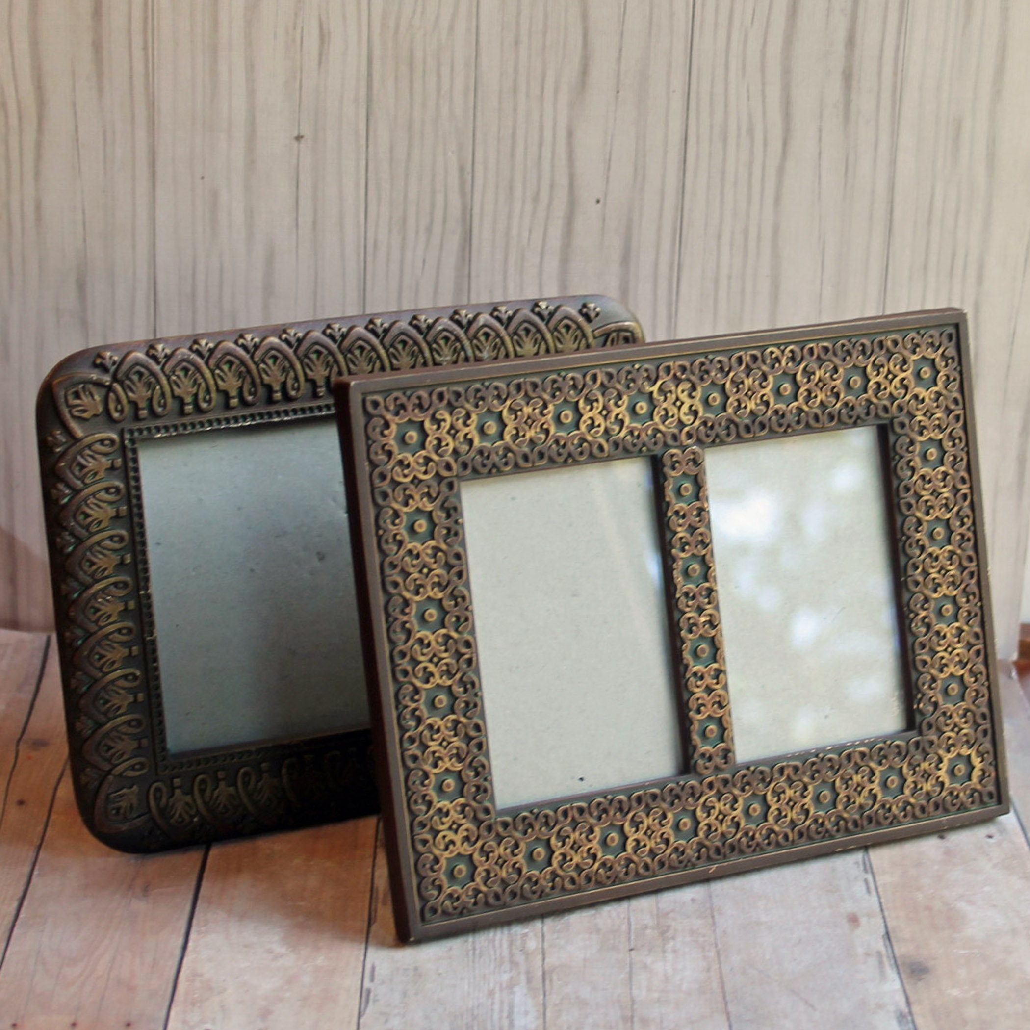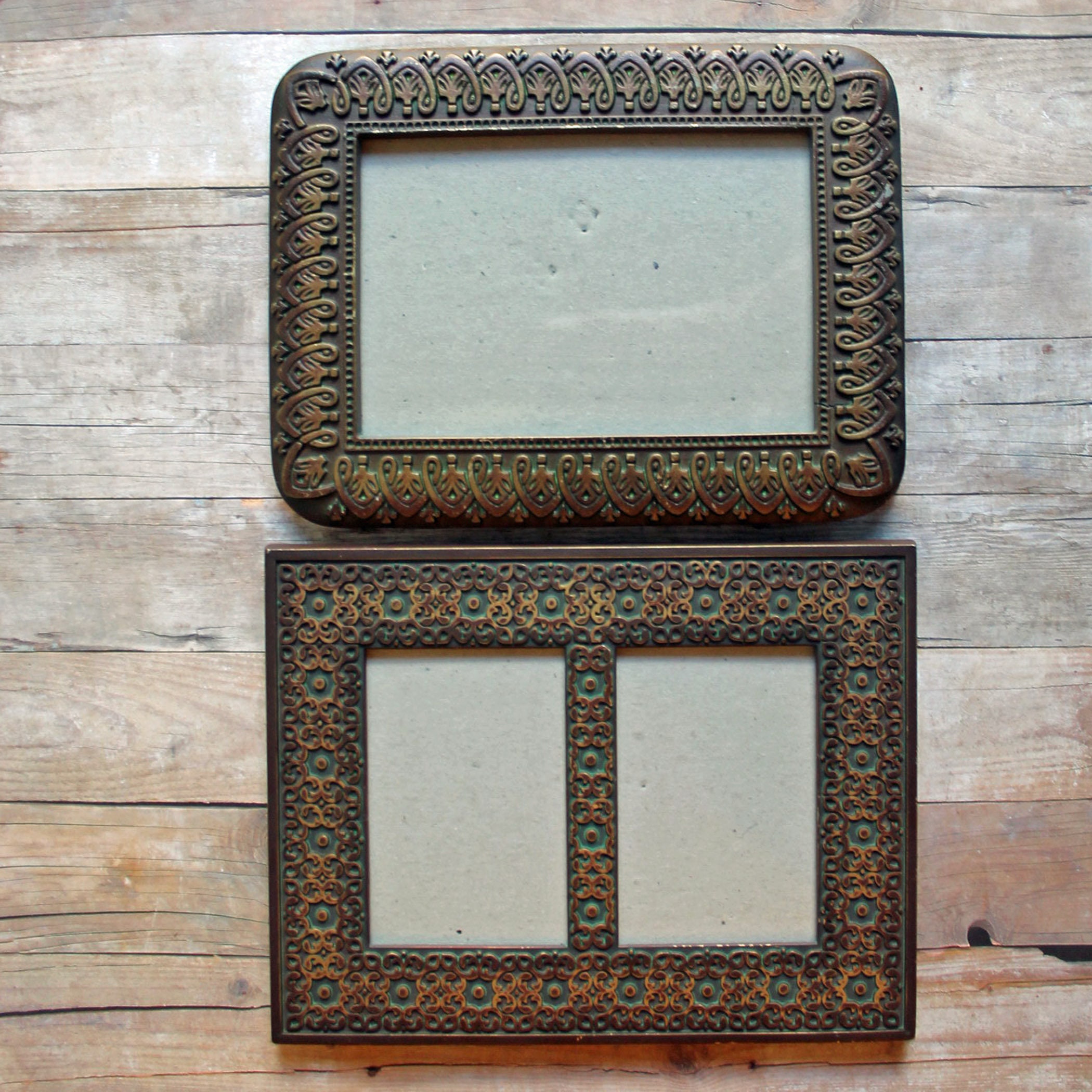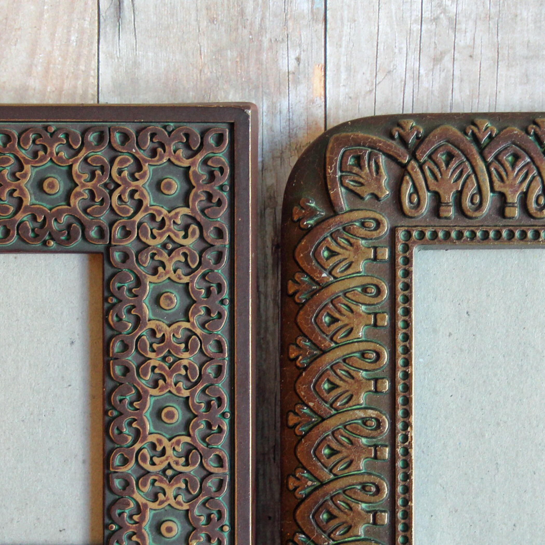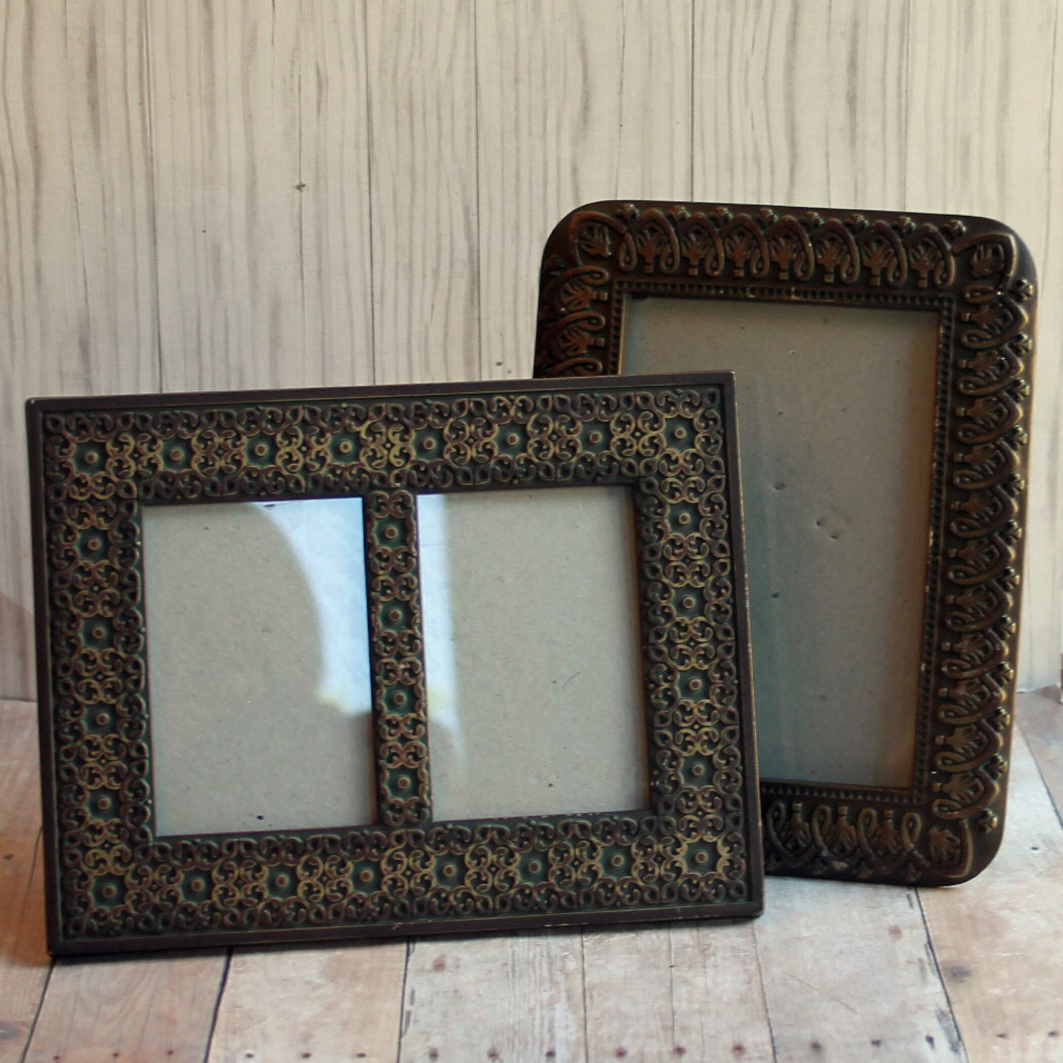 Both frames are in very nice condition, however there are some light scratches on the metal surface of the frames. One of the frames does have a small imperfection in the metal from when it was cast - it looks like a crack taht is about 1/2" long, however it does no go through the frame and the frame is still very solid and intact. Lovely set of metal frames with great patterns and designs!