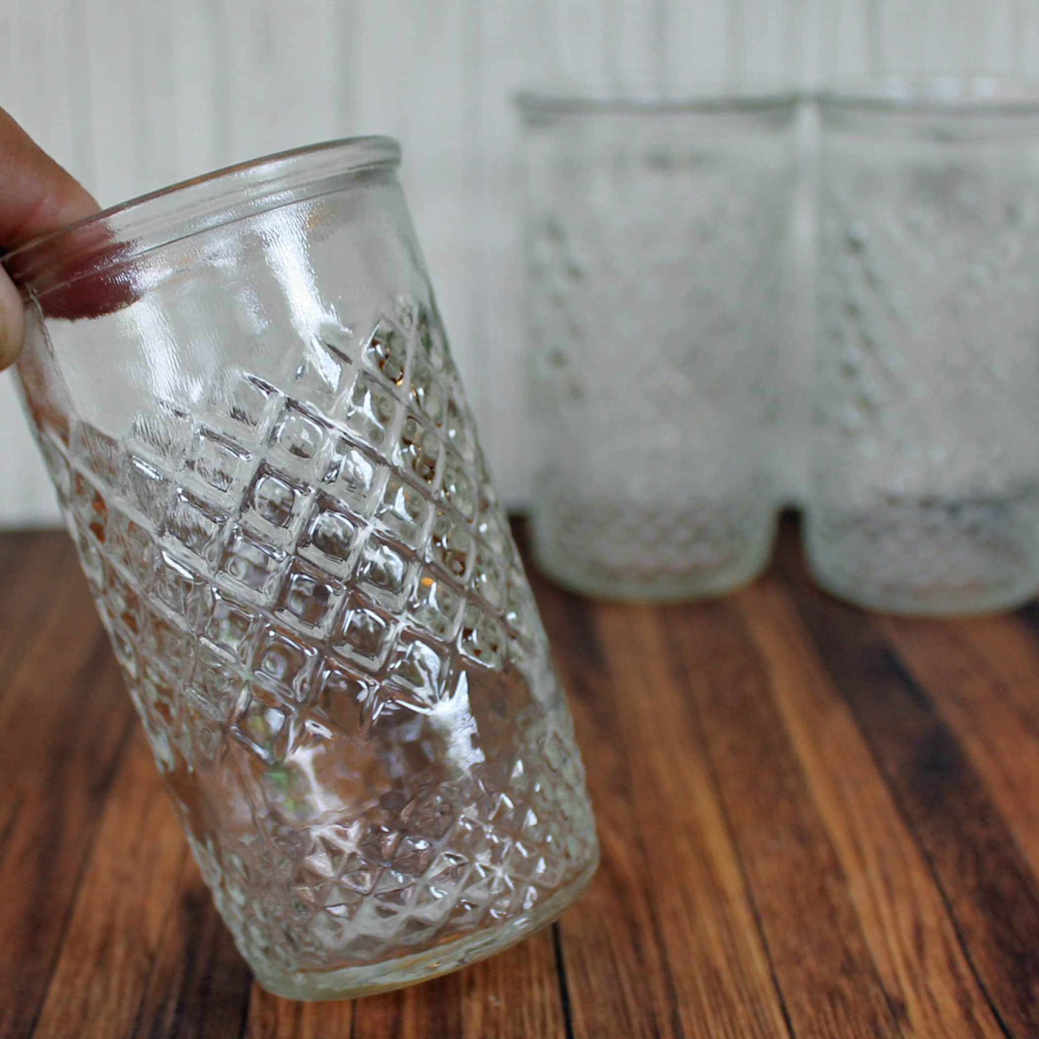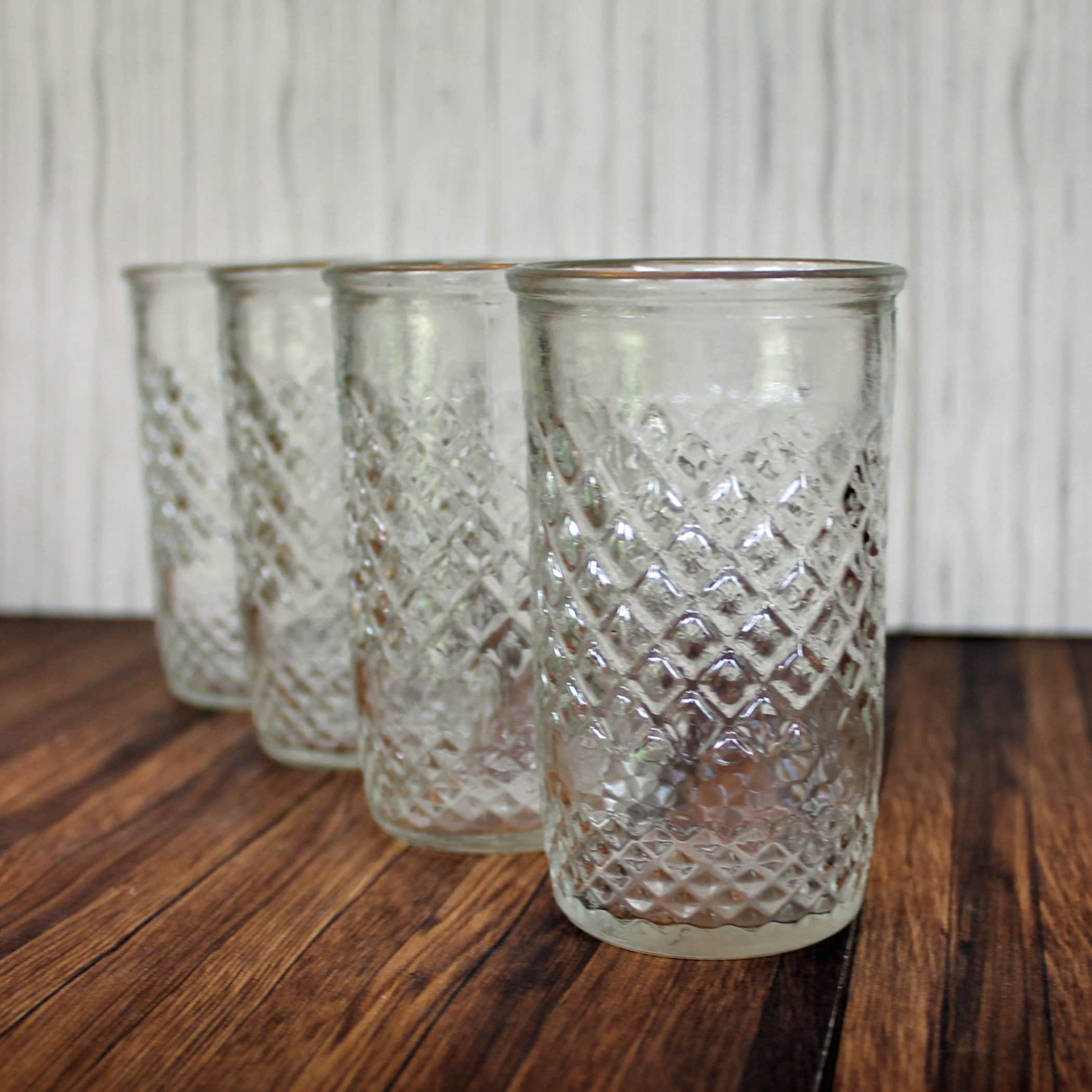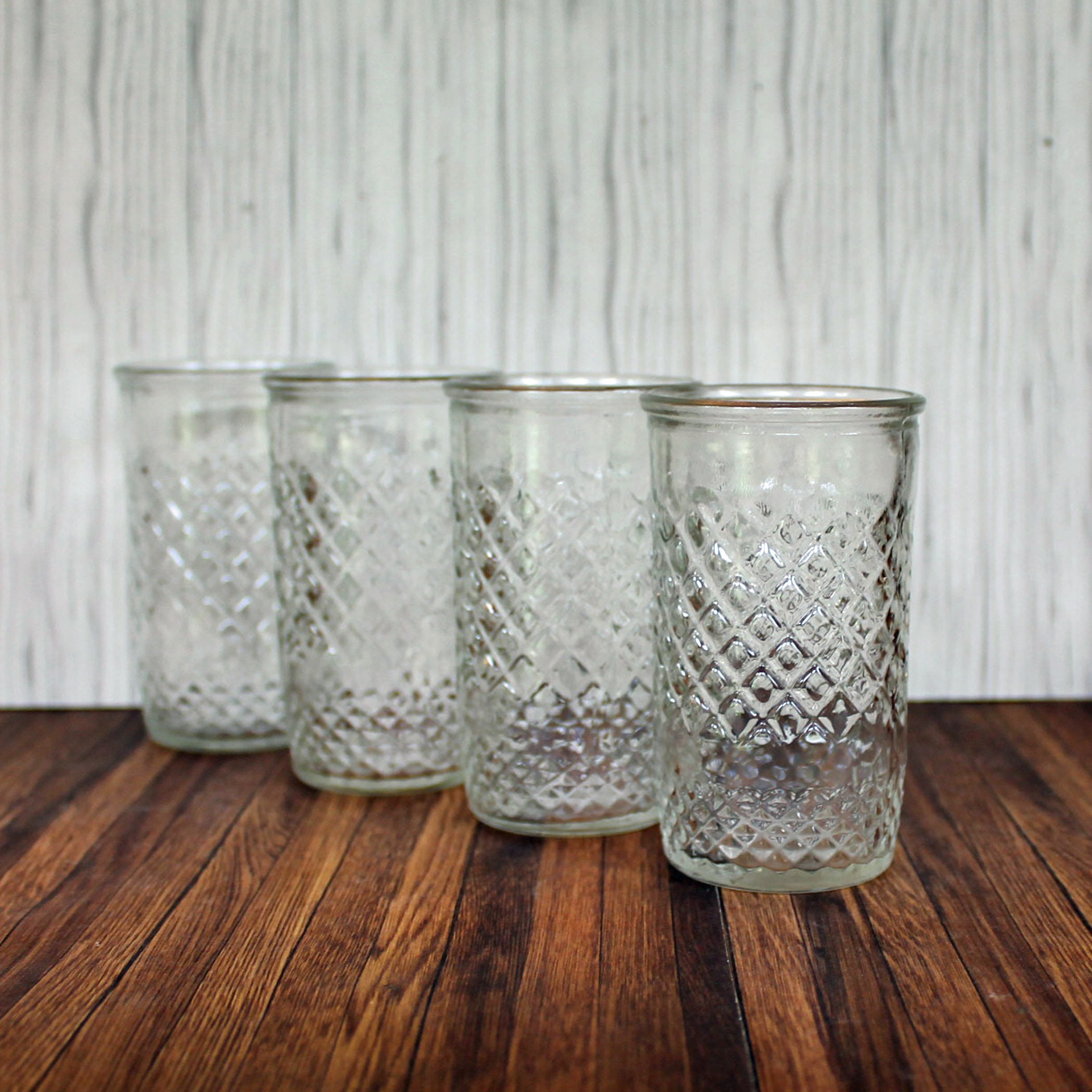 This set of 4 juice glasses are a clear glass and feature a diamond pattern around each cup. These glasses have a jelly jar style with a banded rim around the top, and the simple diamond design around the glass - they are very reminiscent of a Wexford style glass. They each measure 3.75" tall and 2.25" in diameter. Each glass can hold 6 oz.