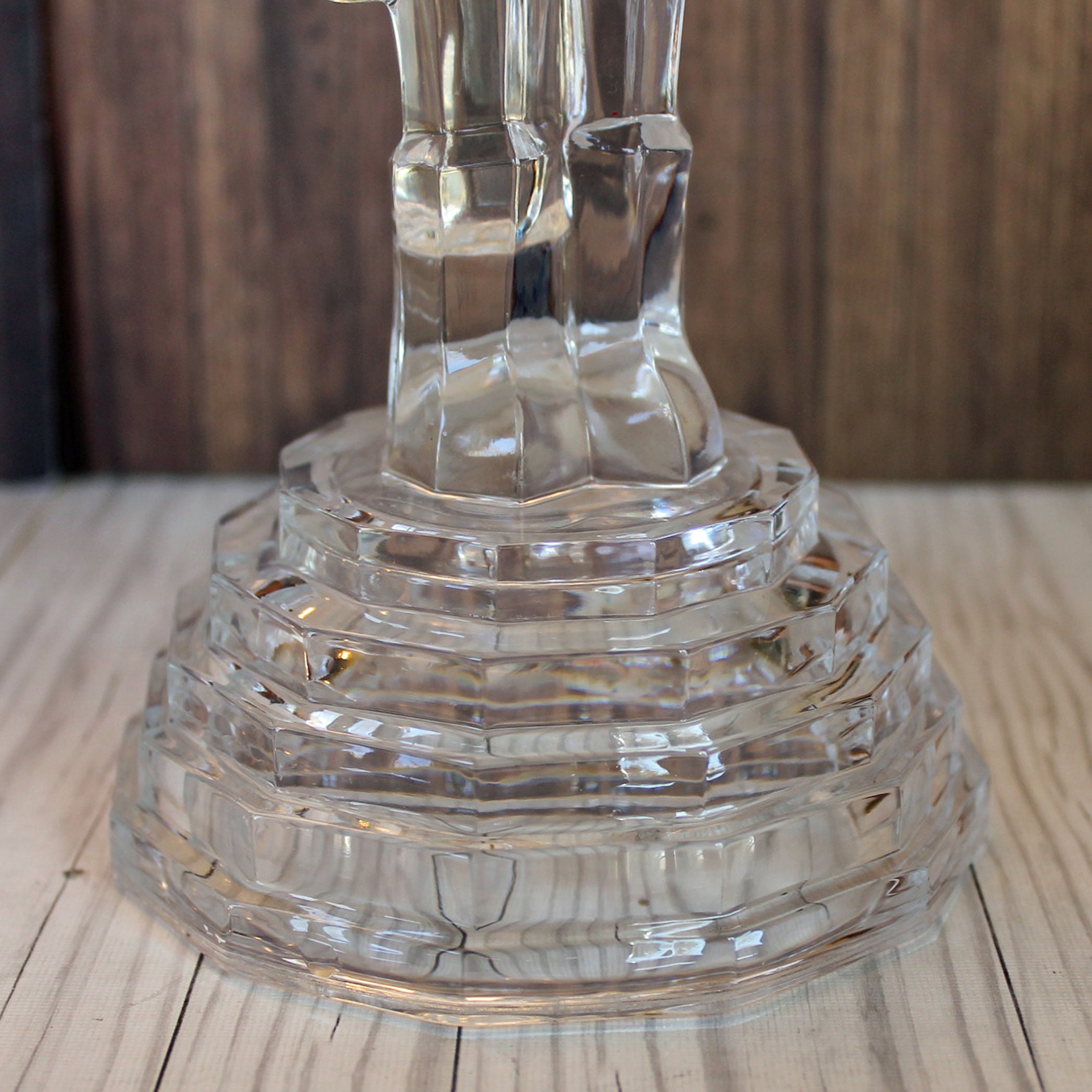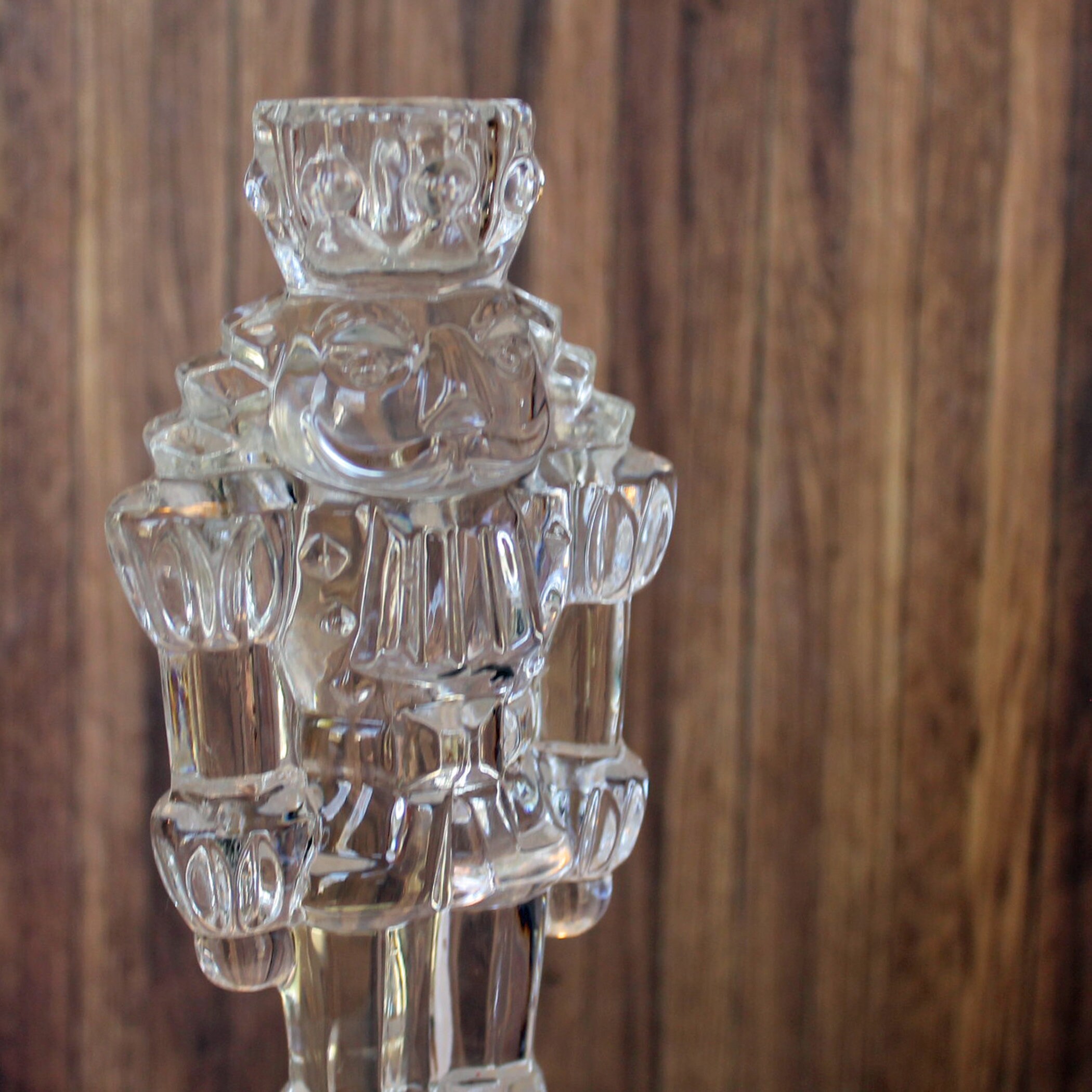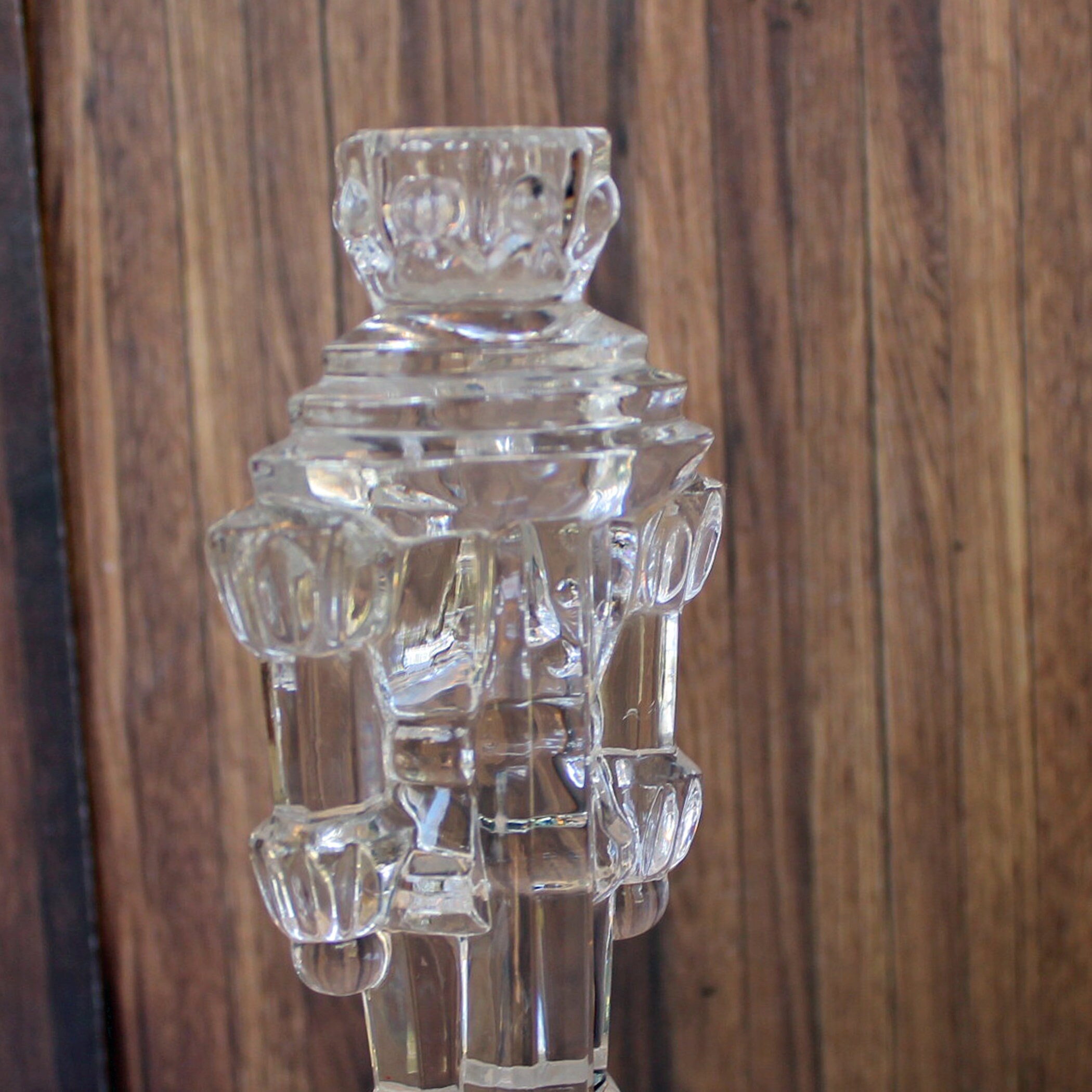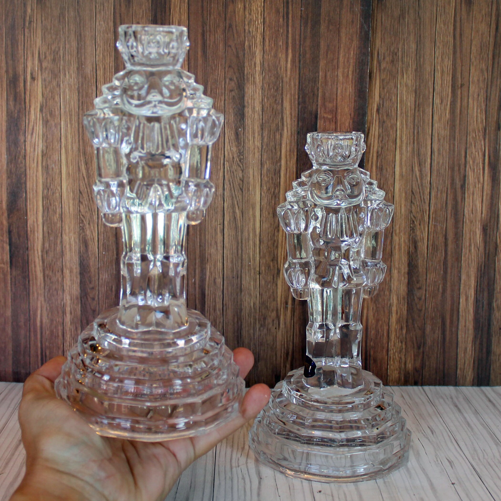 This set of 2 crystal candlesticks includes 2 crystal candlesticks with an elegant nutcracker design. Each candlestick is 8.25" tall and 4" in diameter at the base. They are quite heavy and substantial pieces, each weighting 1.5 pounds each. They are nicely accented with details on the nutcracker's uniform, face, and crown. One of the candlesticks has an original label on the bottom that reads: 24% Lead Crystal / PRINCESS HOSUE / USA / CRISTAL AU PLOMB.