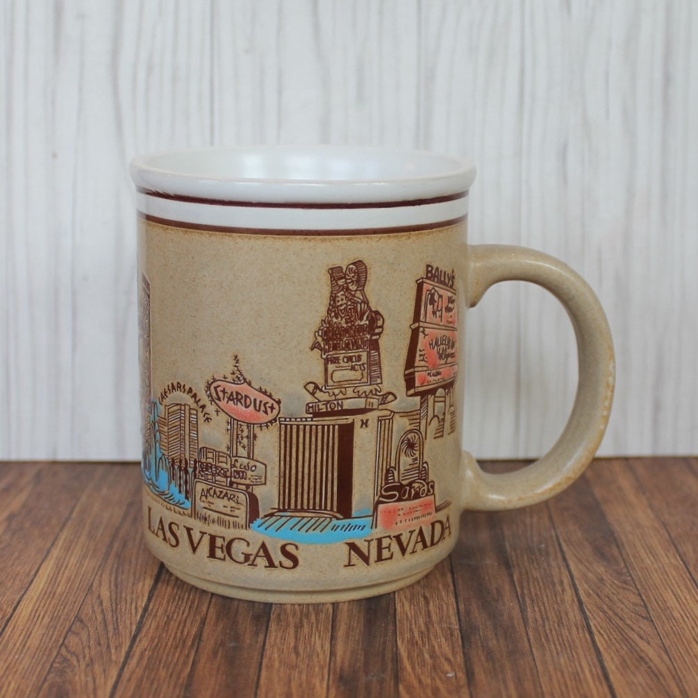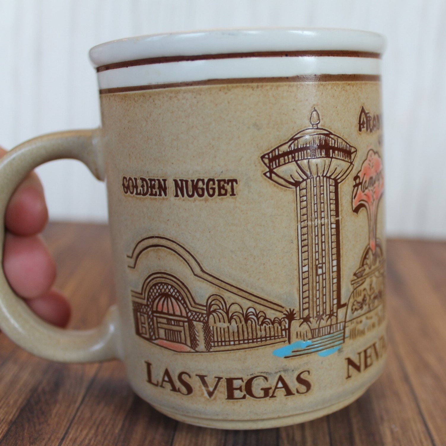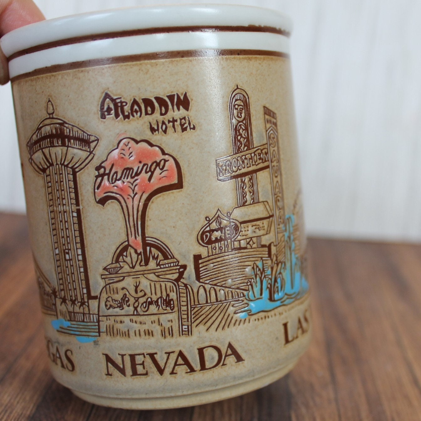 This cool vintage Las Vegas souvenir mug is 3.75" tall and 3" in diameter. It is a tan ceramic piece and the mug depicts the Las Vegas strip, with various hotels and attractions. The mug includes the Golden Nugget, Aladdin Hotel, Flamingo, Caesars Palace, Stardust, Circus Circus and Ballys. The bottom of the mug reads: LAS VEGAS NEVADA. The mug can hold 8 oz.
