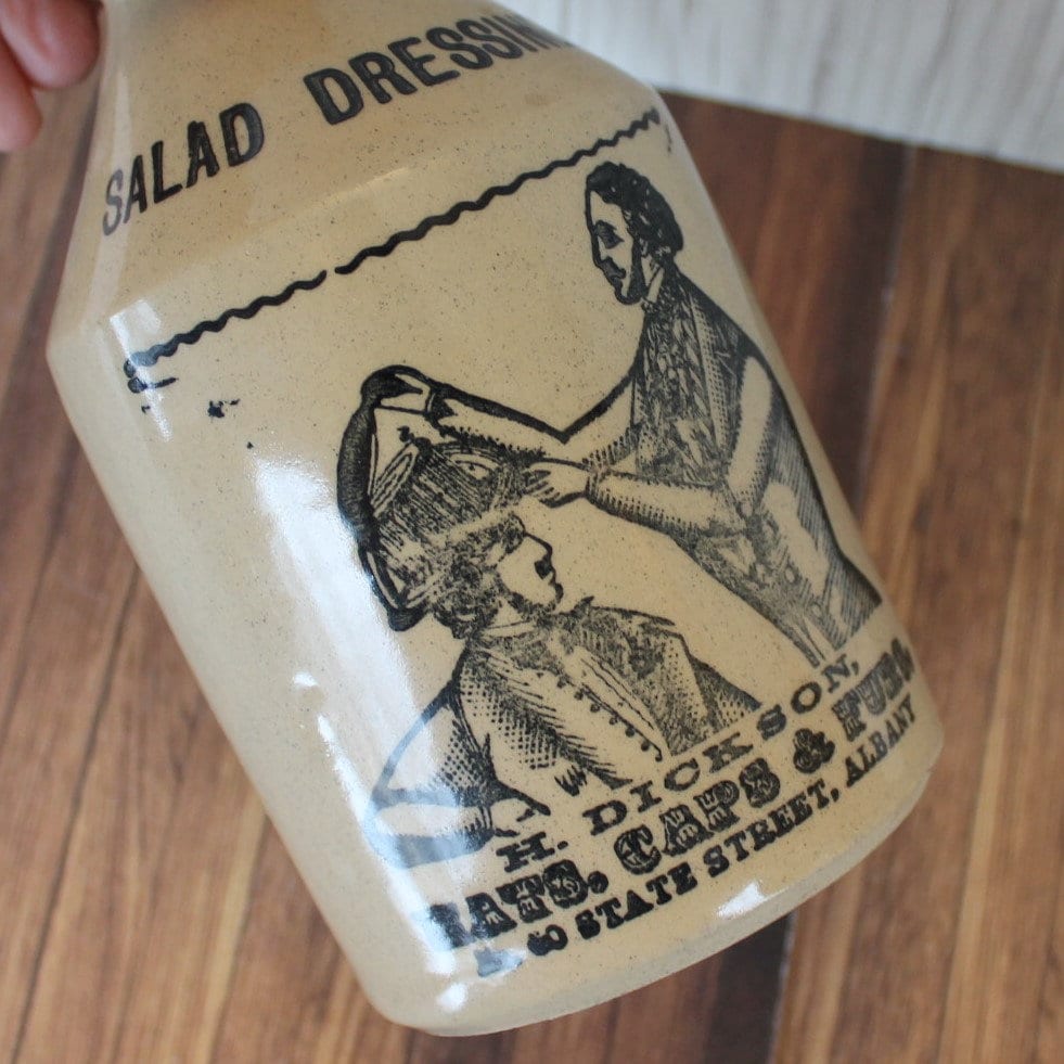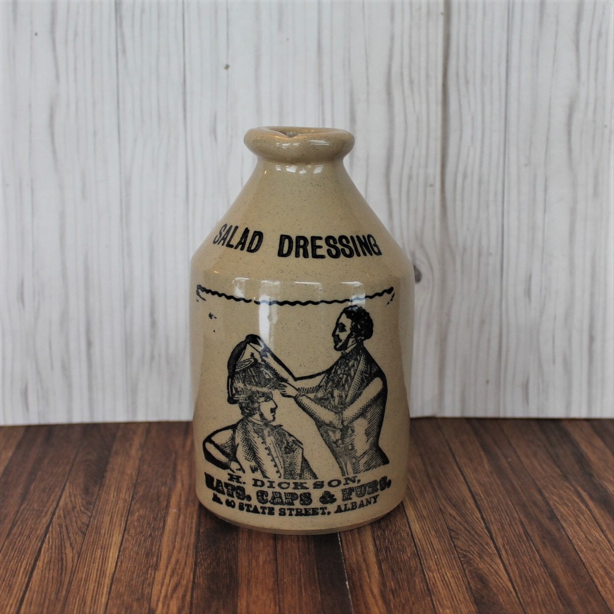 This small stoneware bottle is 5.75" tall and 3.5" in diameter. It is a gray stoneware bottle and has an open top with a pour spout on one side. The front of the bottle is decorated with a scene of 2 men trying on hats, and reads: H. DICKSON / HATS, CAPS & FURS / 60 STATE STREET, ALBANY. The bottom of the bottle is stamped: MADE IN ENGLAND.
