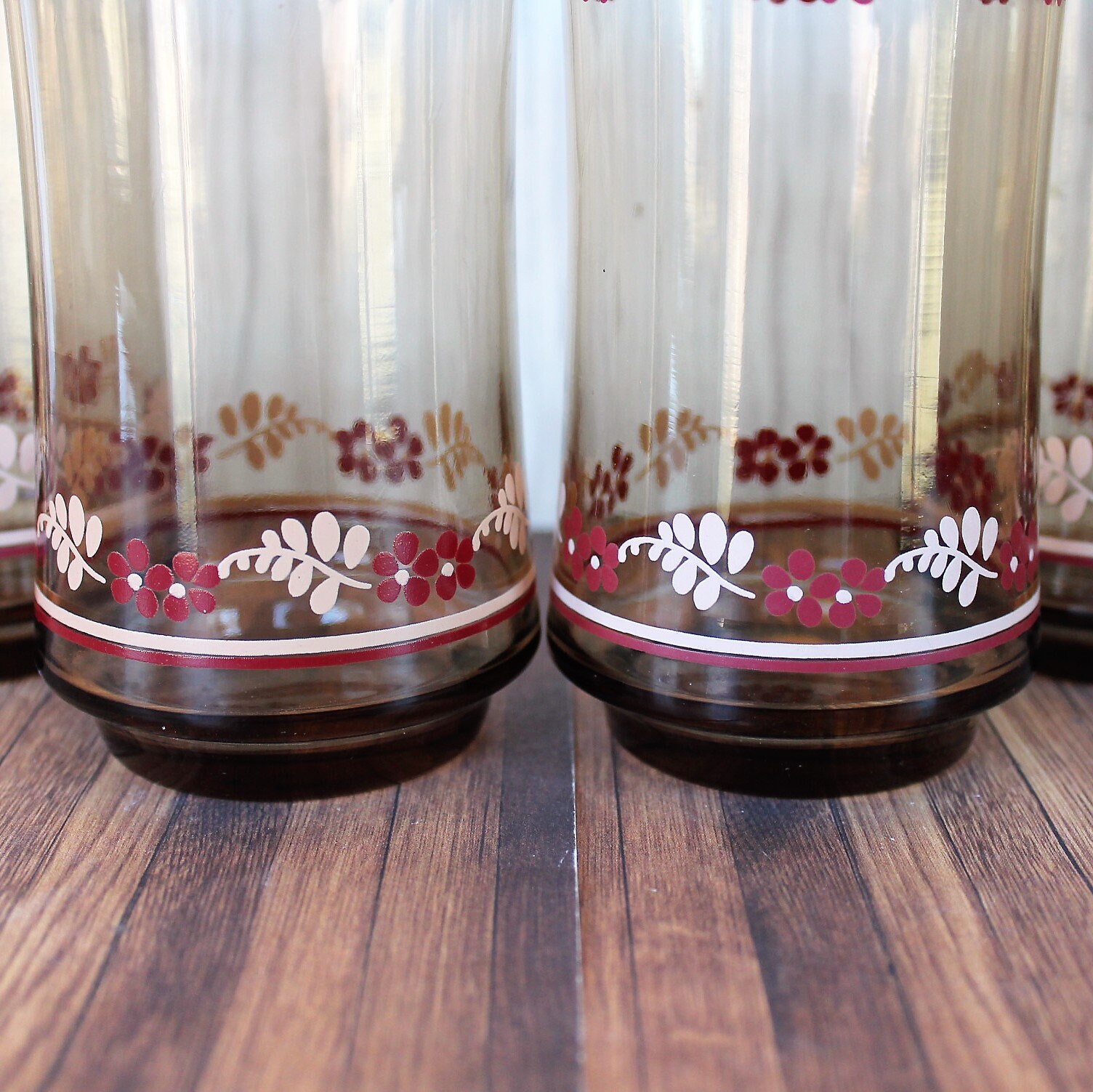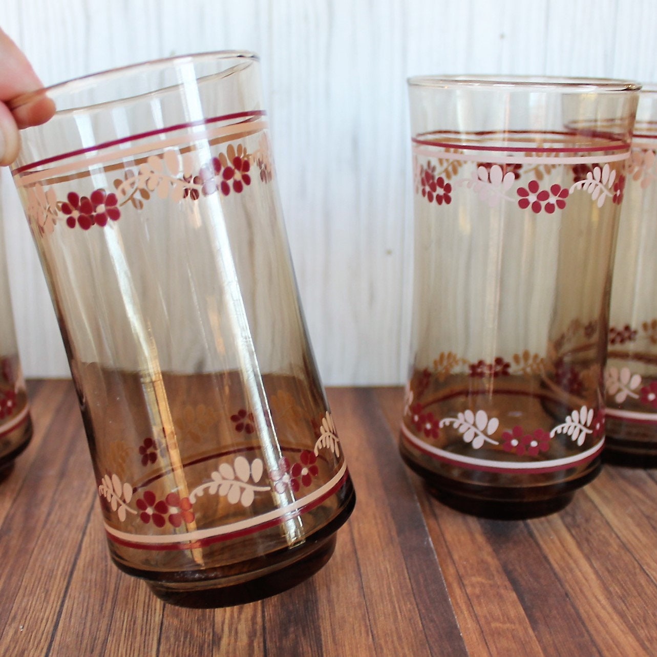 This set of 6 tumblers by Libbey Glass are 5.25" tall and 2.75" in diameter. They are a smoky brown glass and have a beige and red flower and leaf pattern around the rim and base of glass. The glasses also have two thim bands around the top and bottom - one band is tan and the other is red. The glasses have the Libbly "L" logo on the bottom. These glasses can comfortably hold 10 oz with about 1" of room at the top - with 14 oz. it is filled to the rim.