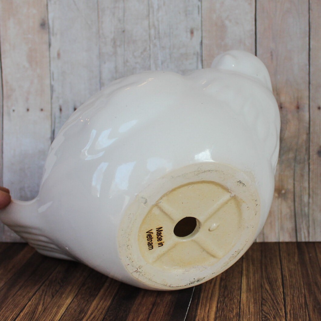 This white ceramic bird shaped planter is a nice size, measuring 9" long, 6" wide, and 5" tall at the highest point (the tail). It is a white ceramic piece with a large teardrop shaped opening on the top. The planter is nicelt detailed with subtle accented on the wings, chest, tail, and head. The bird has it's head turned to one side. The bottom of the planter is marked: MADE IN VIETNAM. There is a drainage hole in the bottom.