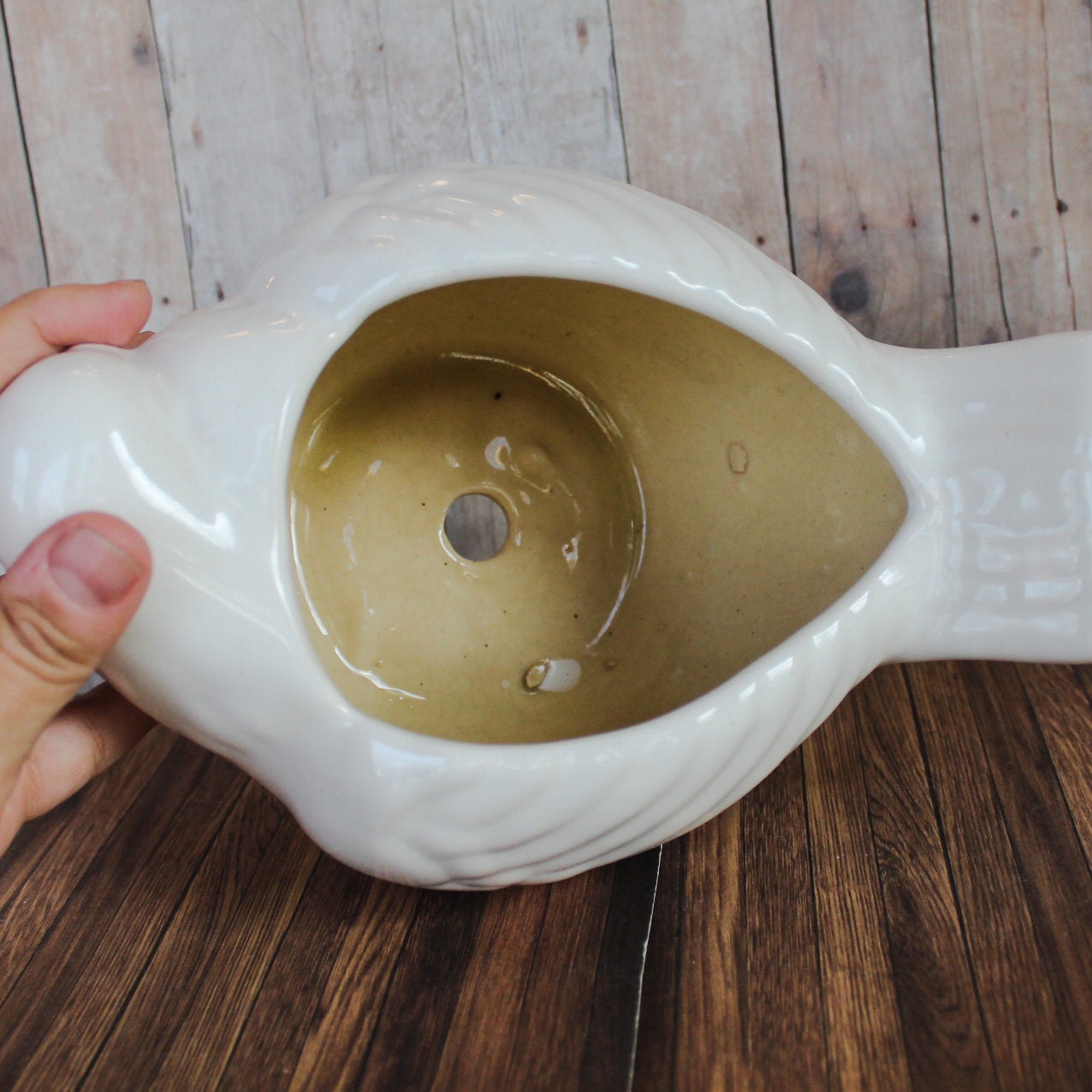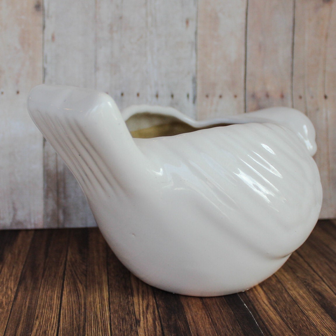 The planter is in very good condition with no chips or cracks, and no crazing. There are a few chunky remnants of ceramic stuck to the inside of the planter and glazed over. Great white bird planter with a sleek and modern design!