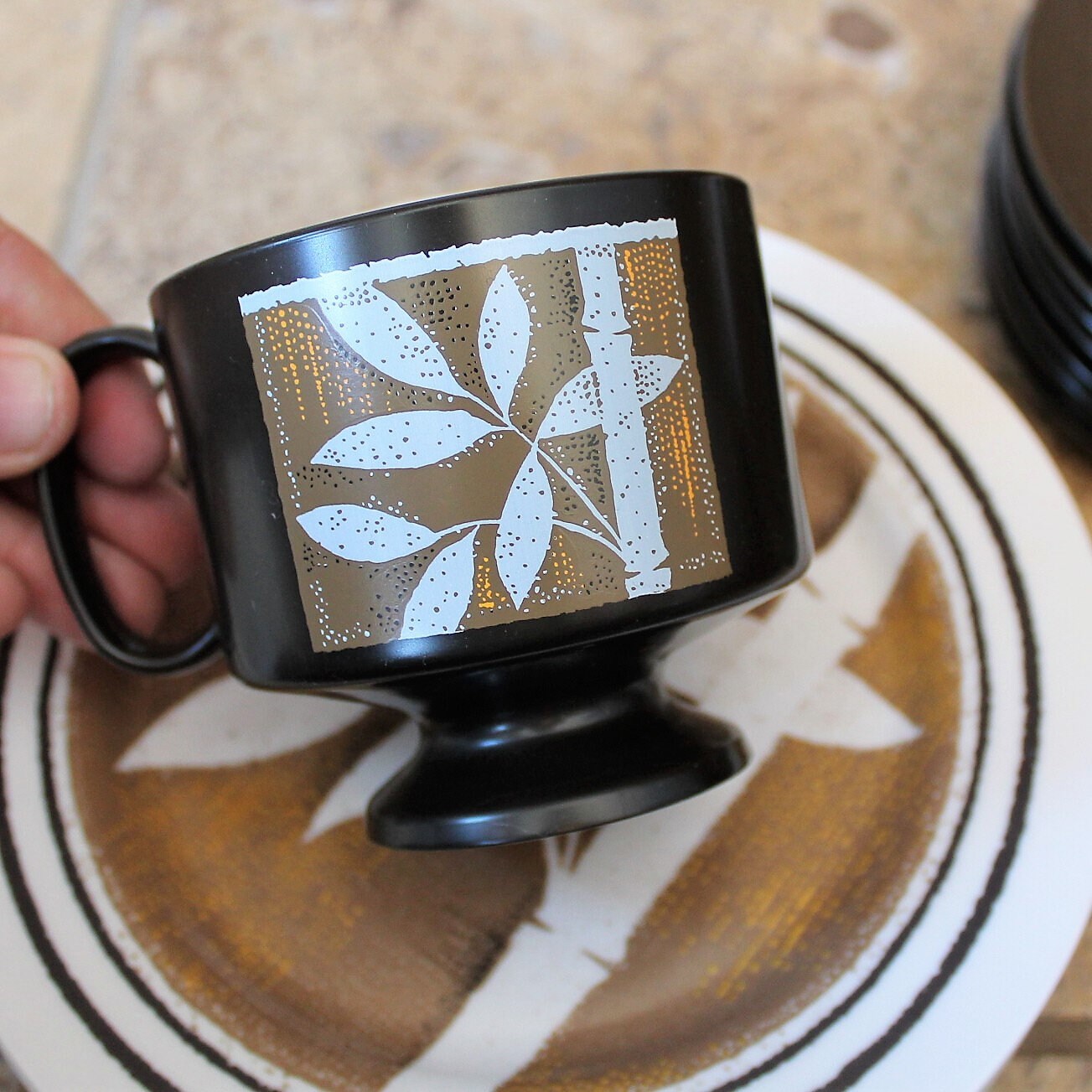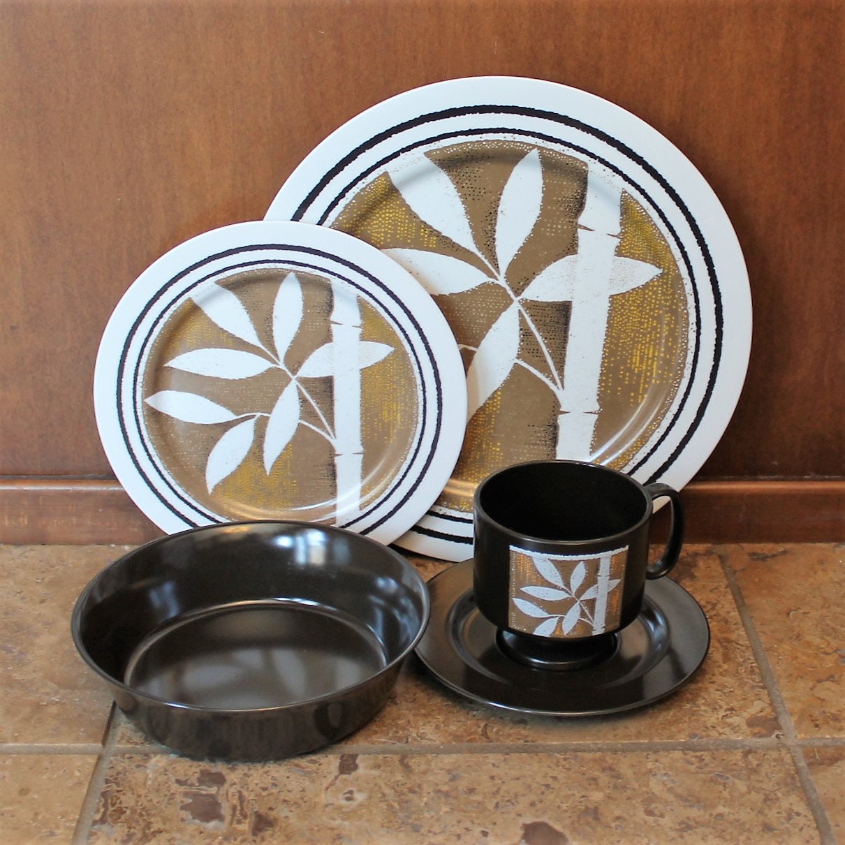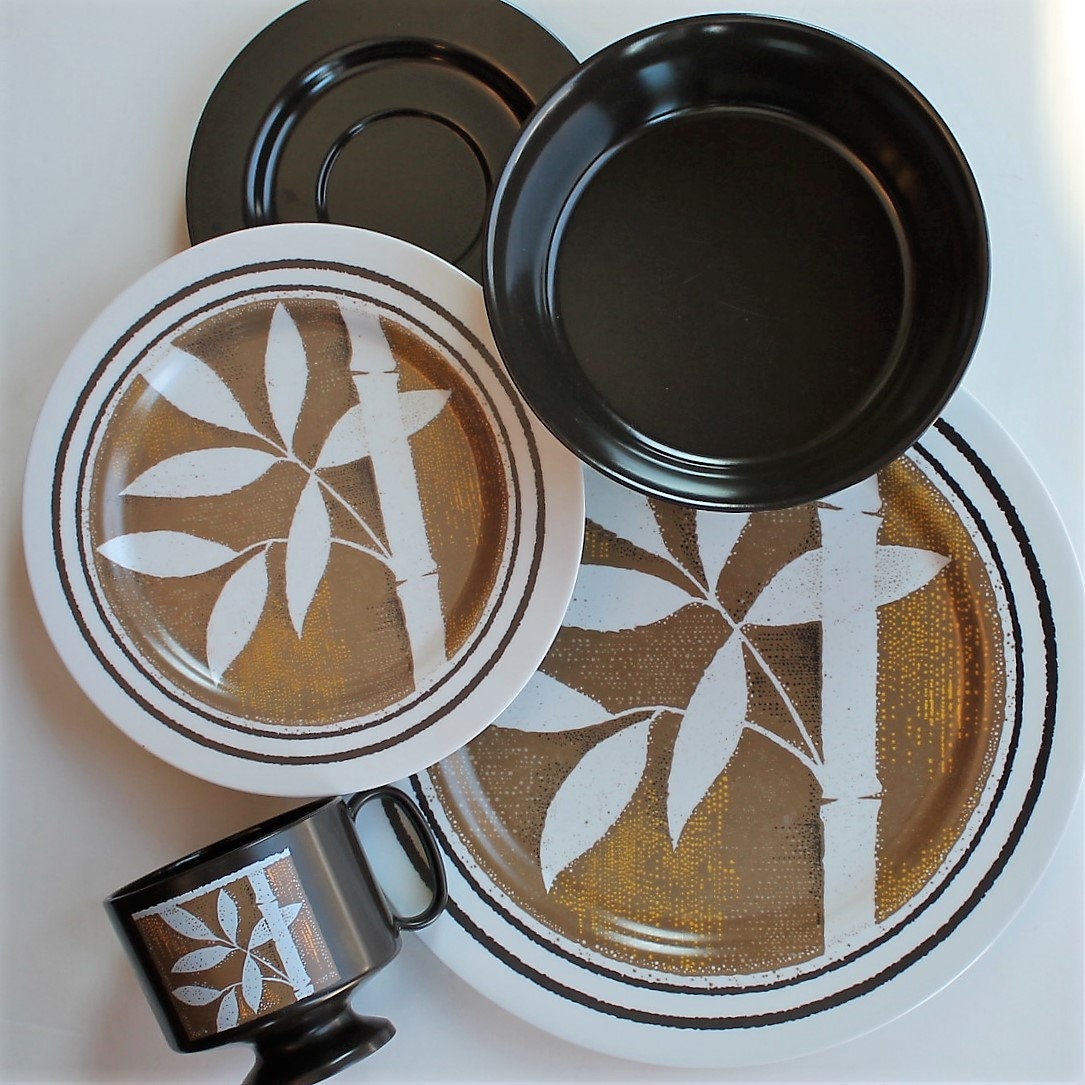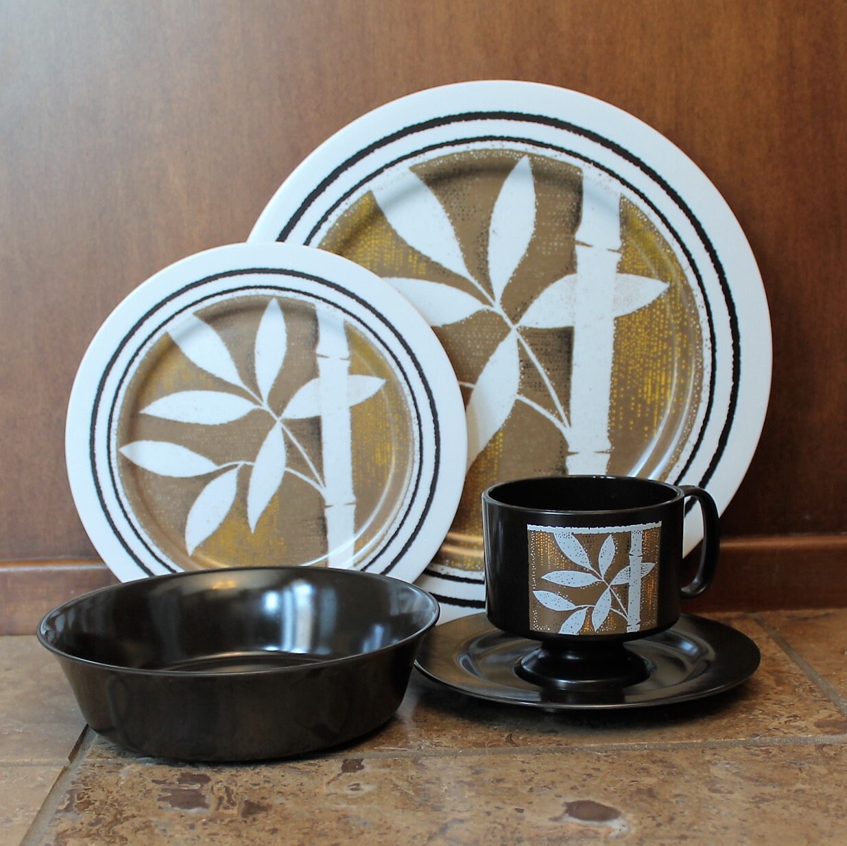 This great melamine dish set by Oneida has a white, tan and brown design of a bamboo stalk and leaves. This large set includes 44 pieces and is a full service for 8, and includes several serving pieces. Included are: