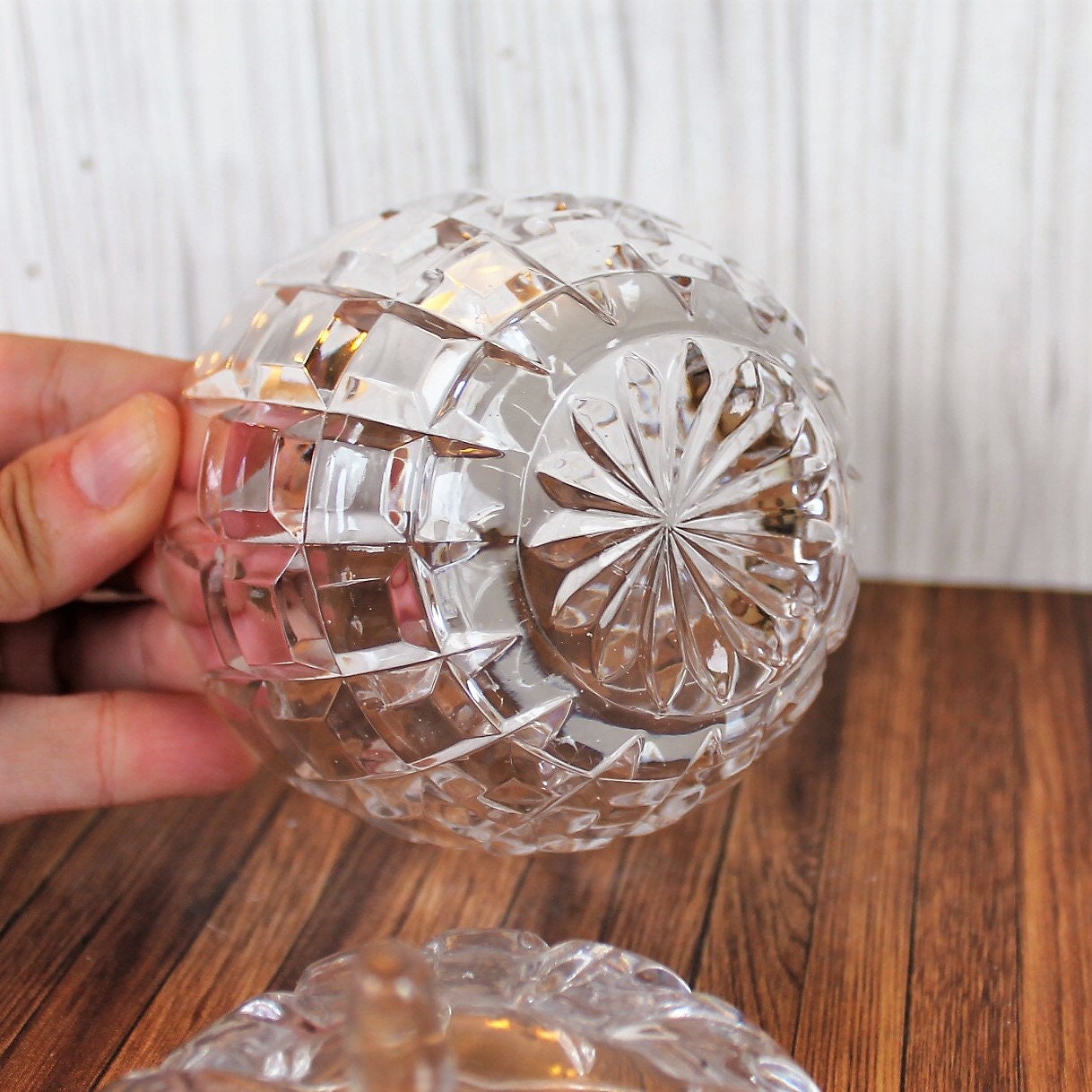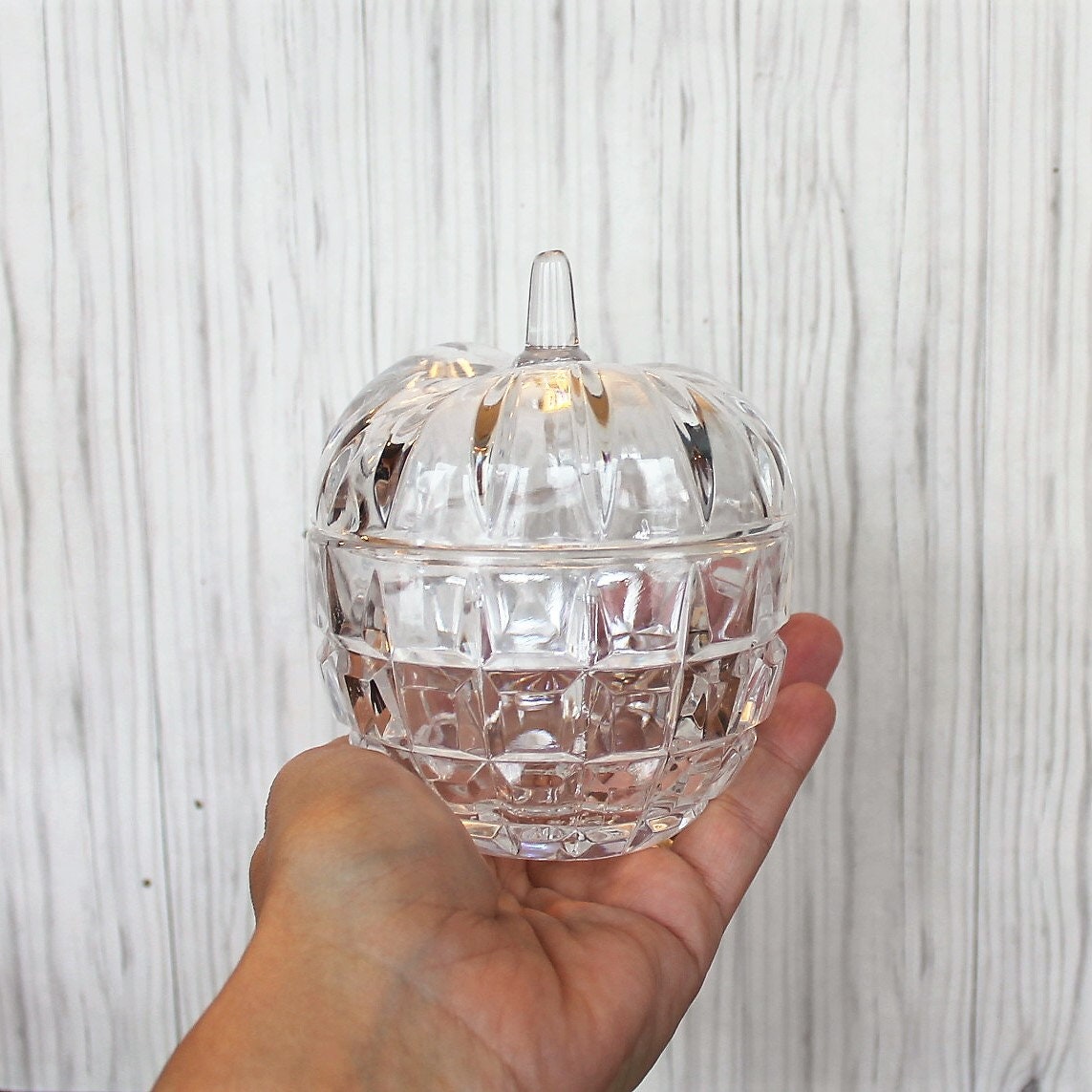 This pretty glass sugar bowl is shaped like an apple and includes the bowl and lid. The dish is 4.5" tall with the lid, and 3.75" in diameter at the widest point. The dish is accented with a deep square or cross hatch pattern. This dish is a thicker glass piece and is a heavier piece weighing almost 1 pound itself. The lid has one square notched opening for a spoon handle to rest. There is no spoon included.