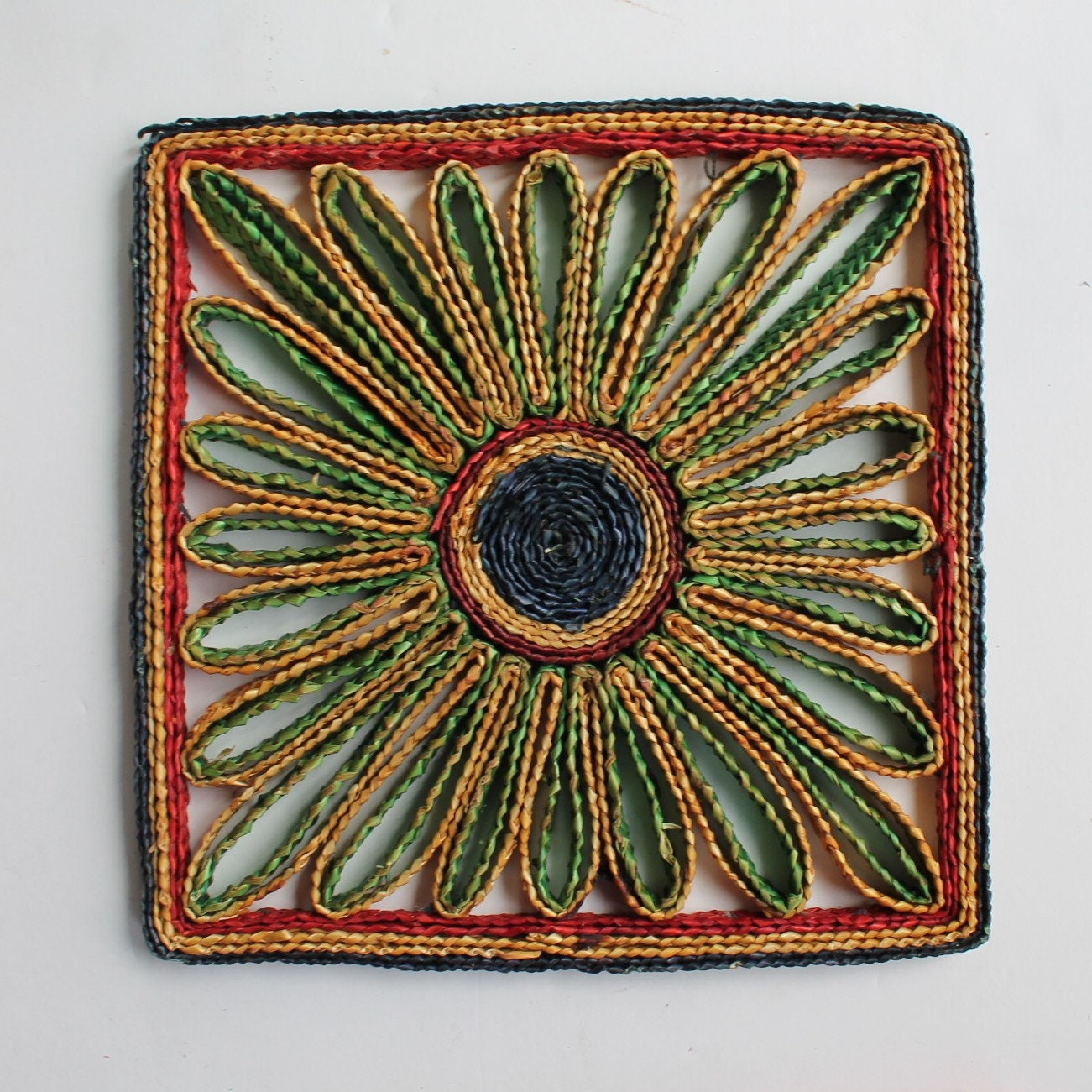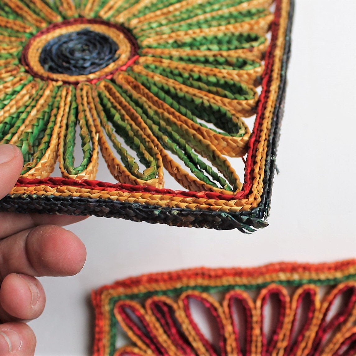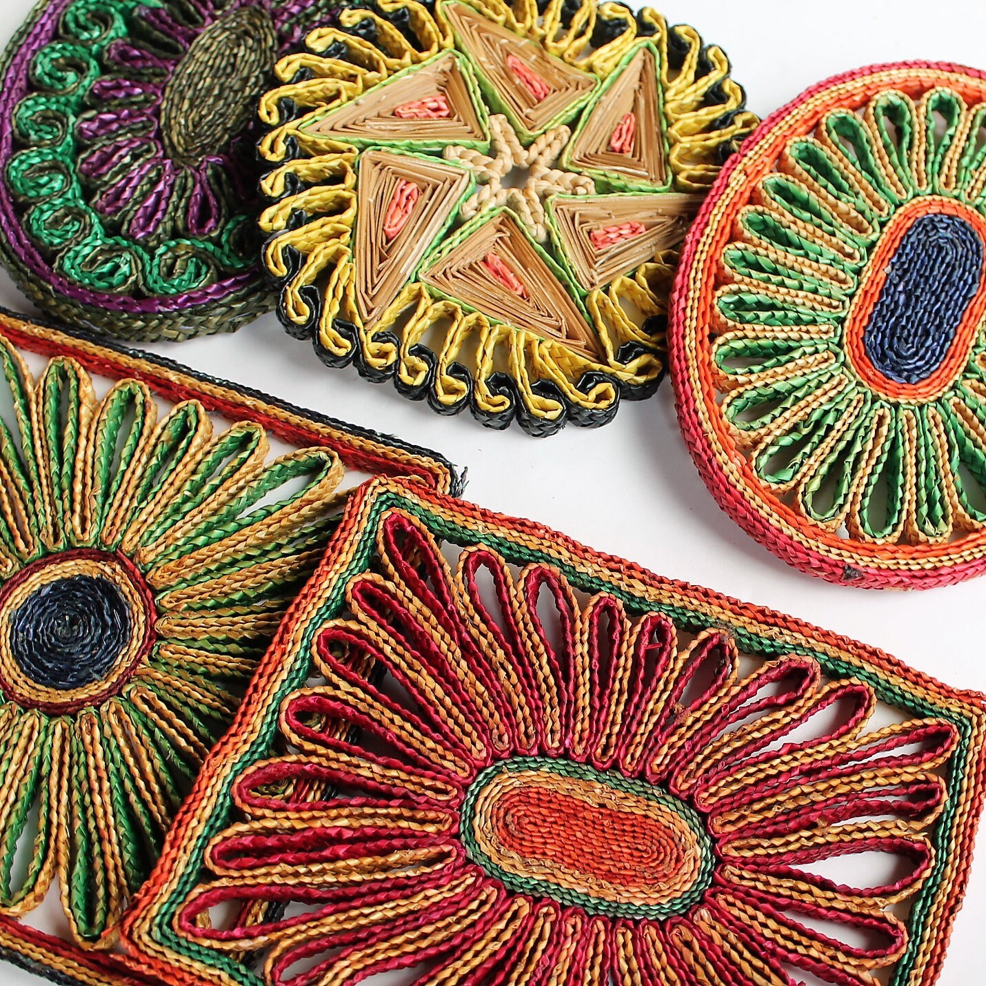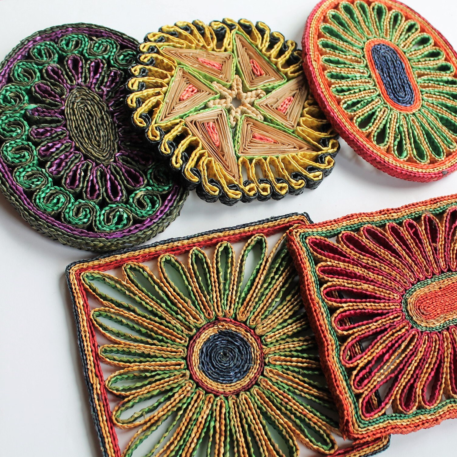This set of 5 woven wicker trivets includes one square shaped, one rectangle, and and 3 round/oval shaped trivets. The square trivet is 7" square, and the rectangle trivet is 6" x 8". The round trivets are all between 7-8" in diameter. They all have bright colored tones of tan, green, red, purple, and yellow. The patterns coordinate together nicely would make a fun wall arrangement or use under your planters.