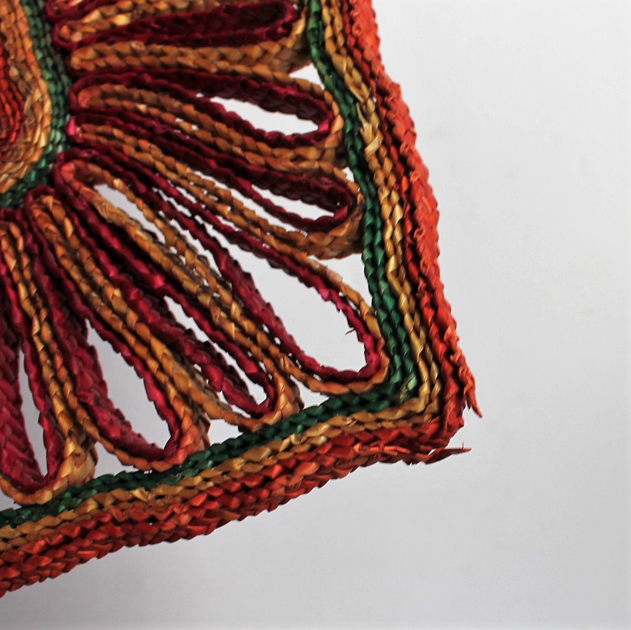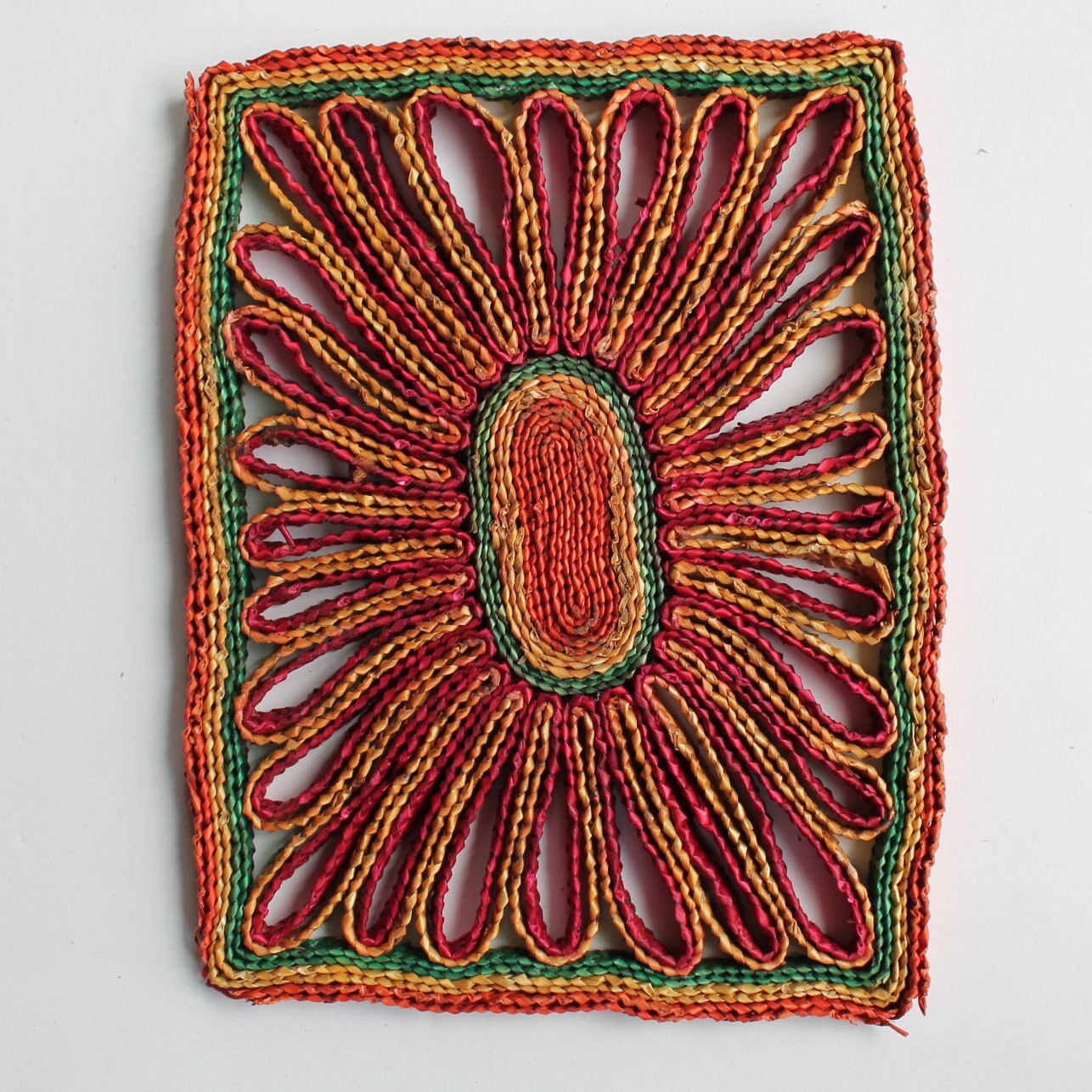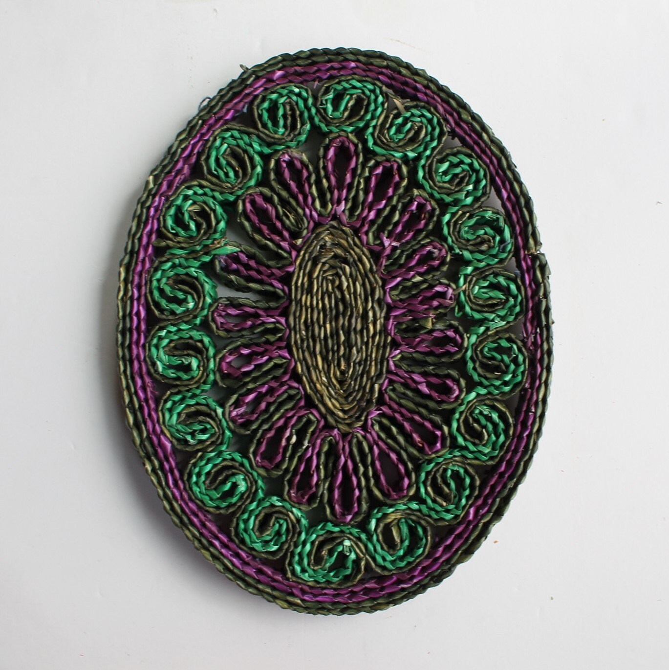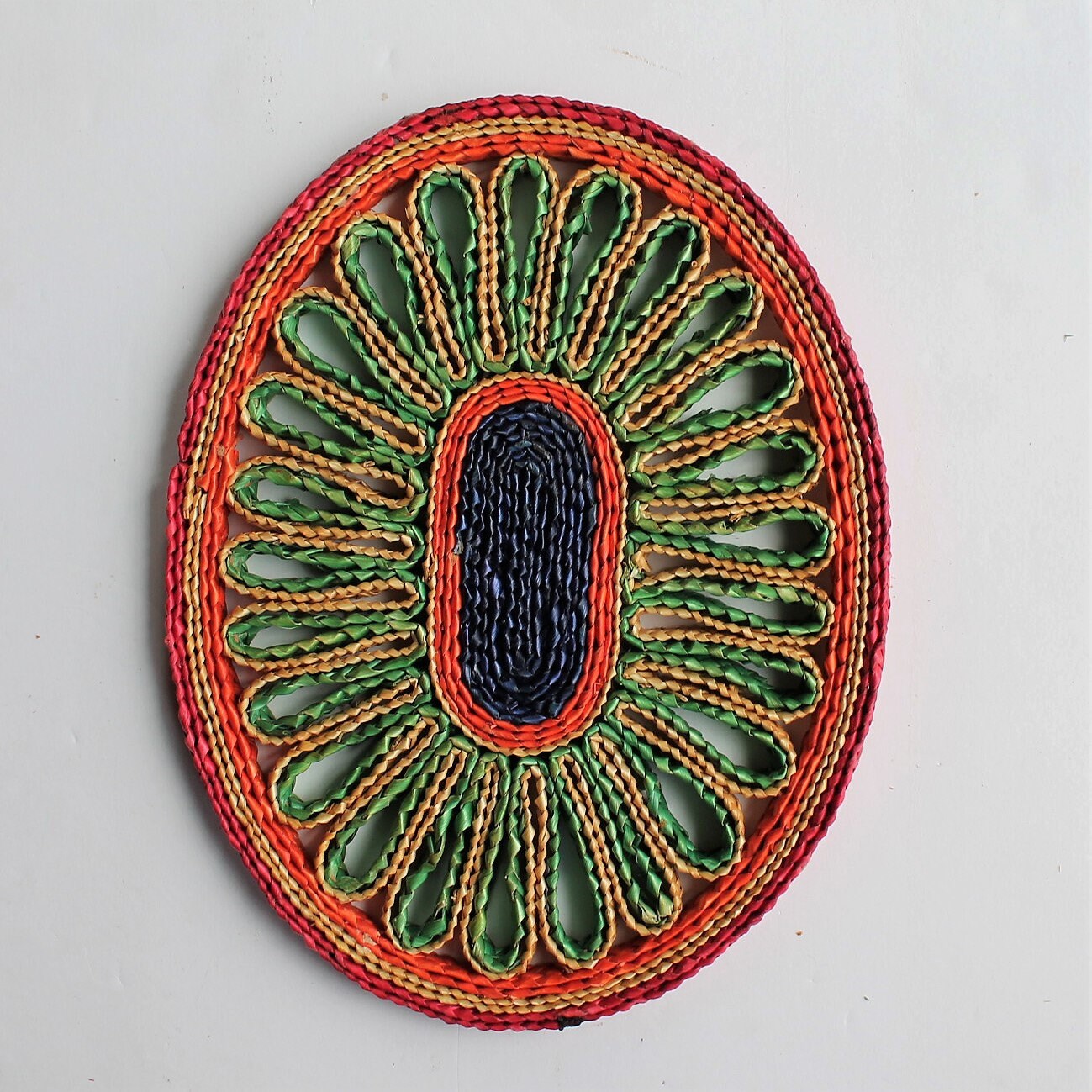 This set of 5 woven wicker trivets includes one square shaped, one rectangle, and and 3 round/oval shaped trivets. The square trivet is 7" square, and the rectangle trivet is 6" x 8". The round trivets are all between 7-8" in diameter. They all have bright colored tones of tan, green, red, purple, and yellow. The patterns coordinate together nicely would make a fun wall arrangement or use under your planters.
