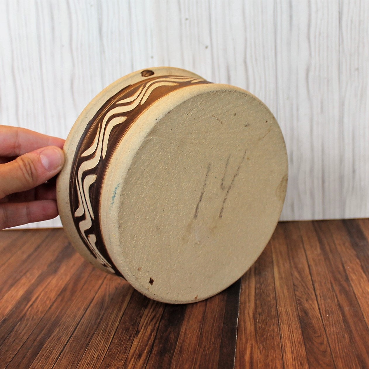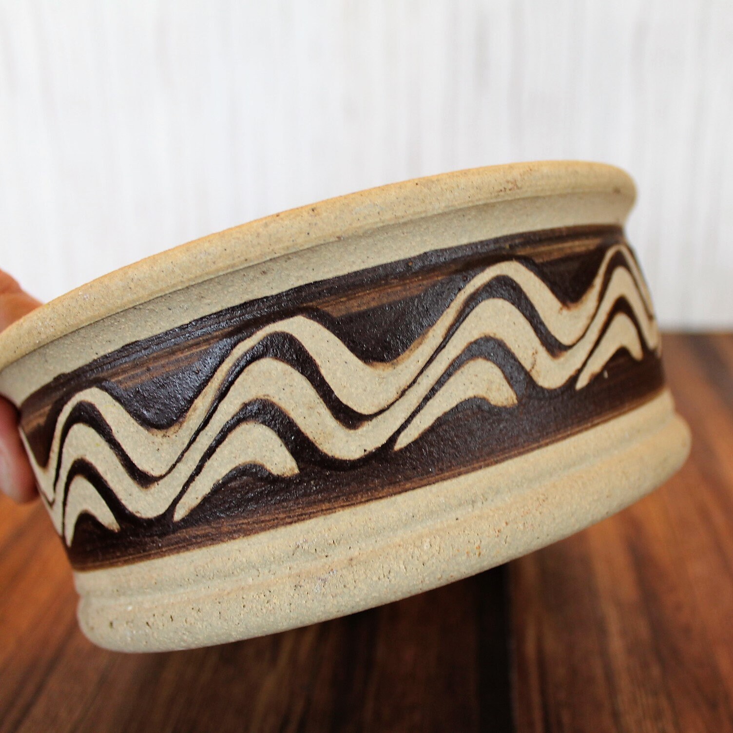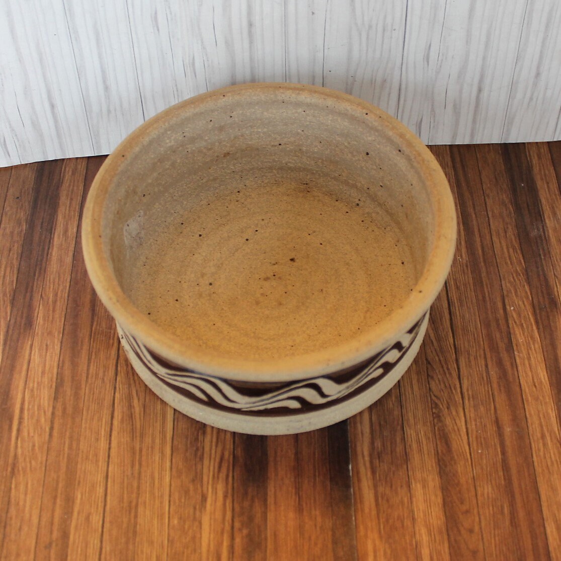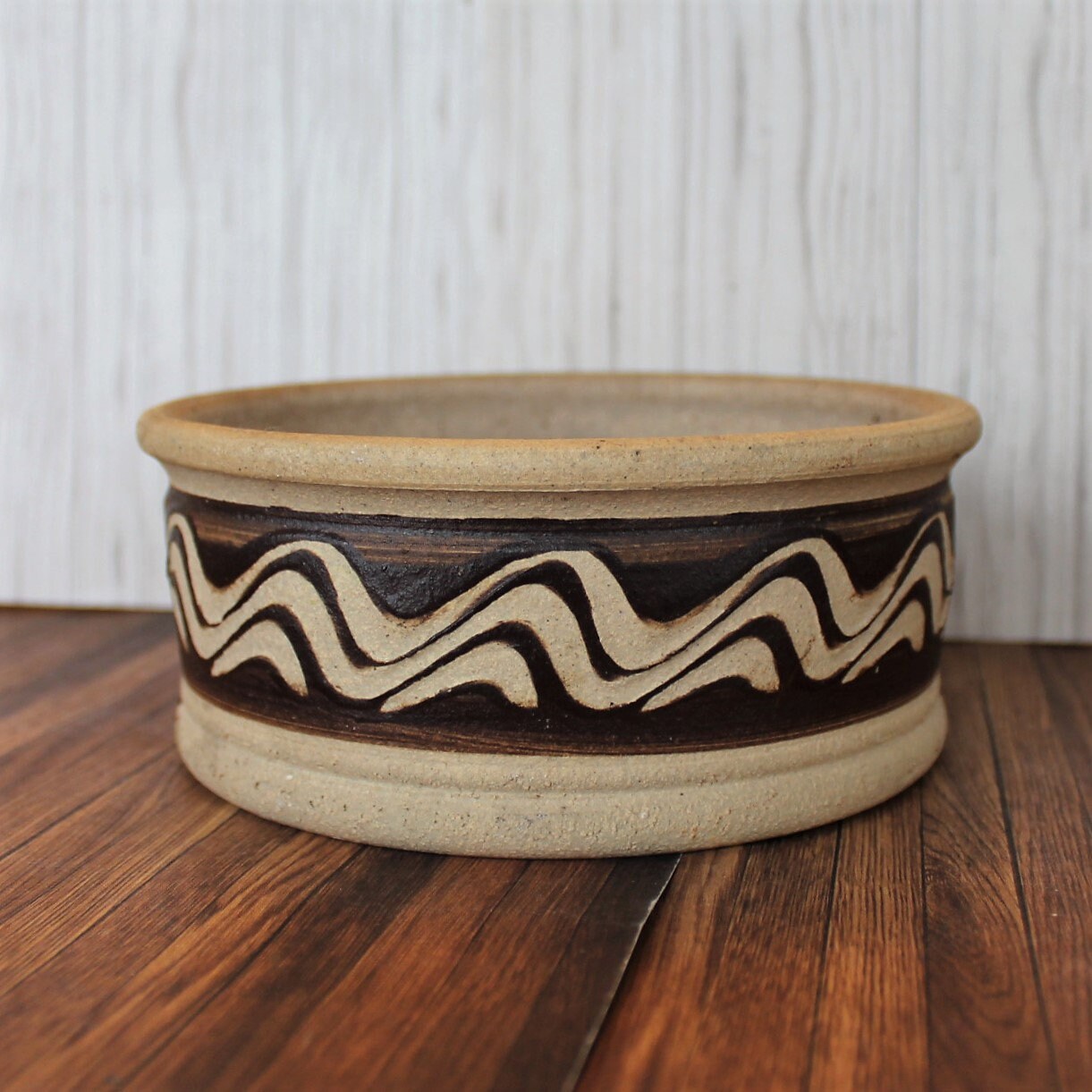 The stoneware planter is 6.25" in diameter and 2.75" tall. It is a tan ceramic piece with brown bands around the pot with a wavy design. It is unglazed and has a rustic finish.