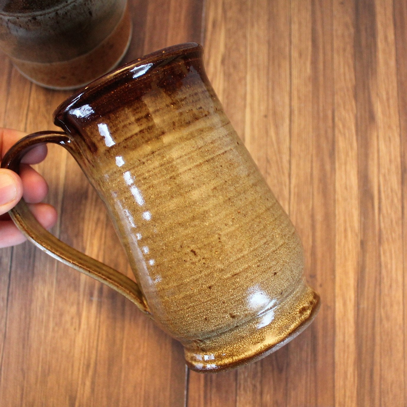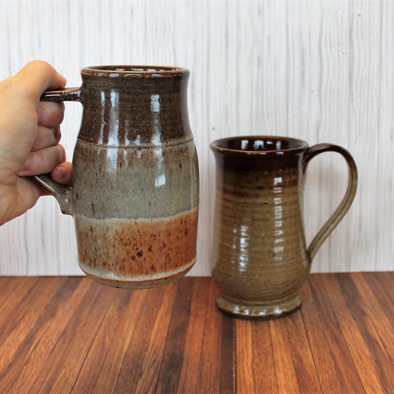 This set of stoneware mugs includes 2 larger sized mugs in brown and gray pottery. The mugs are 5.25" and 5.5" tall and 3" in diamter. They are stoneware pieces and one has a brown glaze that is darker around the rim, and the other is glazed with brown, gray, and orange bands. Both mugs can hold 12 oz. filled to the rim - the taller one can hold about 13 oz.