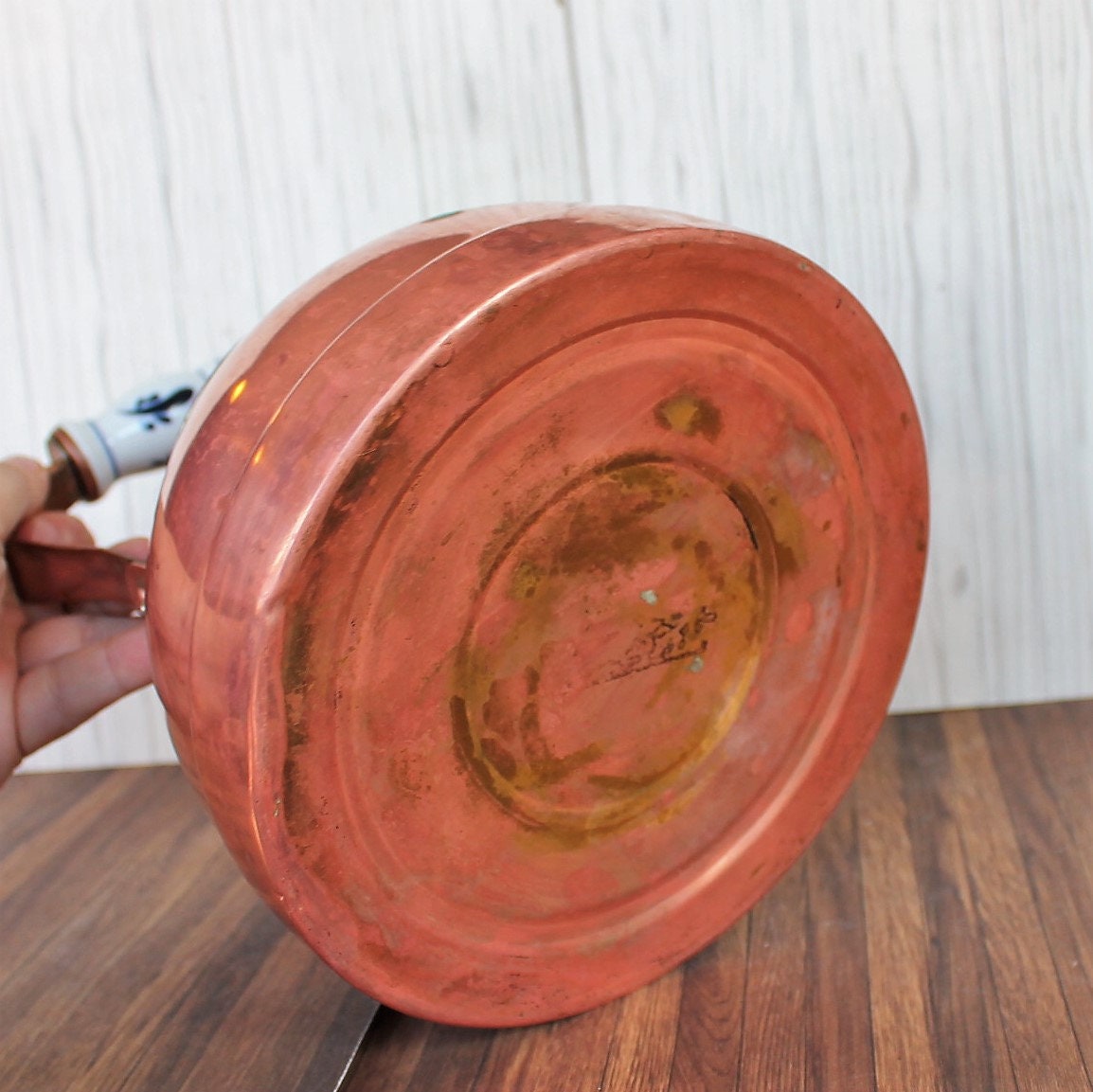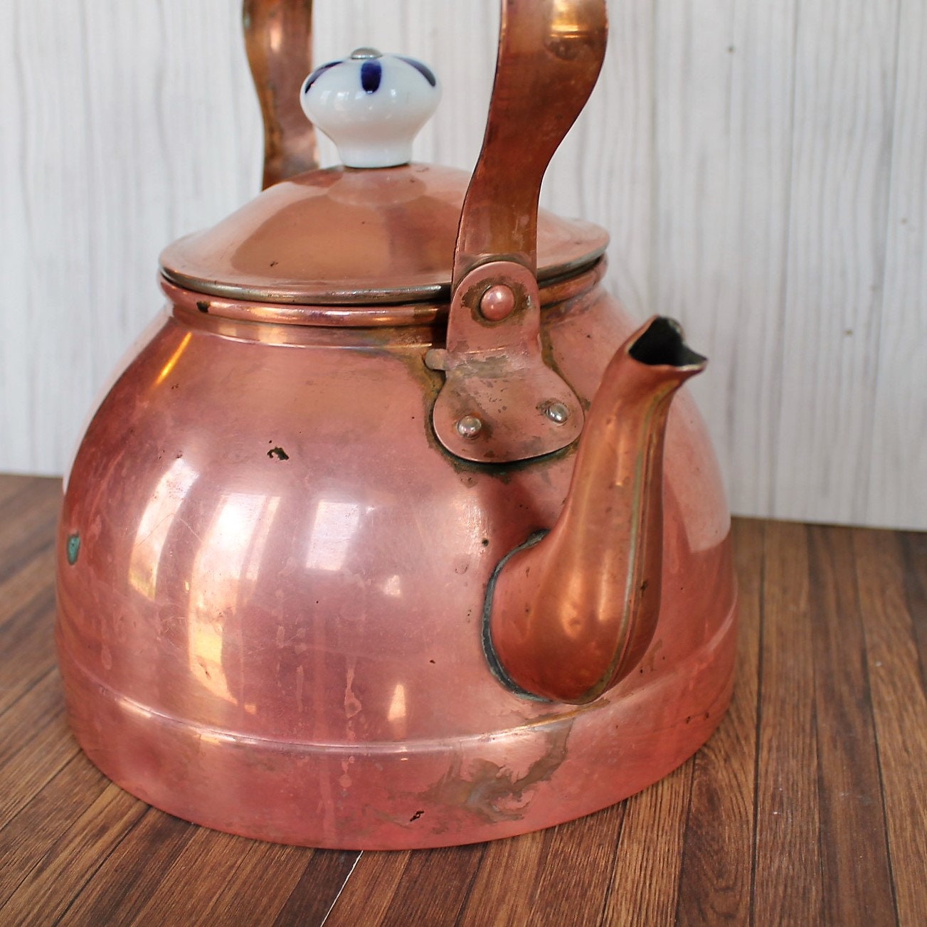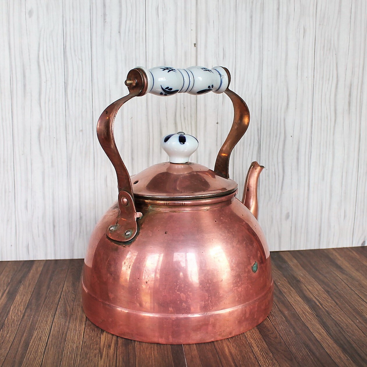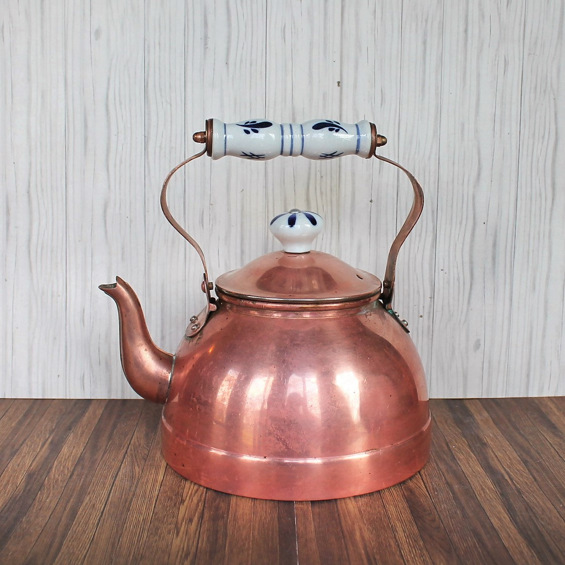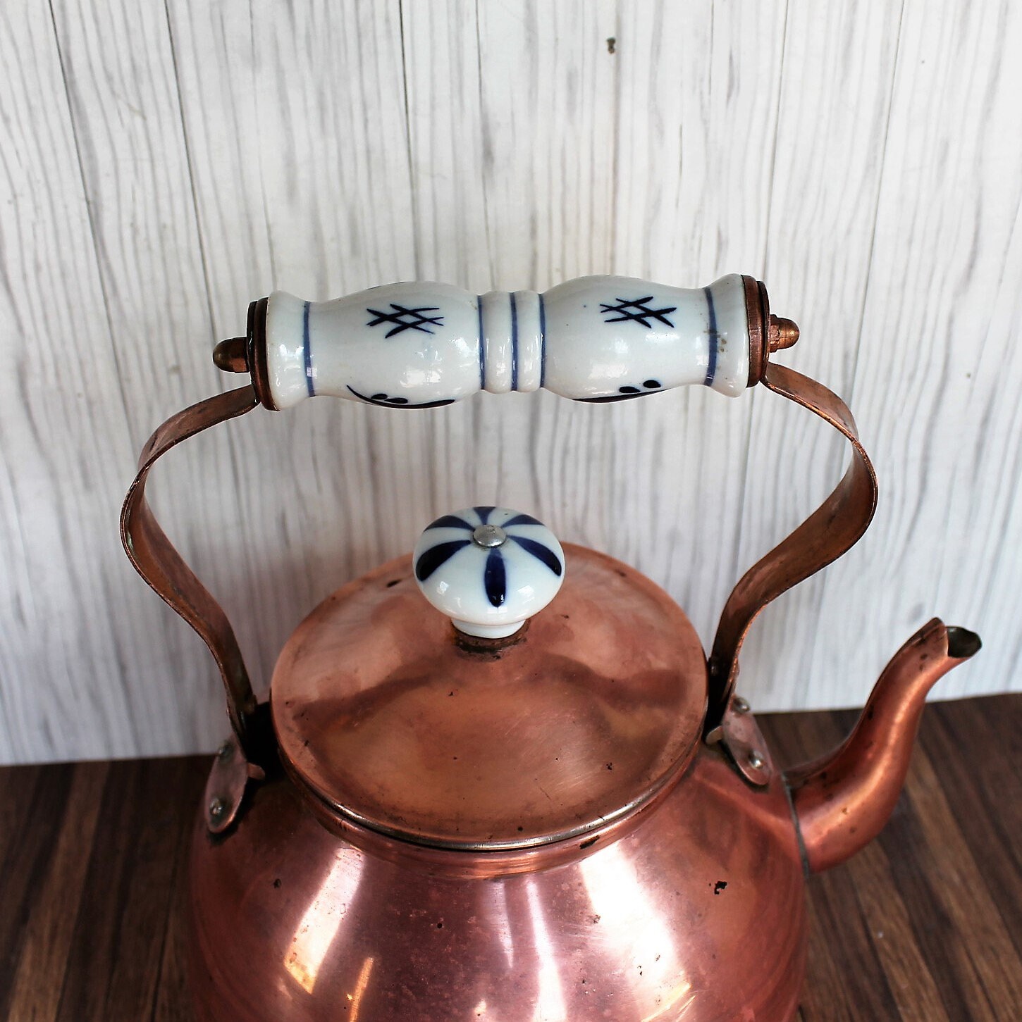 This copper kettle is 6.75" in diameter (8" wide with the spout) and 9" tall with the handle. It is a copper piece, and has a white and blue ceramic handle and knob on the lid of the pot. The pot has a nice, traditional rounded shape. The handle attaches at the top, and curves outward before coming together at the top.