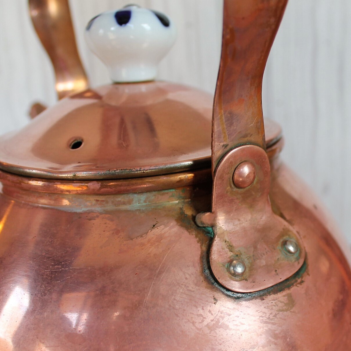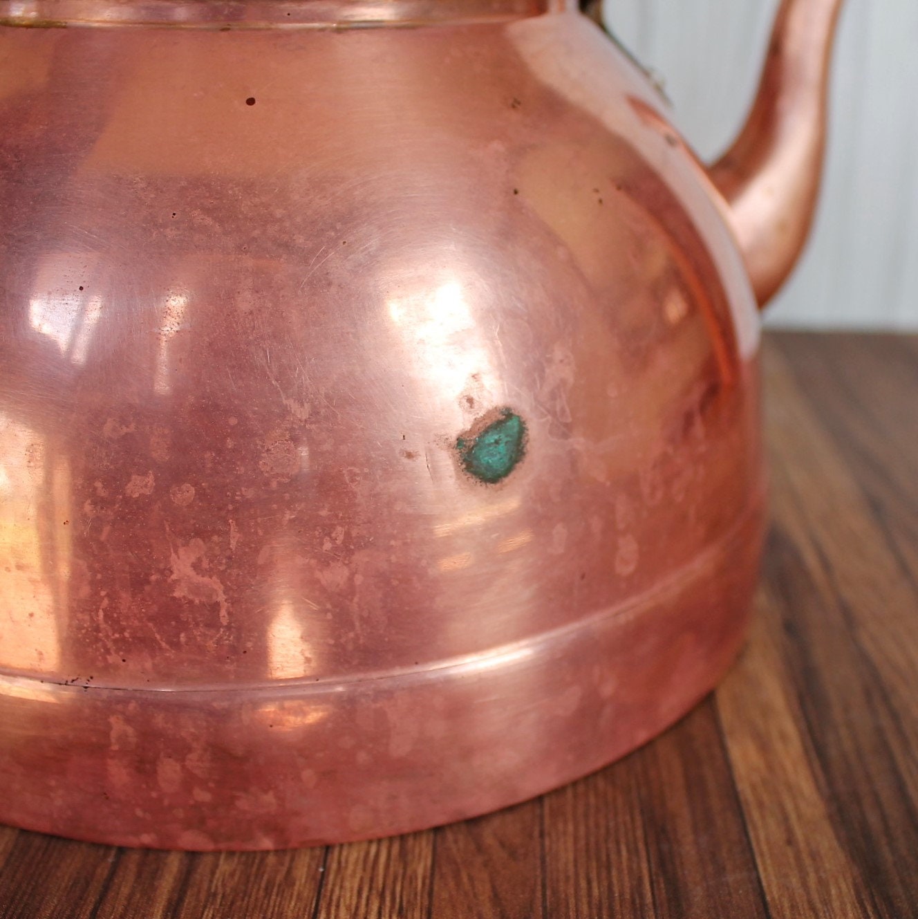 The kettle is in nice condition but does show some tarnish and wear, most noticably around where the handle attaches. The kettle was recently cleaned in a saltwater and vinegar solution to remove most of the tarnish. There is a small spot of corrosion on one side of the pot as shown in the last photo.