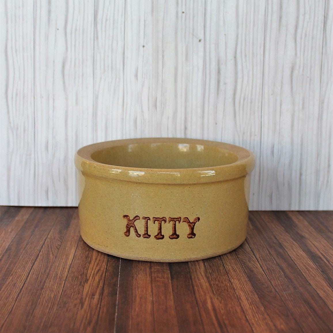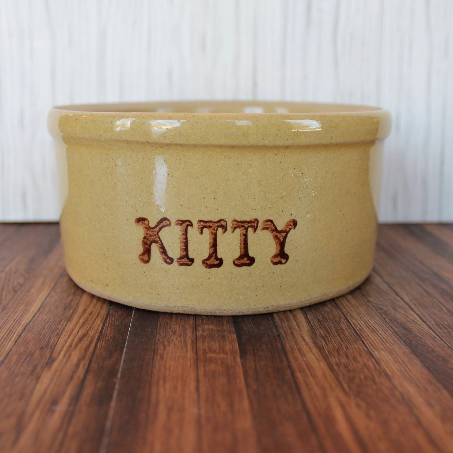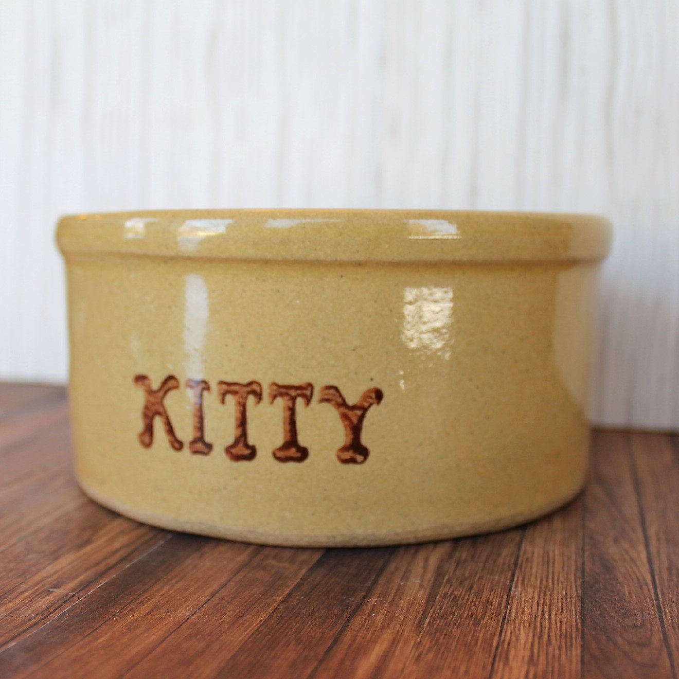 This cool stoneware crock is by Robinson Ransbottom Pottery Co from Roseville, Ohio. It is 6" in diameter and 2.75" tall, and is a cream colored stoneware crock-style pet food bowl. The front of the bowl is marked KITTY. The bottom of the bowl is marked: R.R.P.Co. / Roseville, O. / U.S.A. / #201. This is a thick and heavy stoneware crock, weighing almost 3 pounds itself.