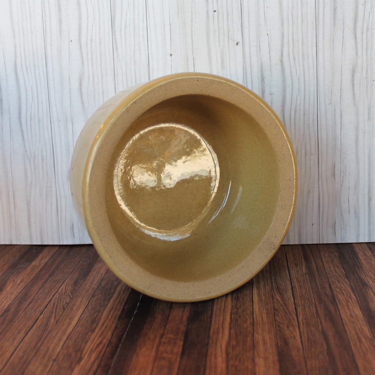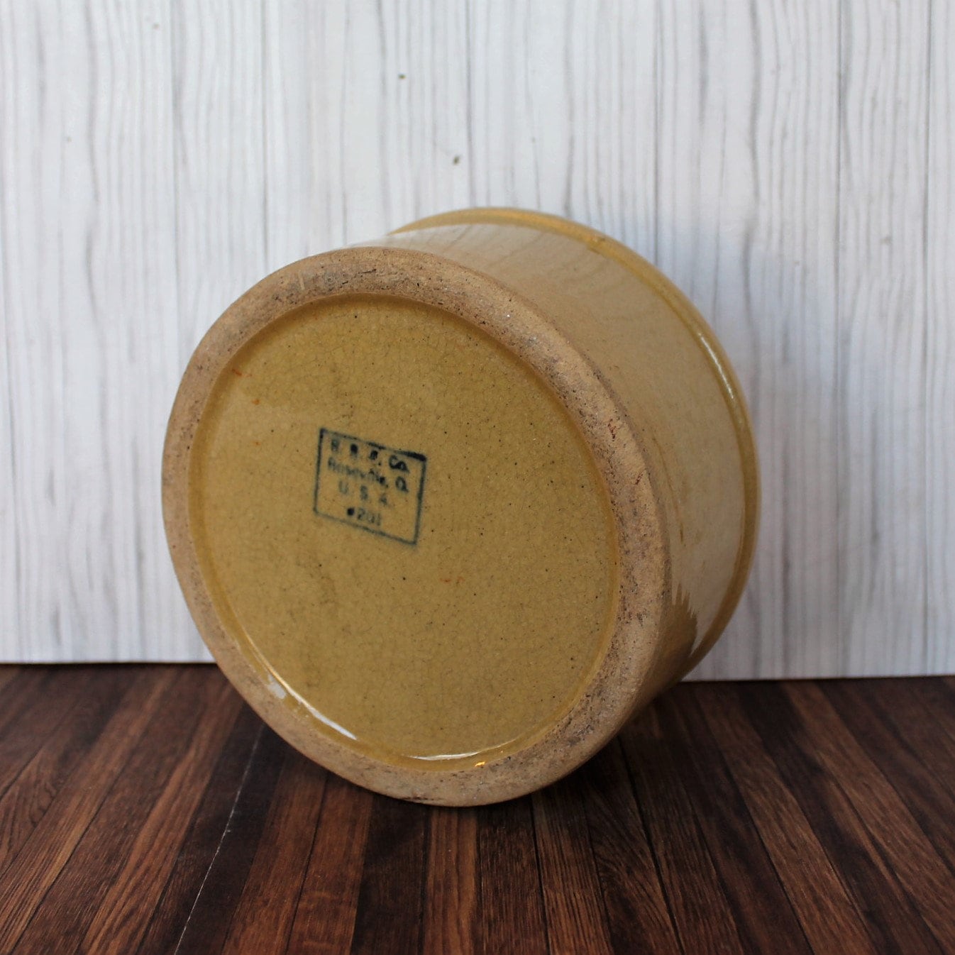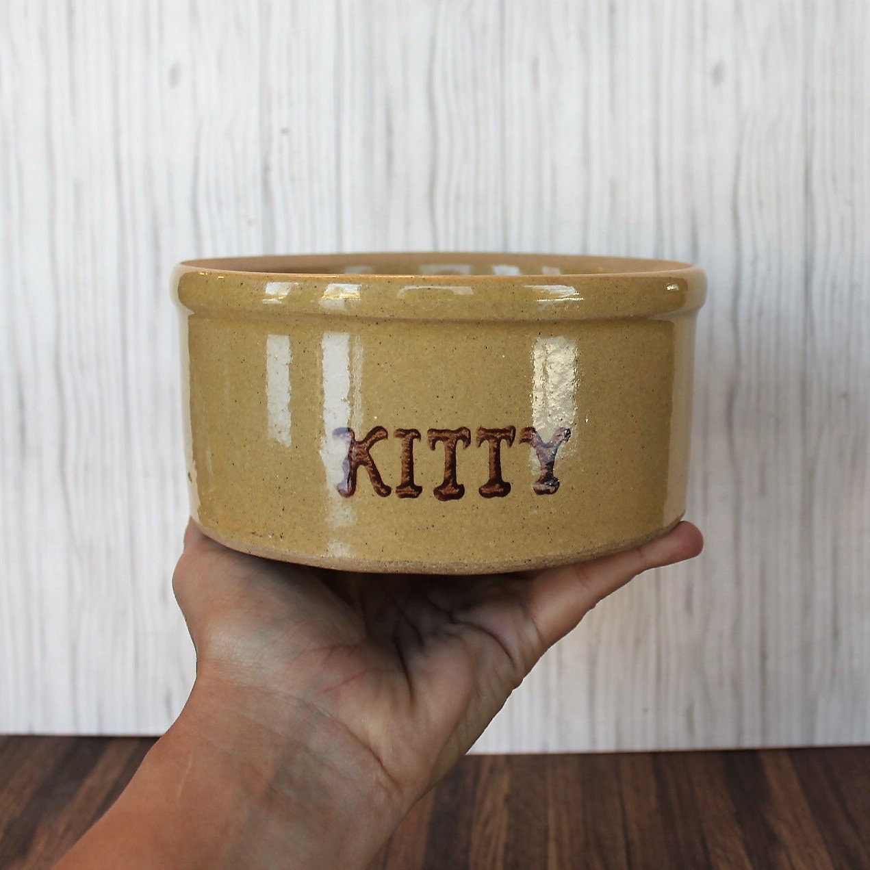This cool stoneware crock is by Robinson Ransbottom Pottery Co from Roseville, Ohio. It is 6" in diameter and 2.75" tall, and is a cream colored stoneware crock-style pet food bowl. The front of the bowl is marked KITTY. The bottom of the bowl is marked: R.R.P.Co. / Roseville, O. / U.S.A. / #201. This is a thick and heavy stoneware crock, weighing almost 3 pounds itself.