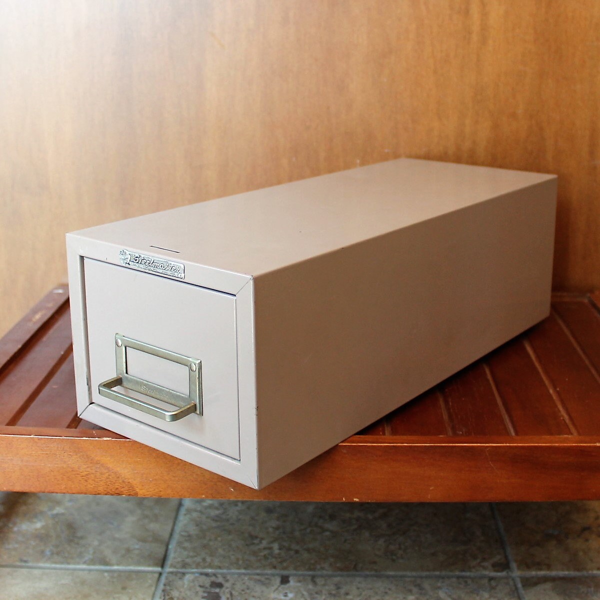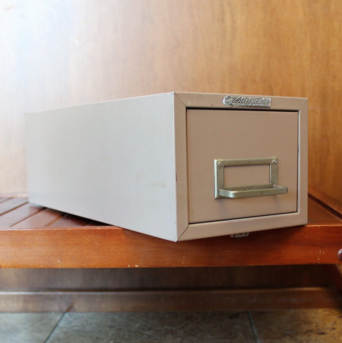 This nice single drawer card file by Steelmaster is 65" wide, 16" long and 5" high. It is a tan/beige metal cabinet with one sliding drawer. The drawer has silver metal handle, and has an adjsutable divider to hold the index cards. There is a silver metal label on the front that reads: STEELMASTER / ART STEEL COMPANY, INC / NEW YORK U.S.A.