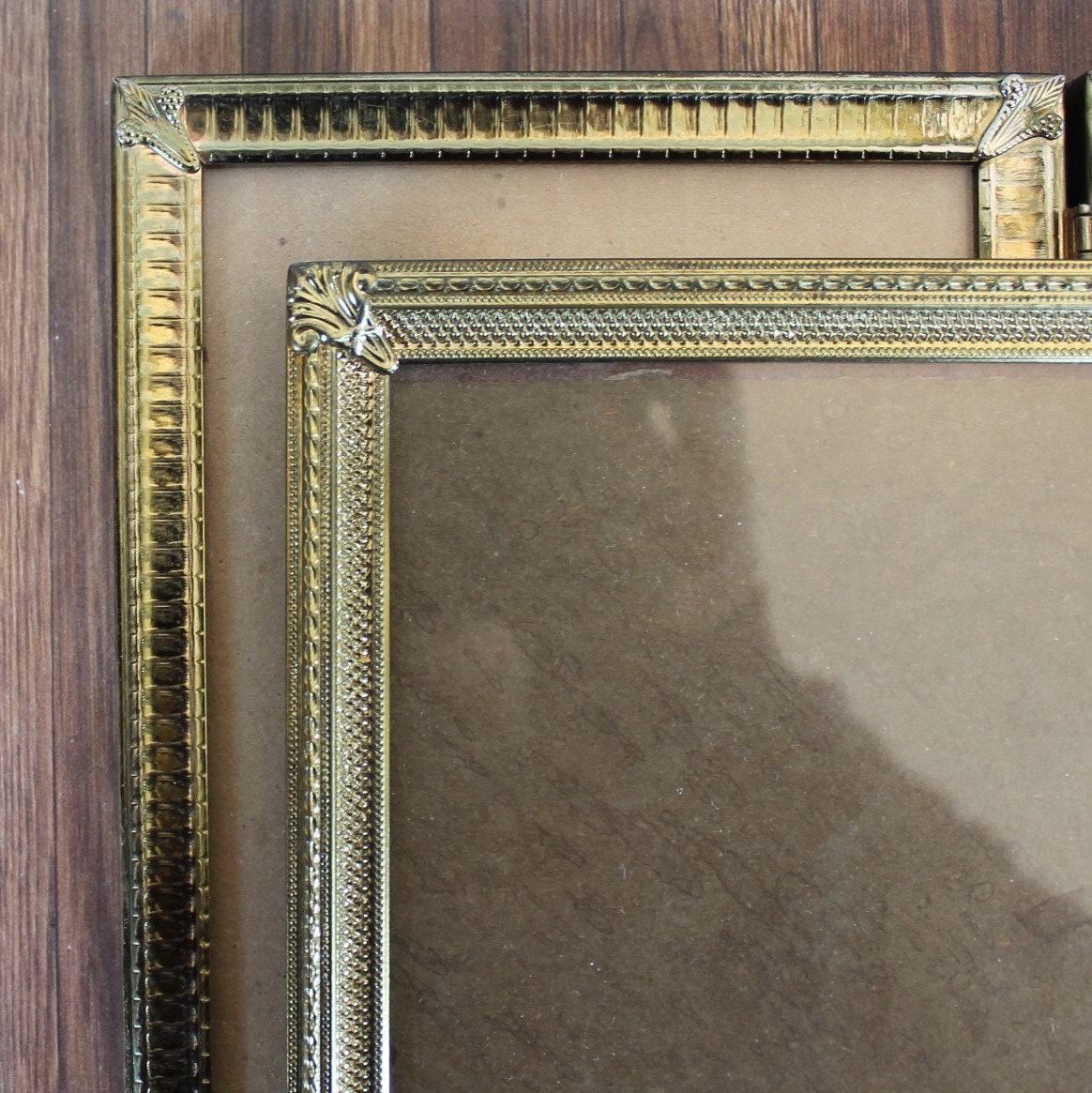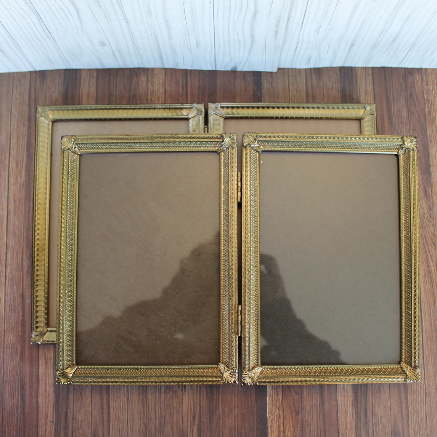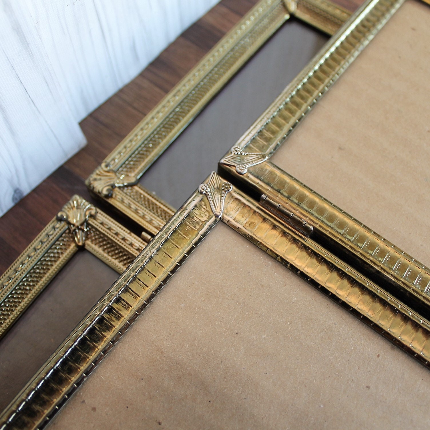 This set of brass frames includes two 5x7 double hinged frames, in two different designs and patterns. They are both a golden brass colored metal, and have nicely detailed designs around the edges. The overall dimensions of the frames are 10.25" wide by 7.25" tall. They each have a clear glass insert that covers the photo opening. One of the frames has a little bit of tarnish/discoloration in one corner of the frame. Great set of vintage brass frames!