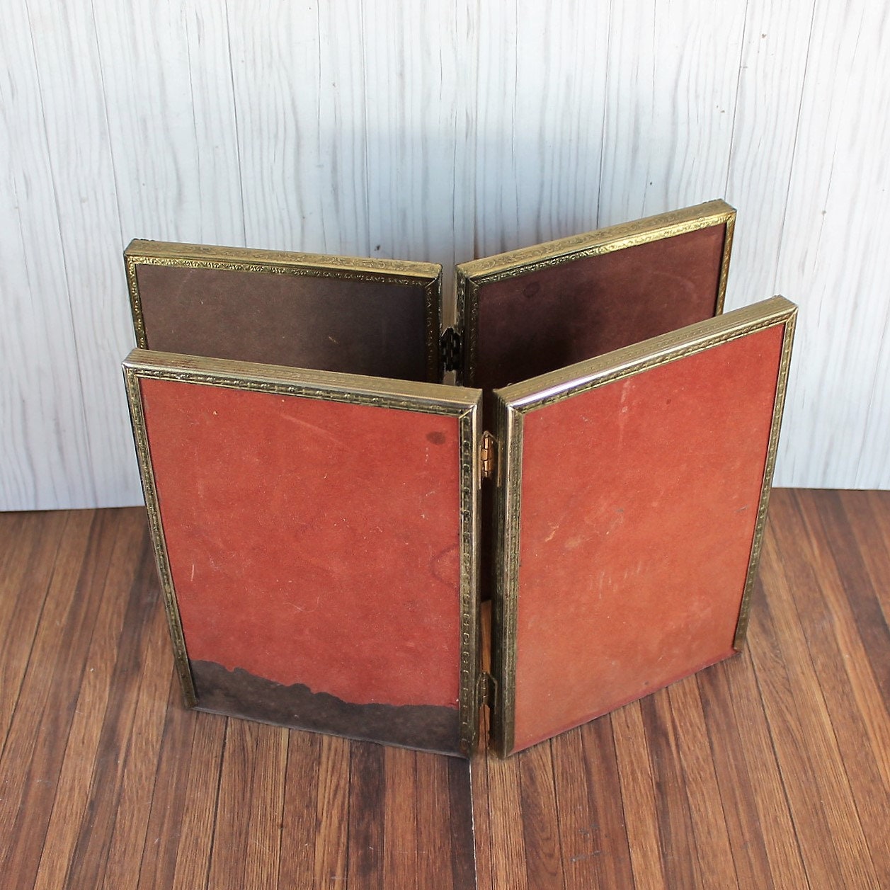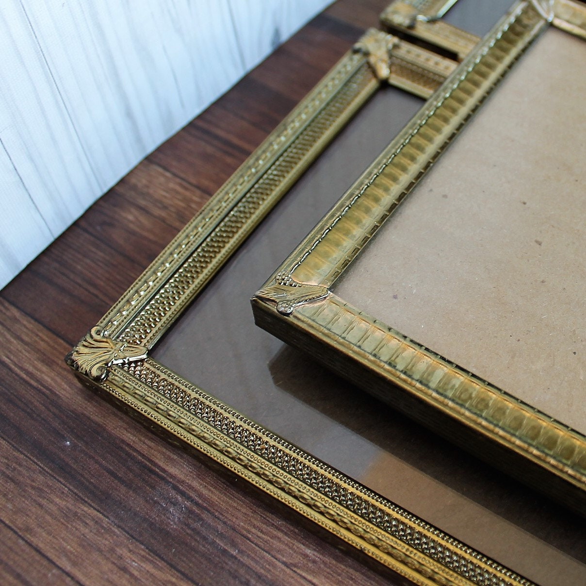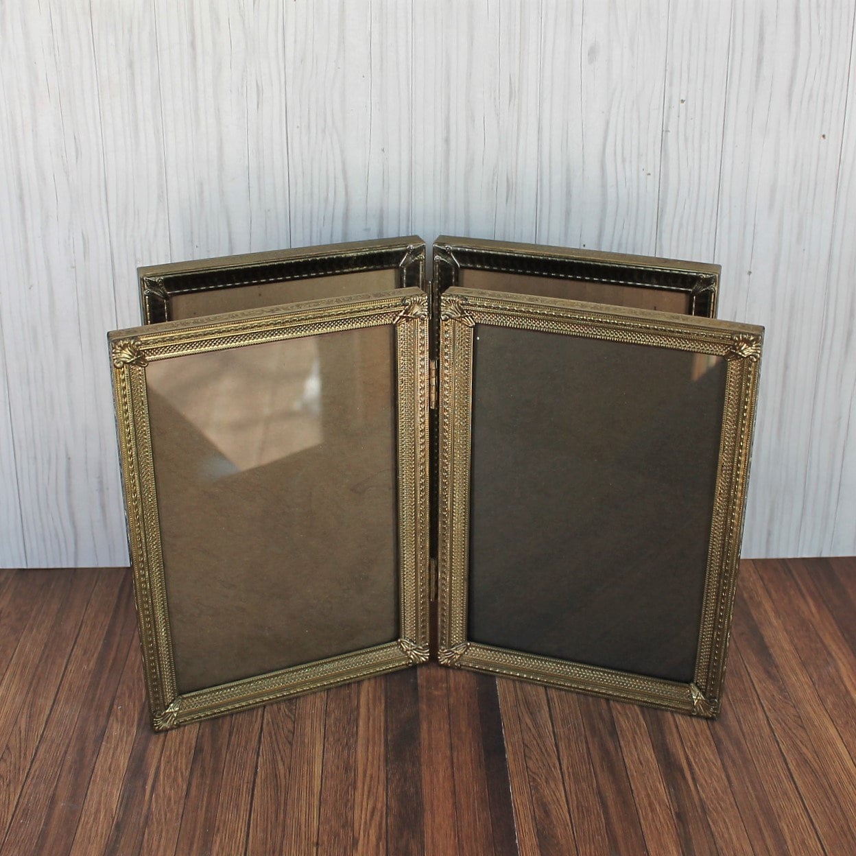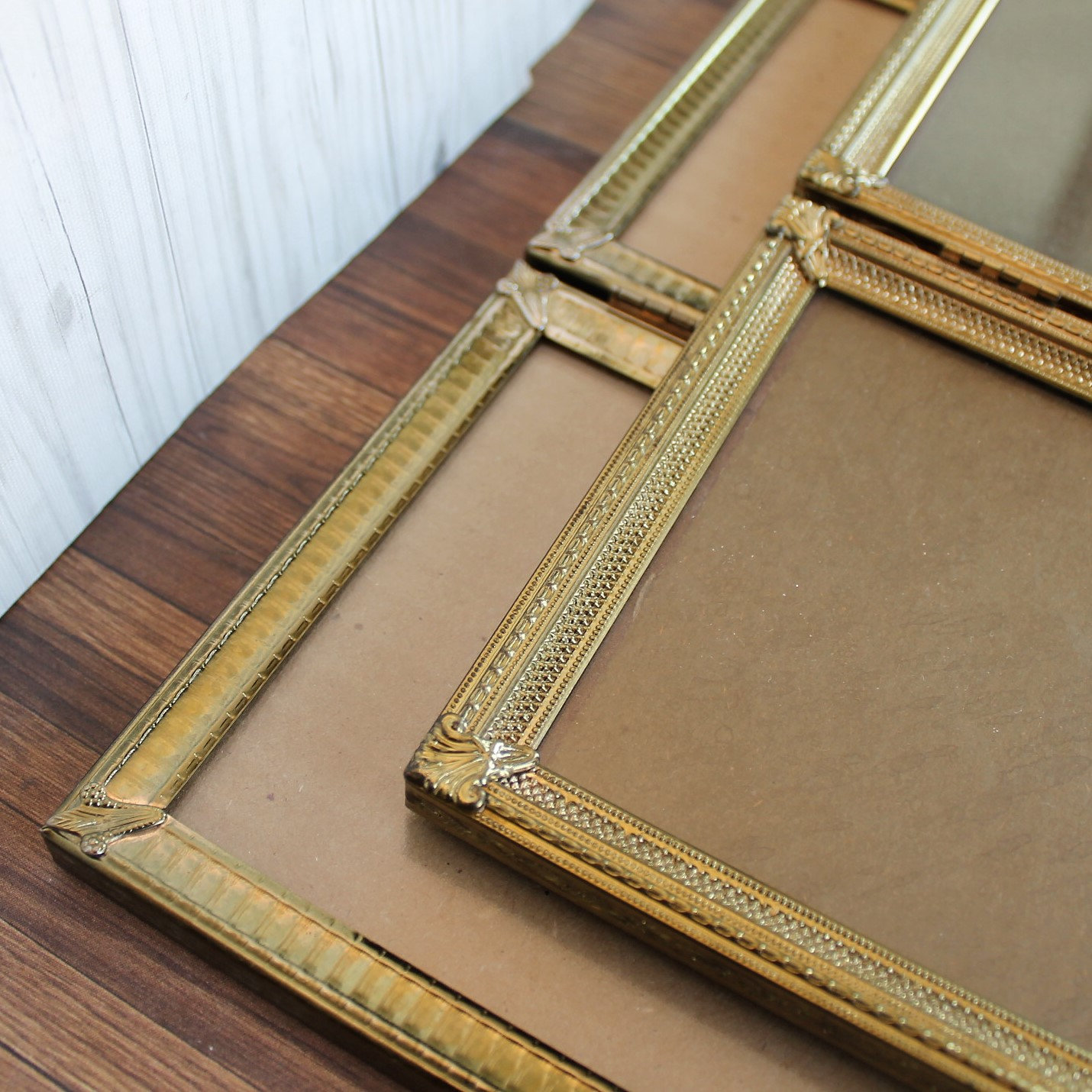This set of brass frames includes two 5x7 double hinged frames, in two different designs and patterns. They are both a golden brass colored metal, and have nicely detailed designs around the edges. The overall dimensions of the frames are 10.25" wide by 7.25" tall. They each have a clear glass insert that covers the photo opening. One of the frames has a little bit of tarnish/discoloration in one corner of the frame. Great set of vintage brass frames!