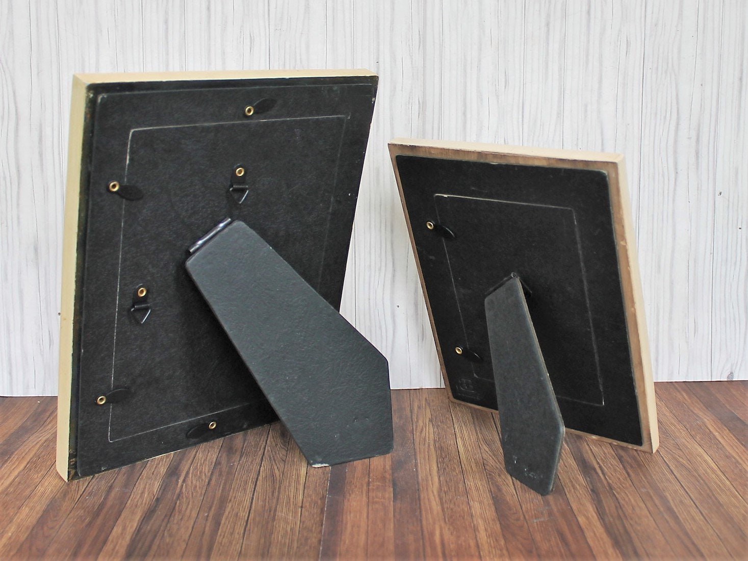 This set of 2 frames incldues 2 coordinating frames with etched designs. Both frames are made os a resin material that looks like stone, and have rustic etched designs. The larger frame is 9" tall and 7" wide, and can hold one 4x6 photo. The smaller frame is 7.5" tall and 6" wide, and can hold one 3x5" photo. Both frames have a clear glass insert over the photo opening, and a cardboard backing piece with photo stand. Both frames are heavy, substantial frames - the larger one weighs over 2 pounds iteself, and the smaller is 1 pound.