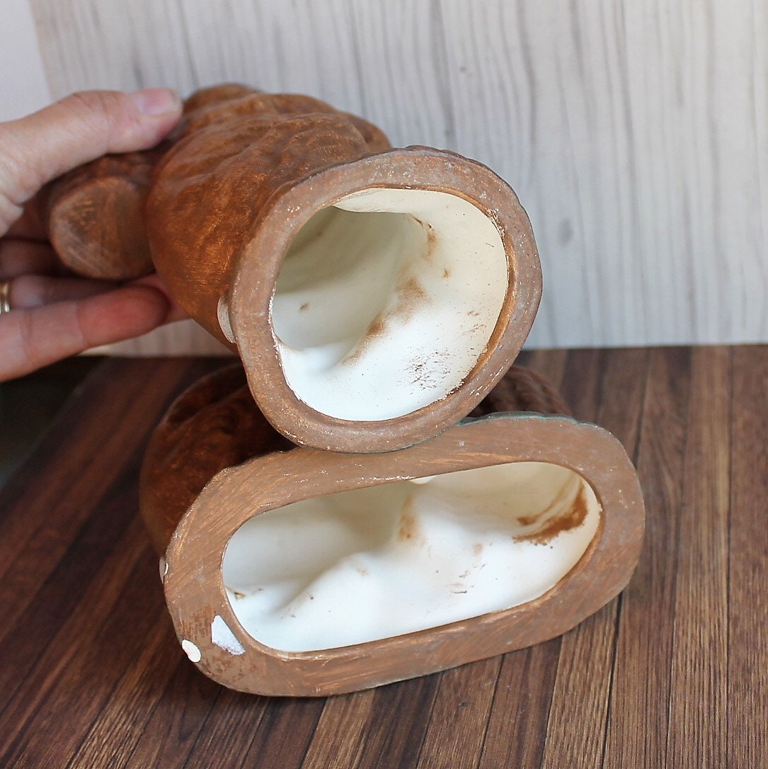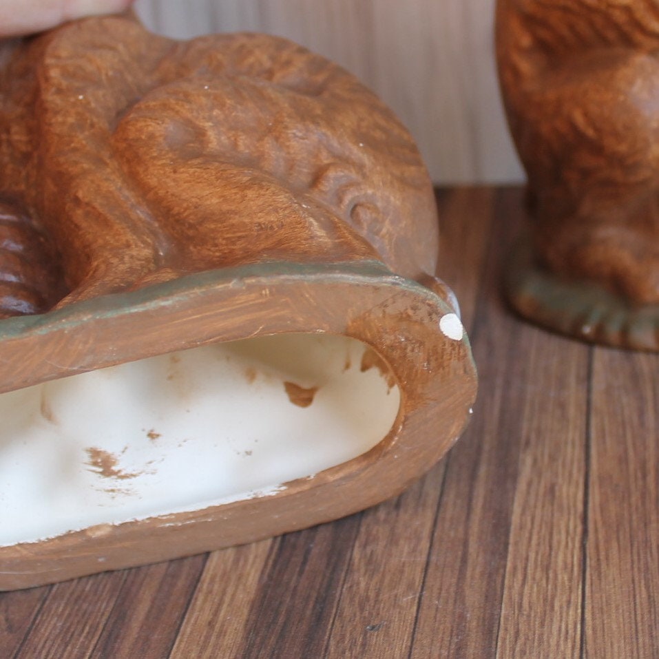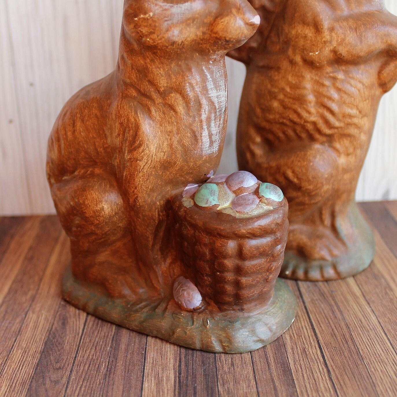 This set of 2 ceramic Easter bunny figurines includes 2 coordinating bunny figurines with baskets. These figurines are a nice size, measuring 7.5" and 9" tall. They are ceramic pieces with a brown glaze, and one bunny carries a basket on his back and the other has a basket of colored eggs in front of him. There are no makers marks on these pieces.