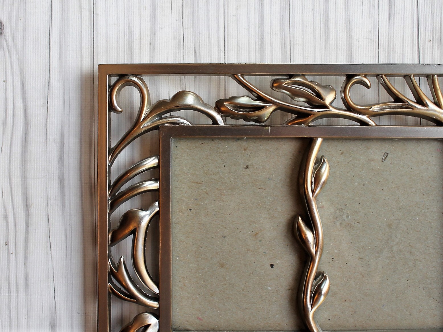This set of 2 metal photo frames includes one 5x7 frame and one from that holds 2 3x5 photos. Both frames are metal and have scrolling leaf designs. The larger gold colored frame is 7" x 9" and holds one 5x7 photo. The smaller frame is 5.5" x 7" and holds 2 2x3 photos. Both frames are made by ELSA, Inc.