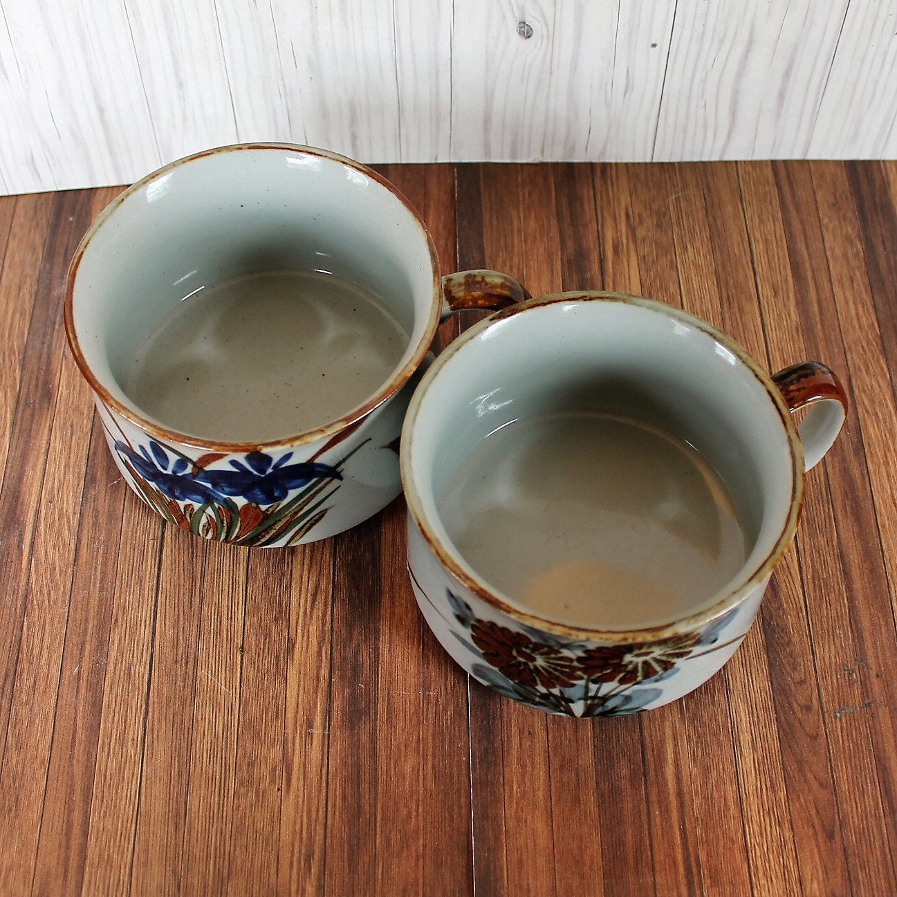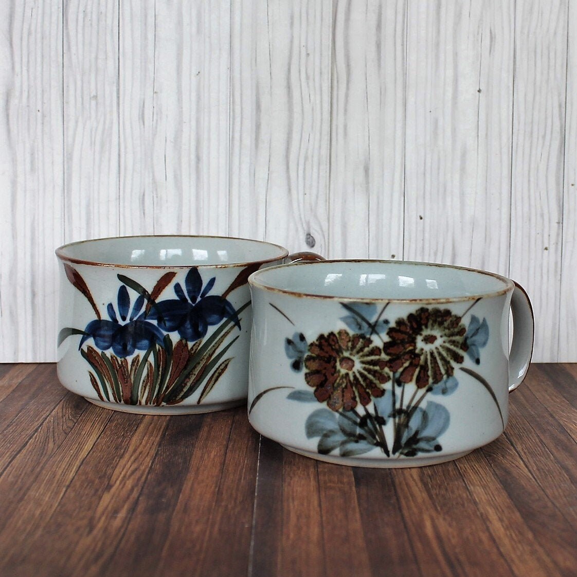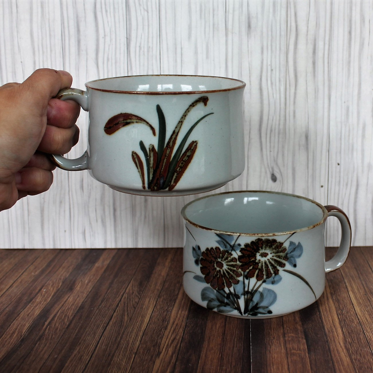 This set of 2 handled soup bowls or soup mugs by Otagiri includes 2 coordinating mugs in different patterns. The bowls are a light gray stoneware with brown flecking, and each have a handpainted flower design in blue and brown. The bowls are accented with brown bands on the rim and down the handles. Each bowl is 4.25" in diameter and 2.75" high. With the handle, they are 5.5" wide. The bowls can comfortably hold 10 oz., filled to the rim they hold 12 oz.