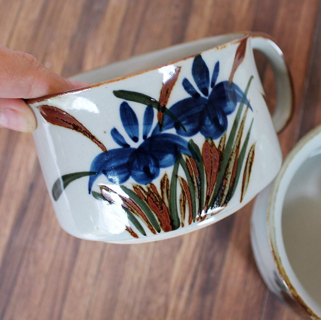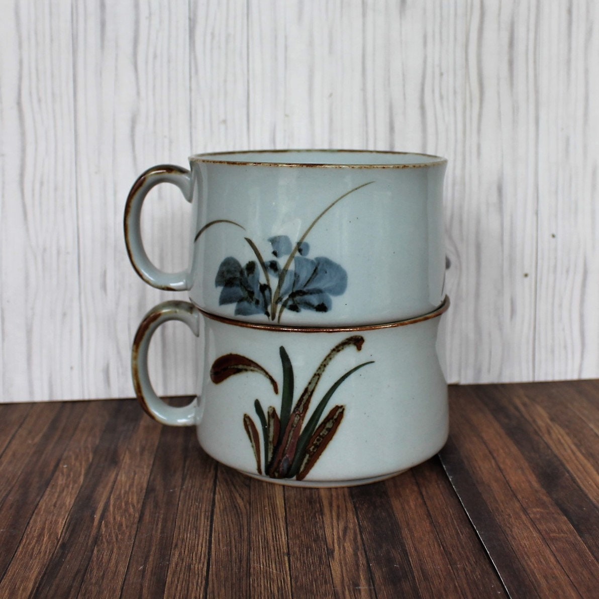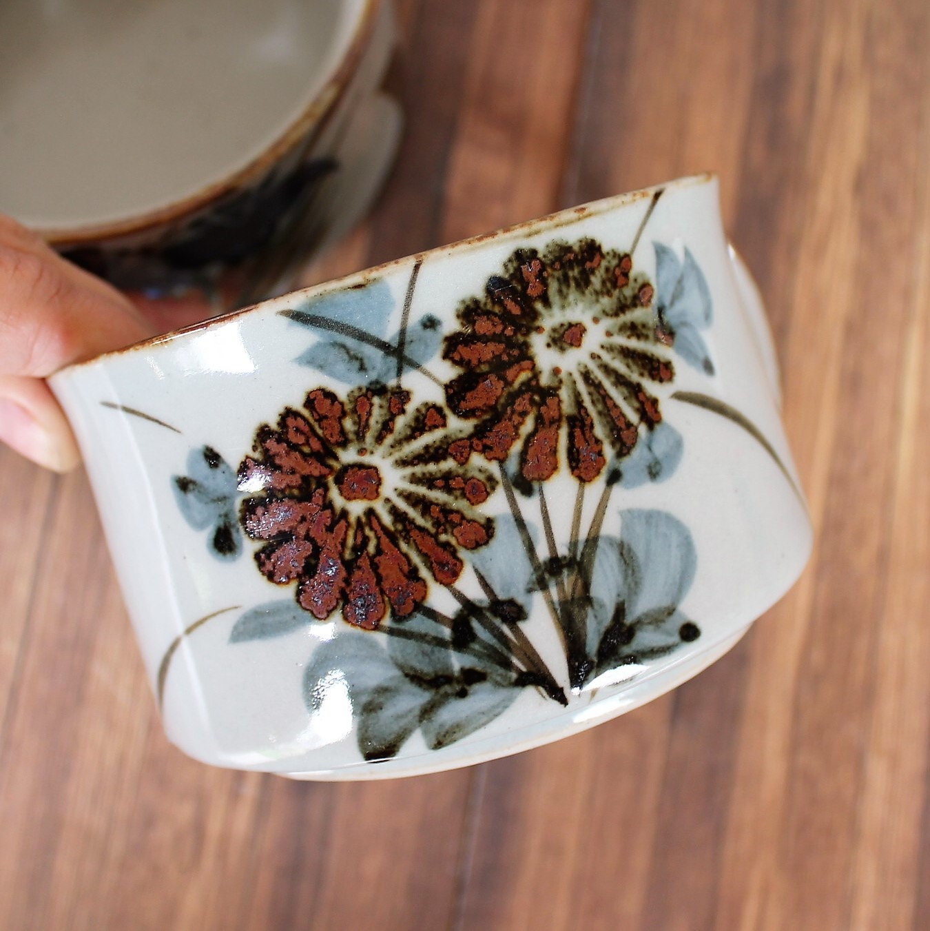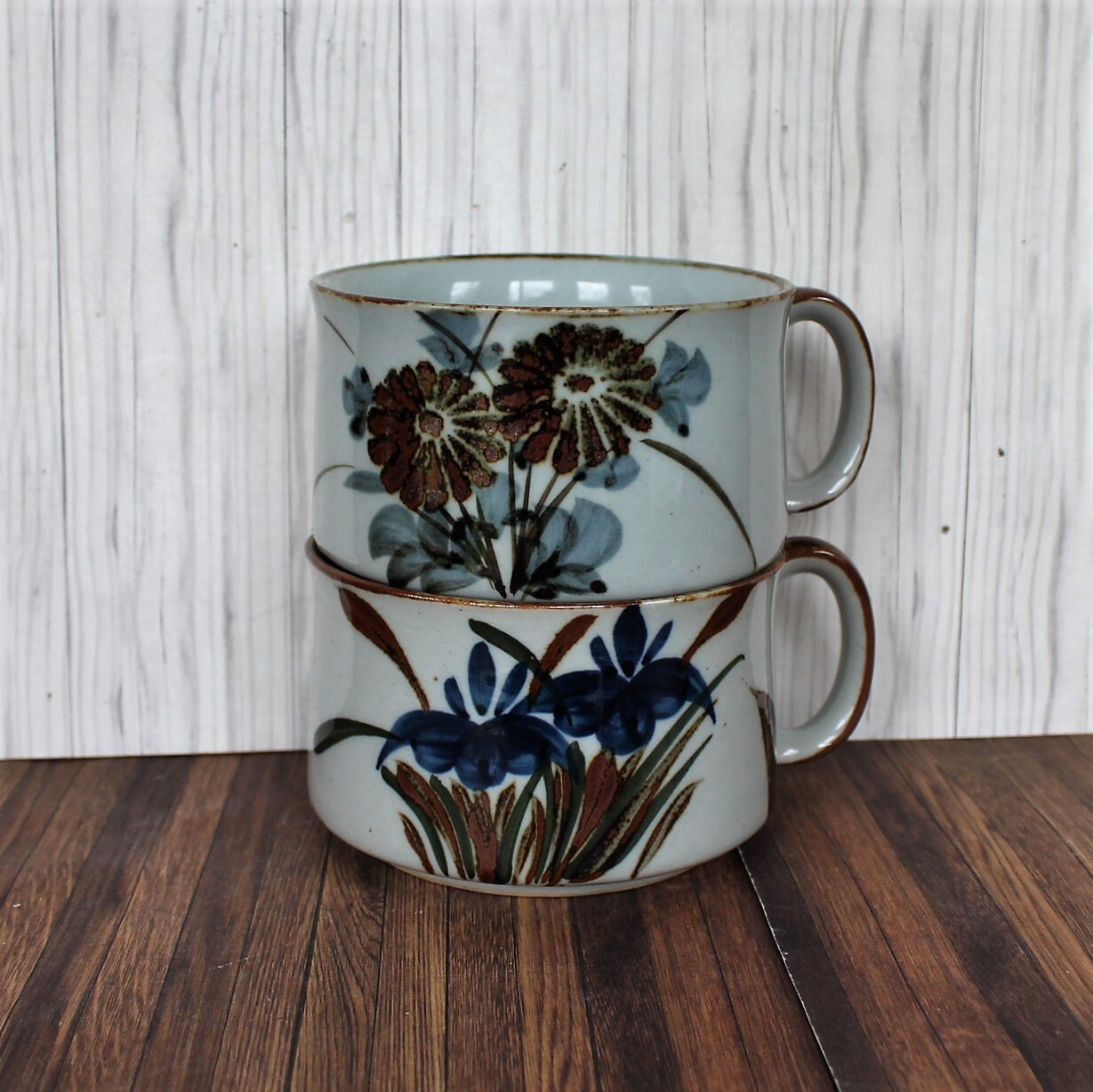This set of 2 handled soup bowls or soup mugs by Otagiri includes 2 coordinating mugs in different patterns. The bowls are a light gray stoneware with brown flecking, and each have a handpainted flower design in blue and brown. The bowls are accented with brown bands on the rim and down the handles. Each bowl is 4.25" in diameter and 2.75" high. With the handle, they are 5.5" wide. The bowls can comfortably hold 10 oz., filled to the rim they hold 12 oz.