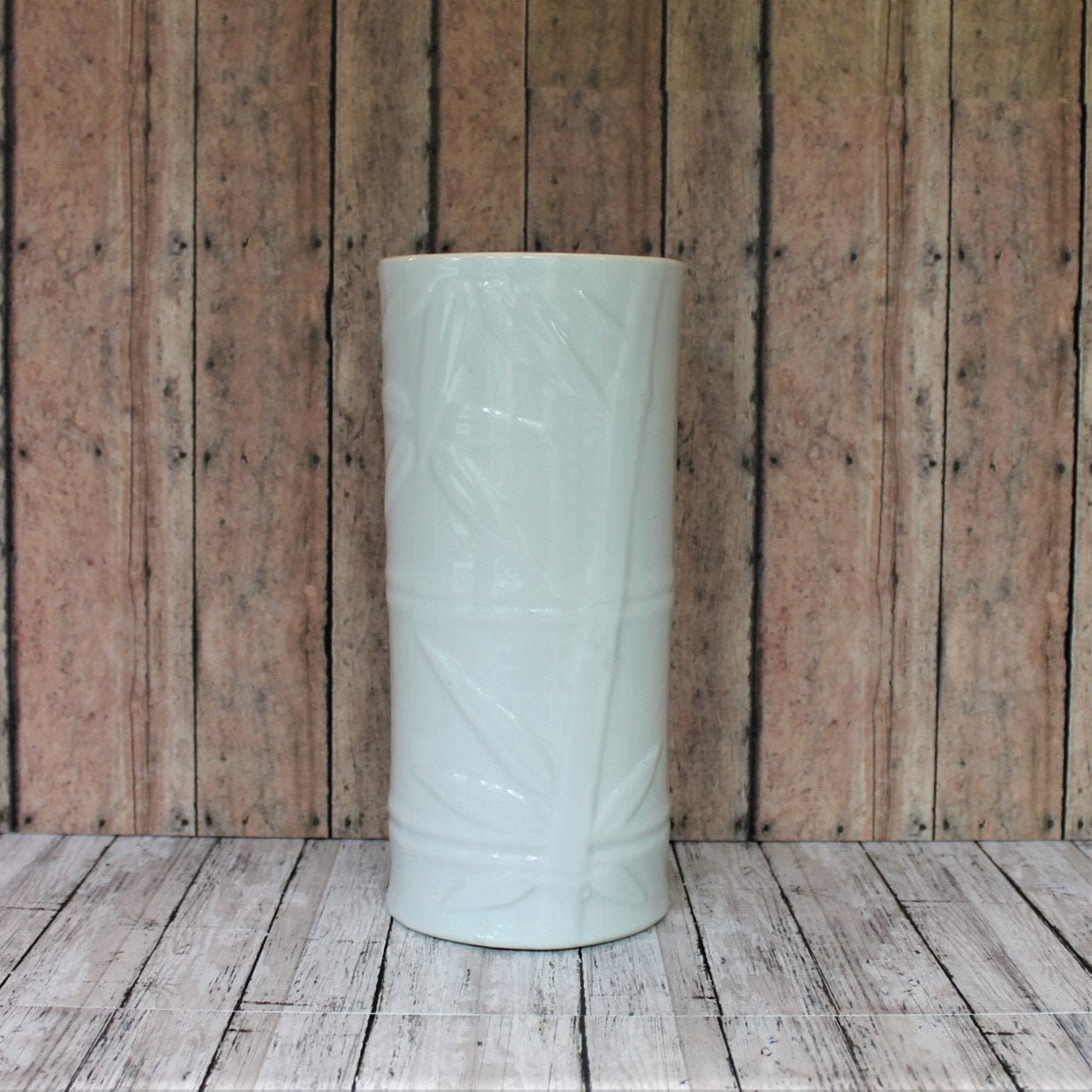 This pretty white ceramic bamboo vase features nicely detailed bamboo stalks in a bright white finish. The piece is white ceramic with a white glaze. The vase is 9.25" tall and 4.25" in diameter, and is marked on the base: MADE IN JAPAN. The front of the vase has a larger bamboo stalk with leaves, and the back of the base has 2 clusters of leaves.