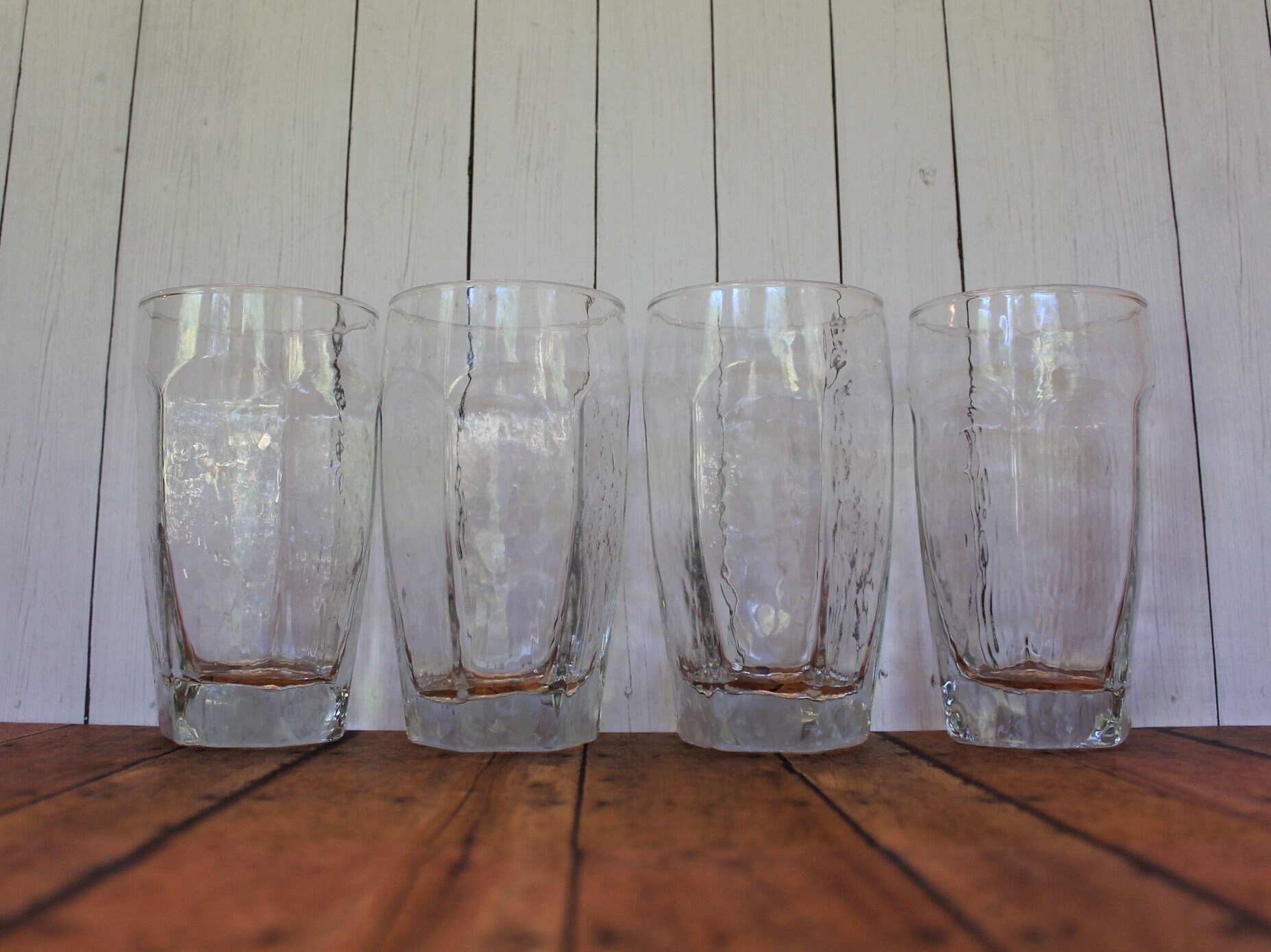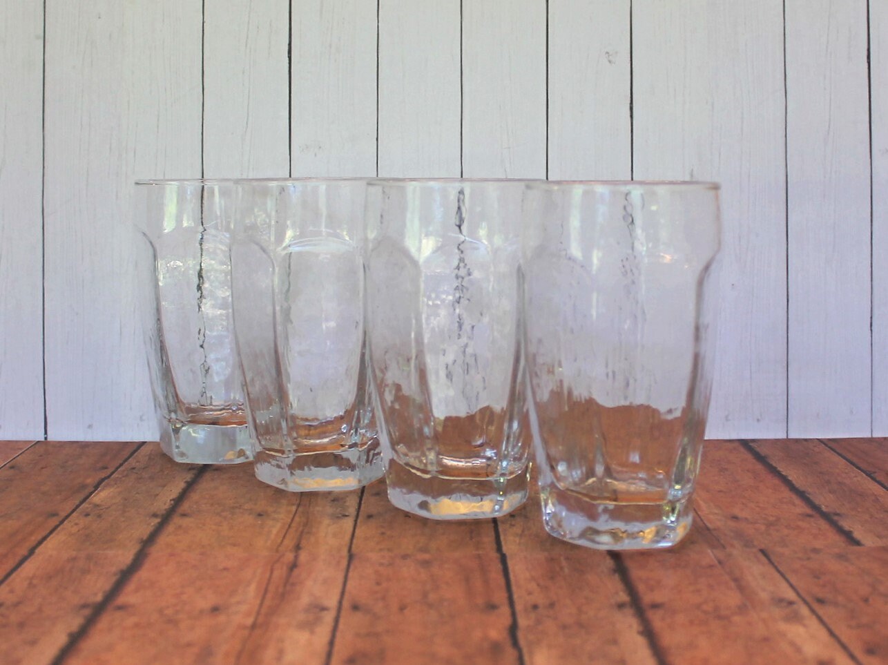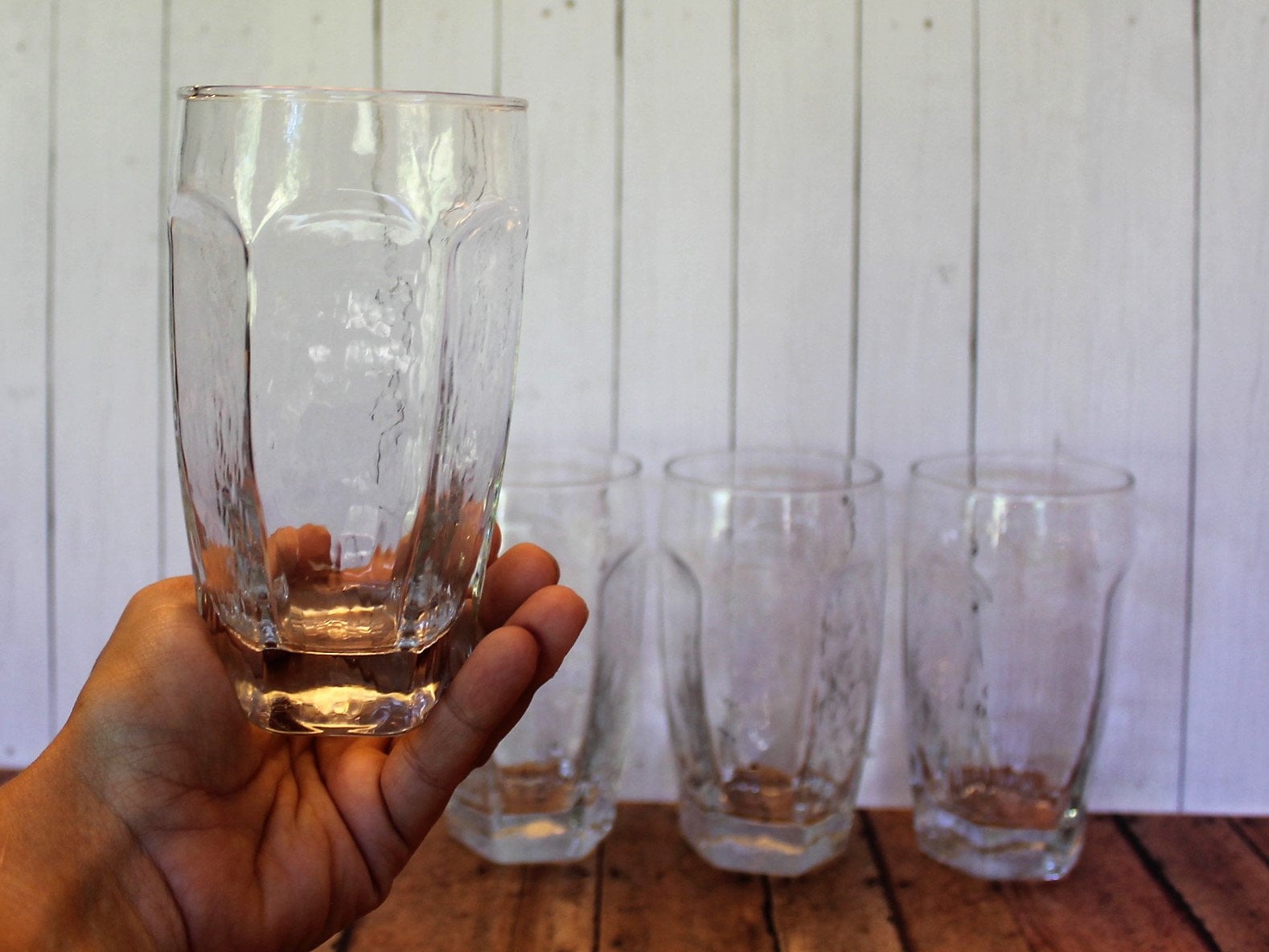 This set of 6 clear tumblers by Libbey are in the Chivalry pattern. They are each 5 1/4" tall and 3" in diameter. They have flat paneled sides with a rounded bevel at the top, and have a lightly textured glass. Each glass can hold 12 ounces. (although some of the photos show 4 glasses - this listing is for a set of 6 glasses)