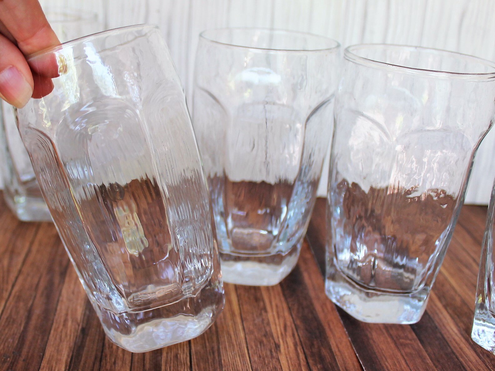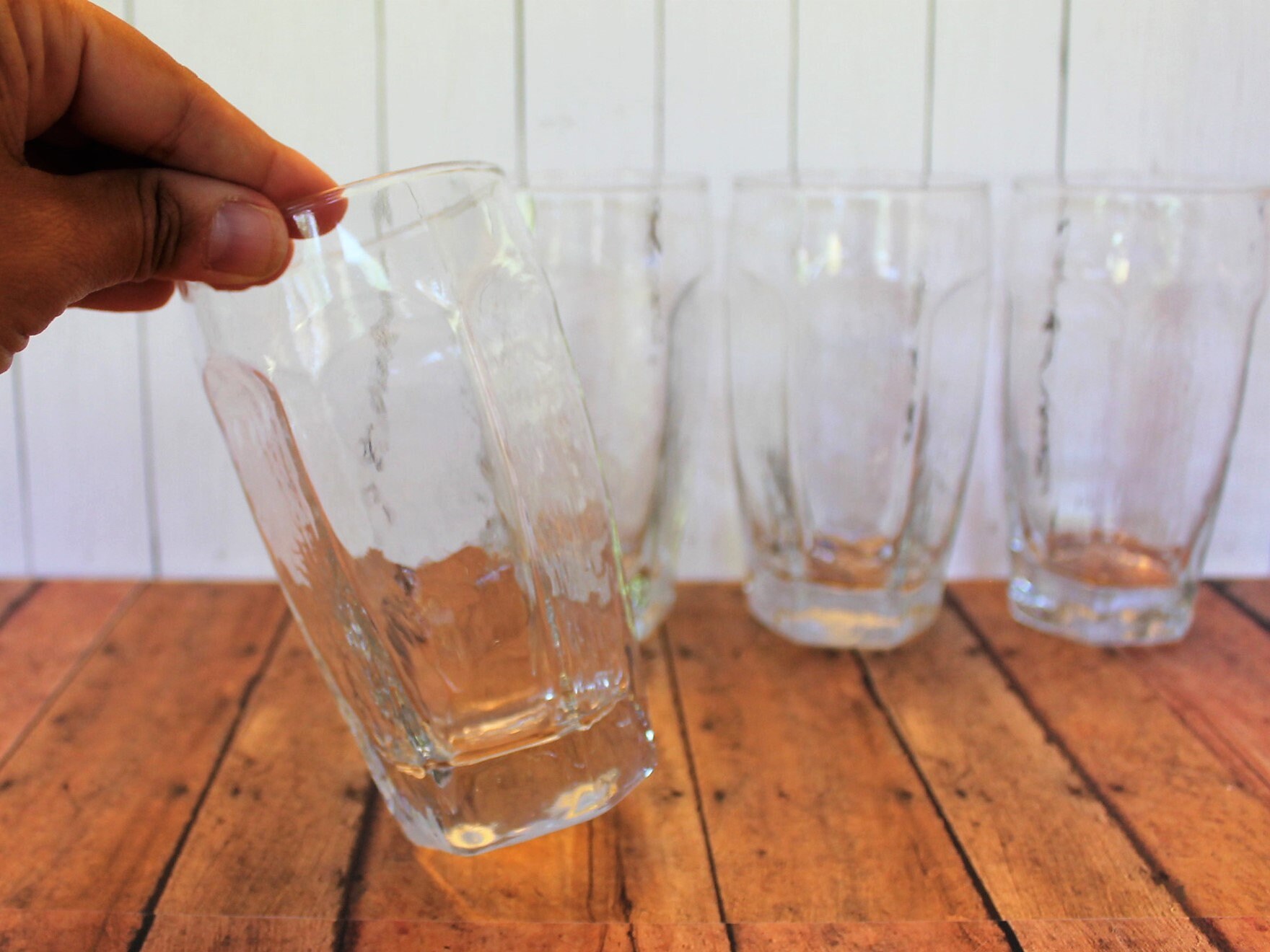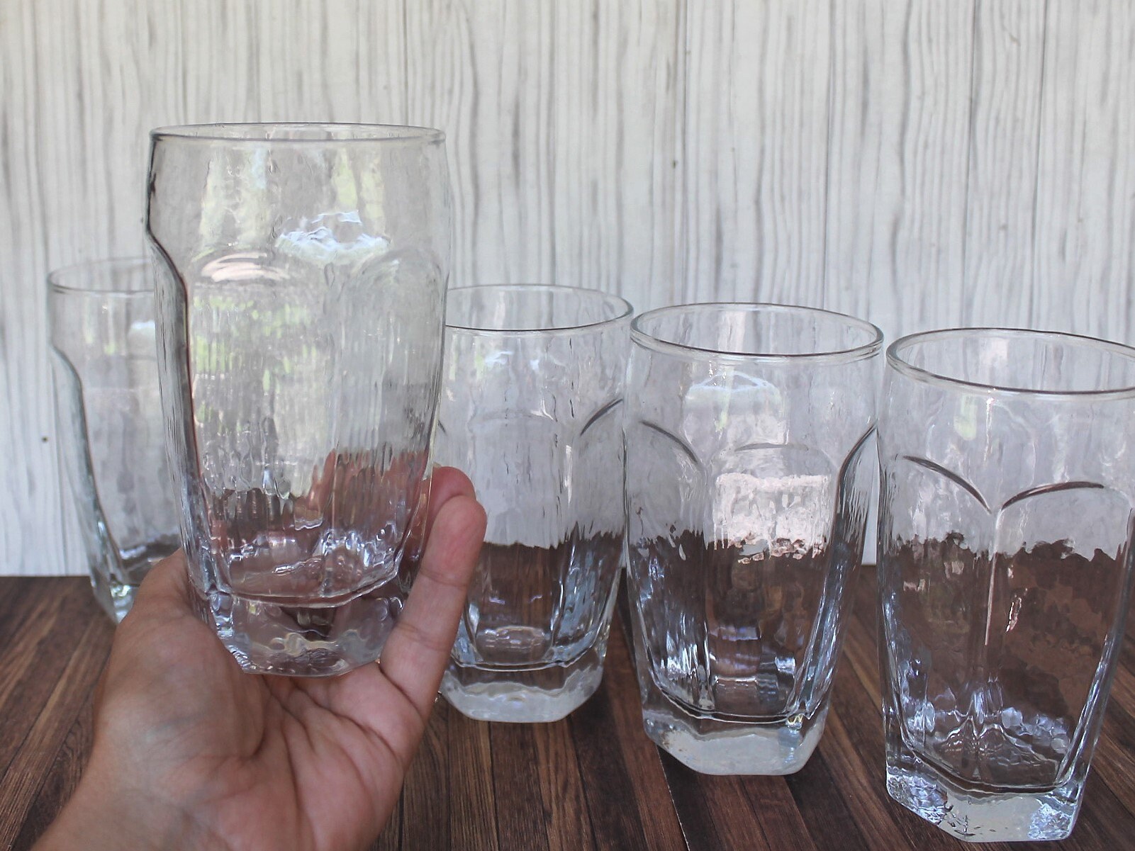This set of 6 clear tumblers by Libbey are in the Chivalry pattern. They are each 5 1/4" tall and 3" in diameter. They have flat paneled sides with a rounded bevel at the top, and have a lightly textured glass. Each glass can hold 12 ounces. (although some of the photos show 4 glasses - this listing is for a set of 6 glasses)