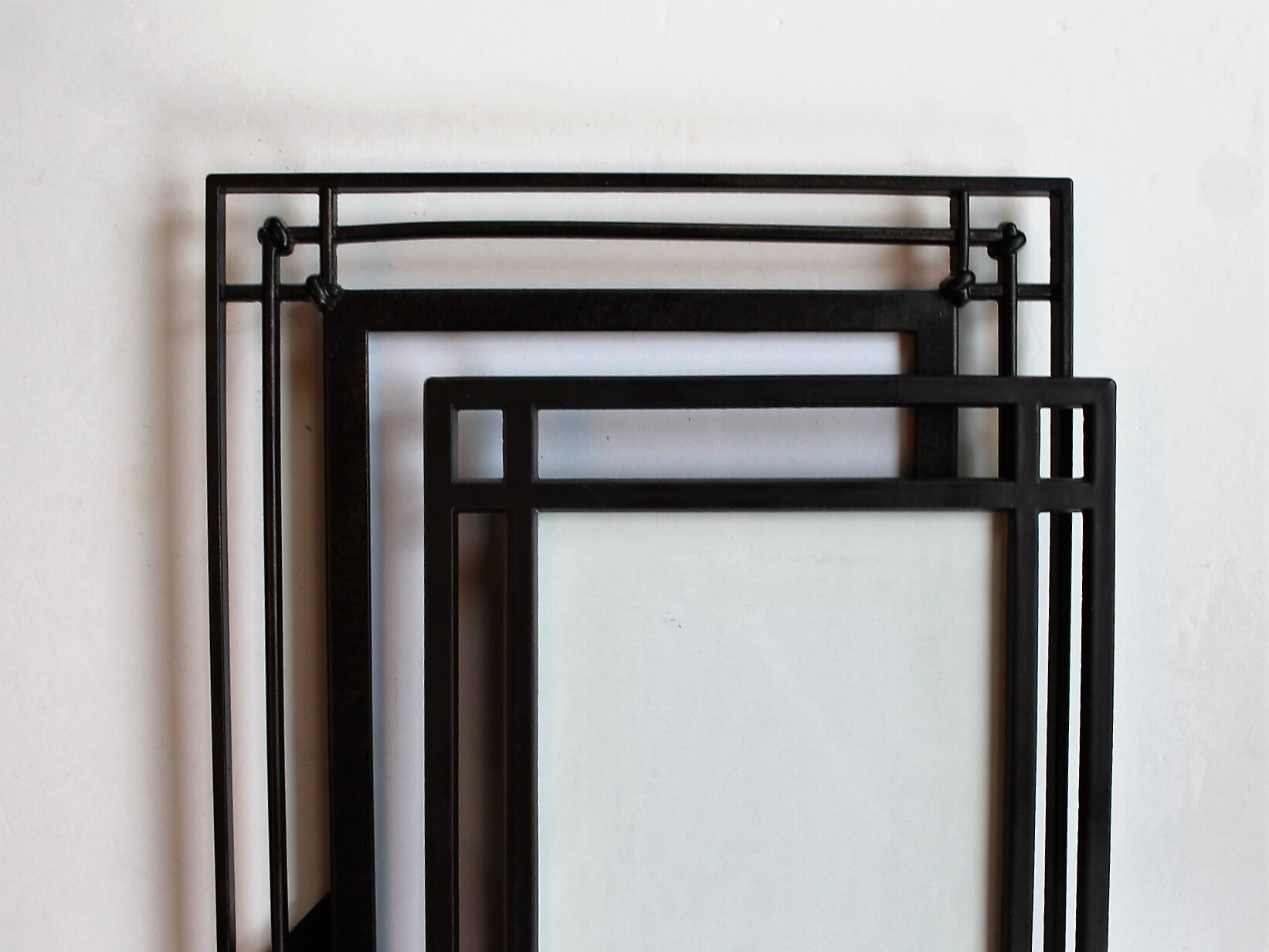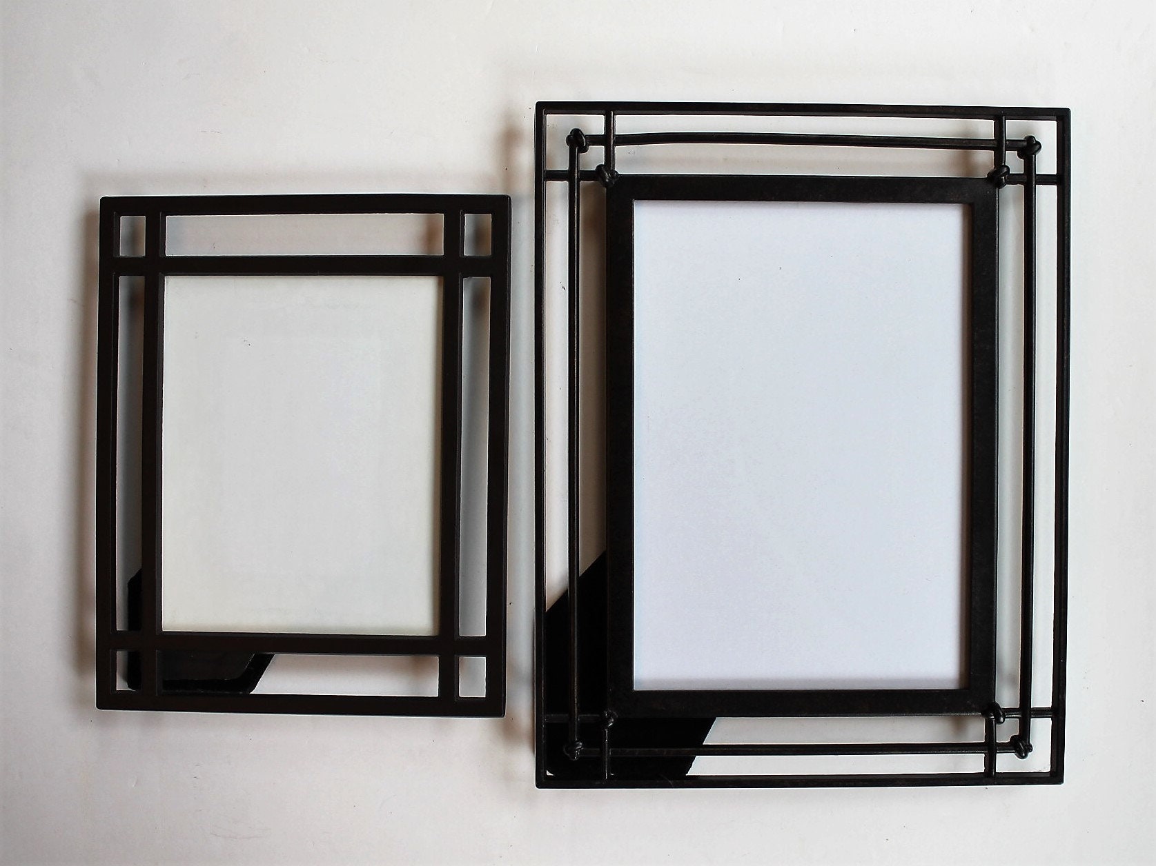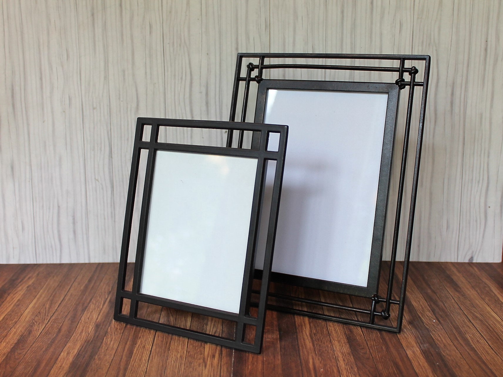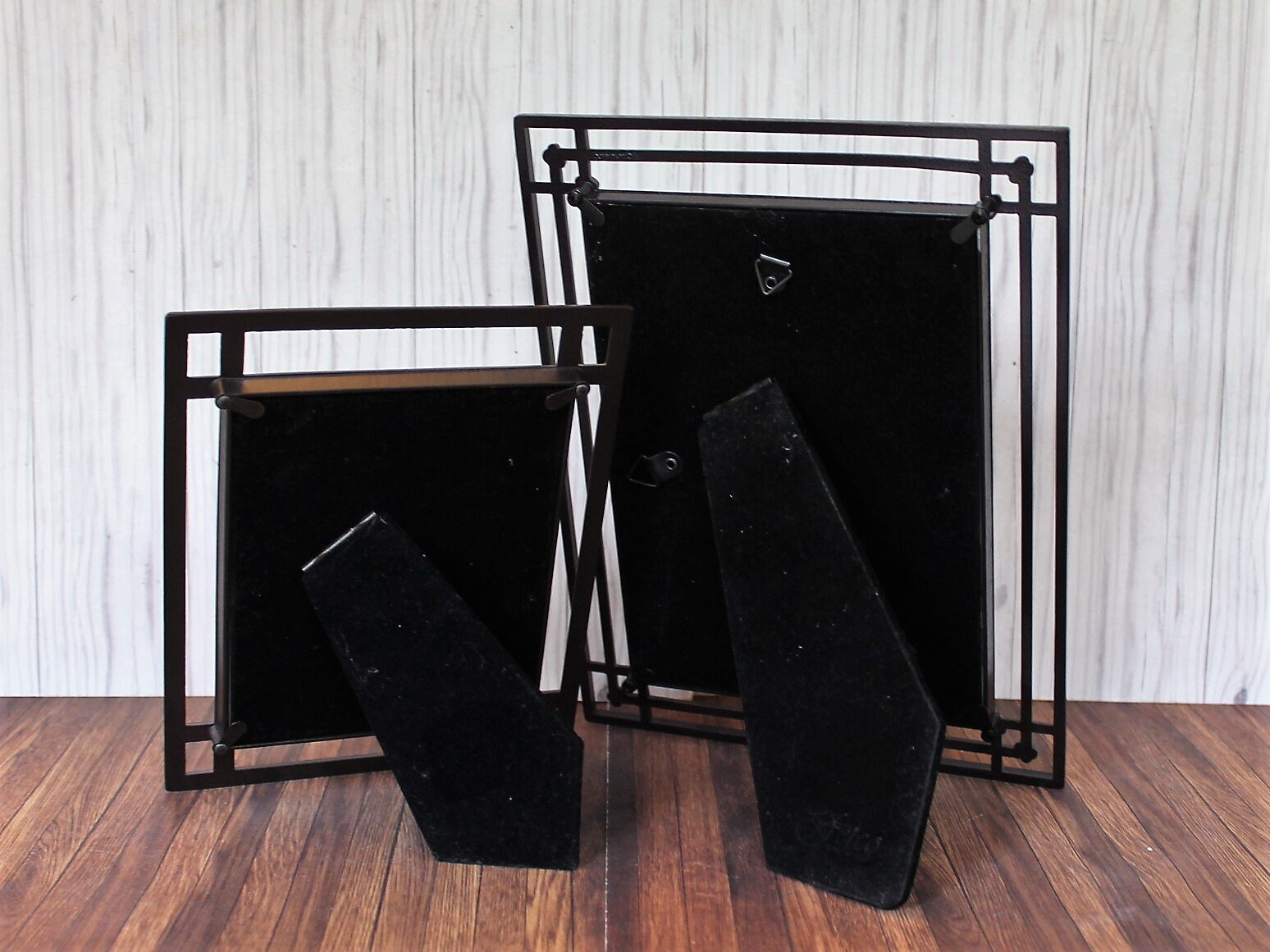 This set of 2 coordinating photo frames includes one 4x5 frame and one 4x6 frame. Both frames have an arts and crafts style design of intersecting lines creating a framed square in each corner.