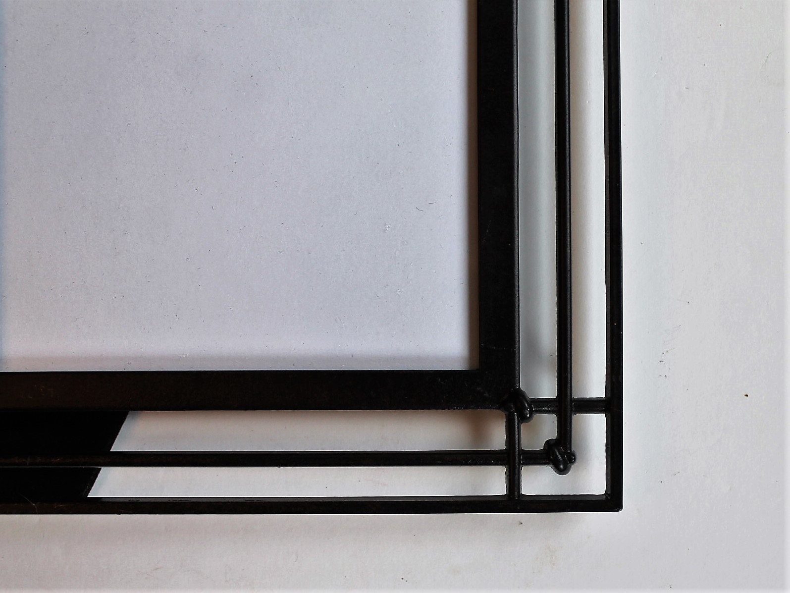 The smaller frame is 7" tall and 5.5" wide, and can hold one 4" x 5" photo. It is a dark bronze colored metal, and the area between the metal lines are open.