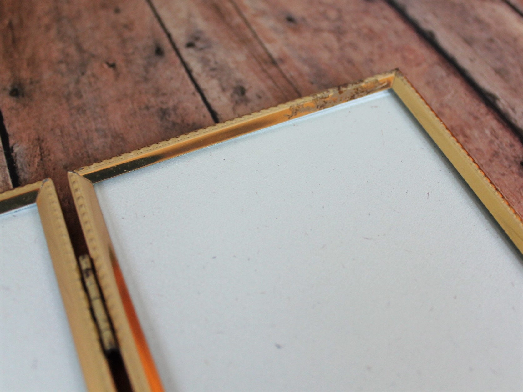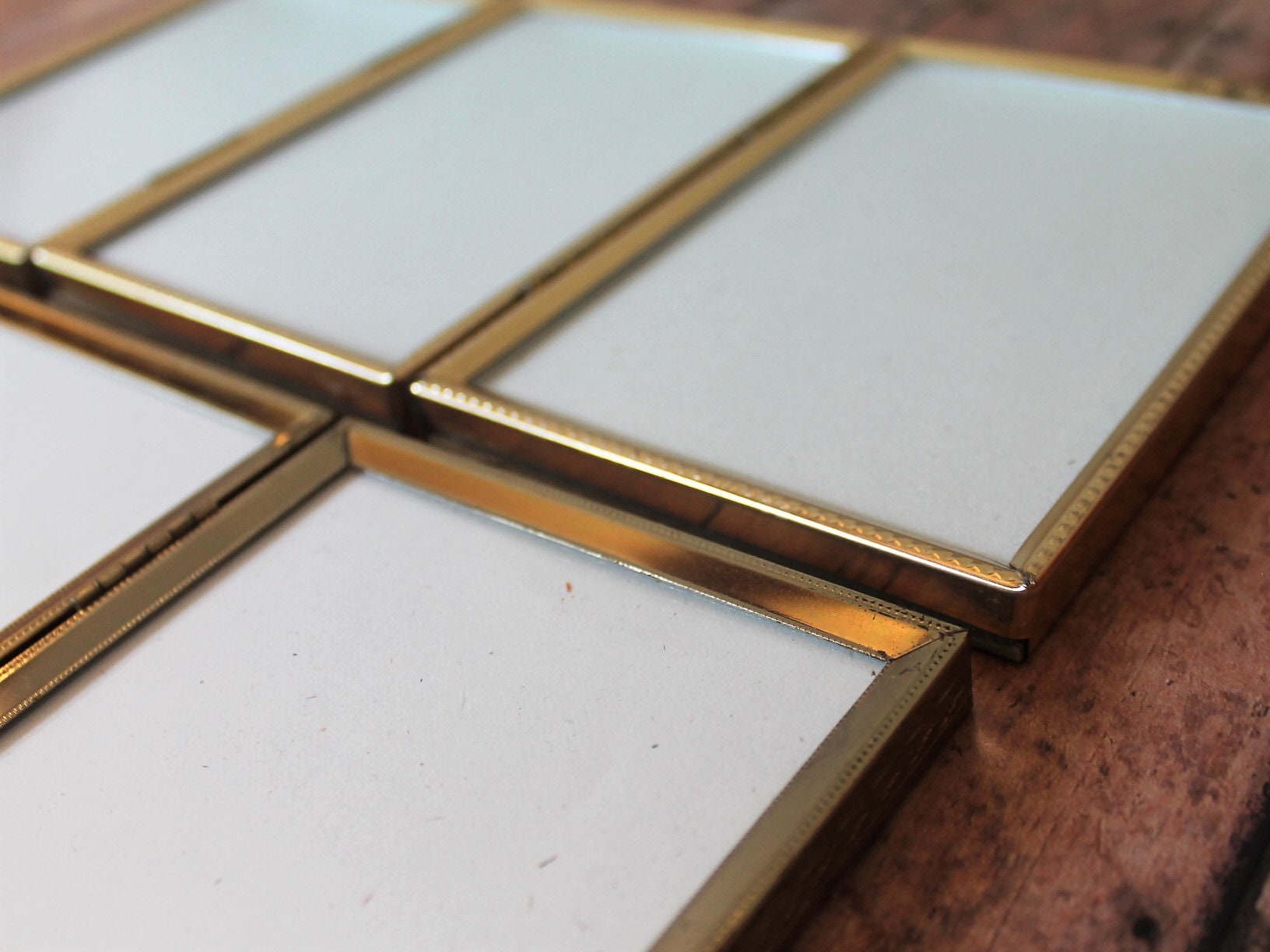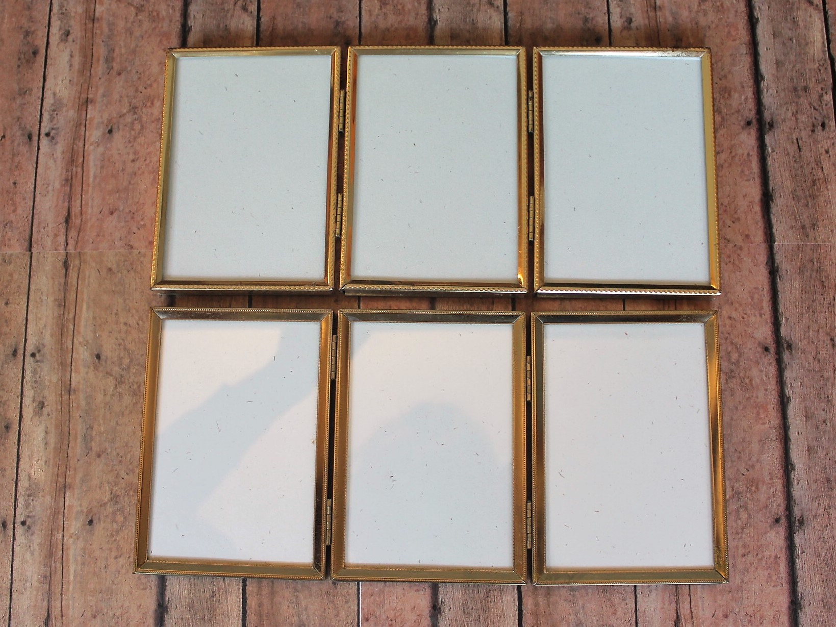This set of 2 brass colored metal photo frames are 3-part hinged frames with 3 3.5" x 5" frames in each one. The frames are nicely detailed with geometric designs along the front and sides of the frames. The frames are different styles and pattern, and have clear glass inserts over all of the photo openings and cardboard backing pieces on all 3 frame sections.