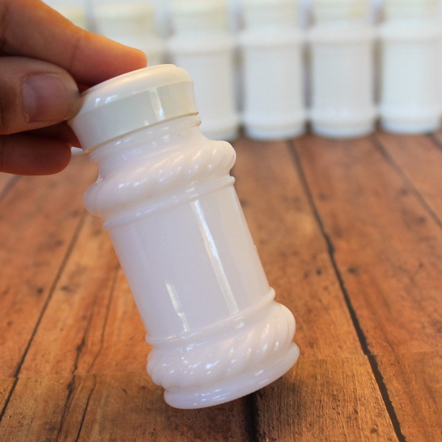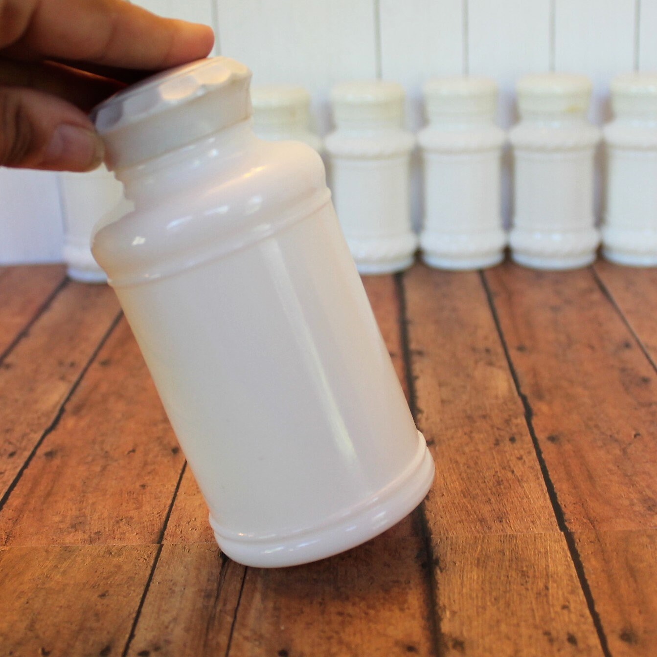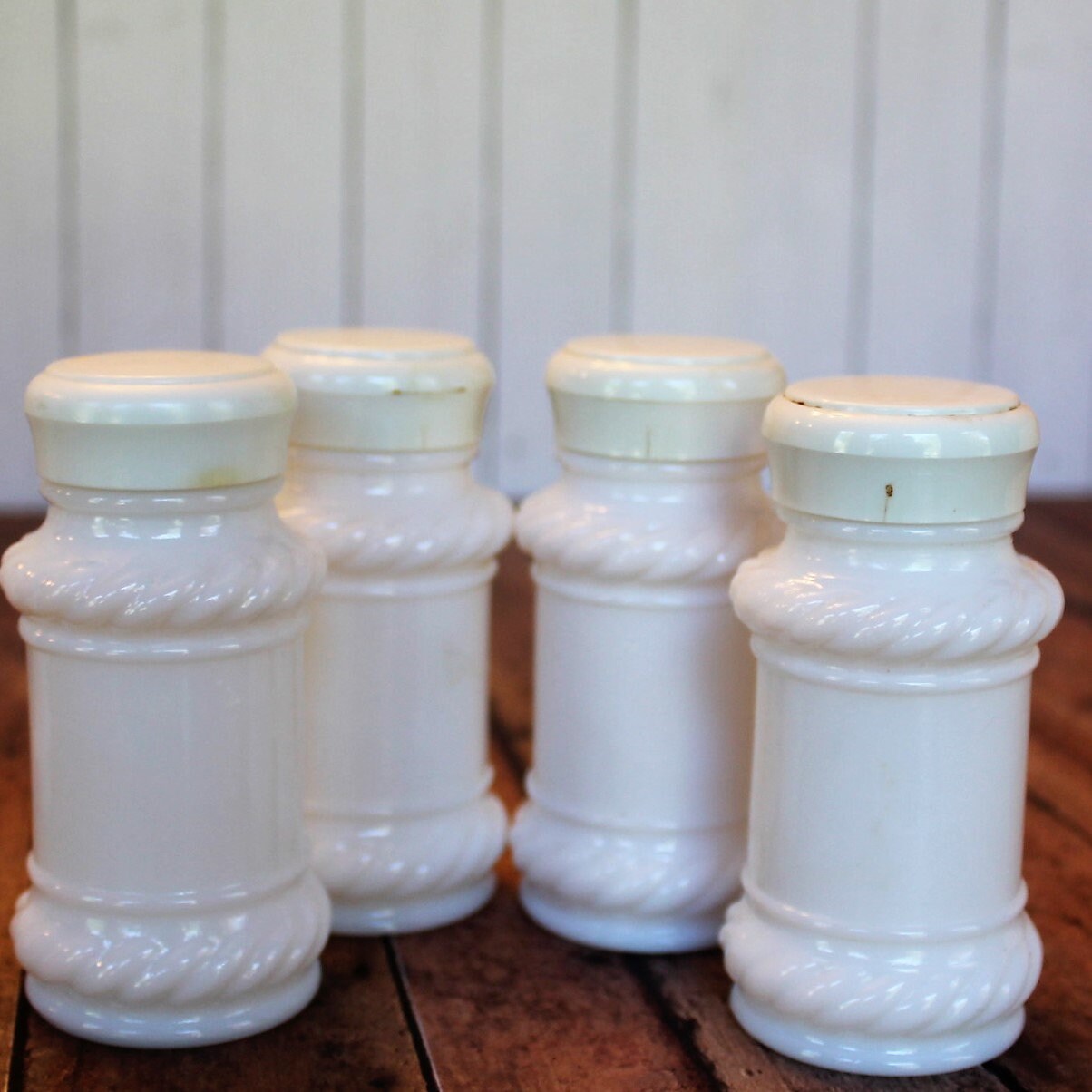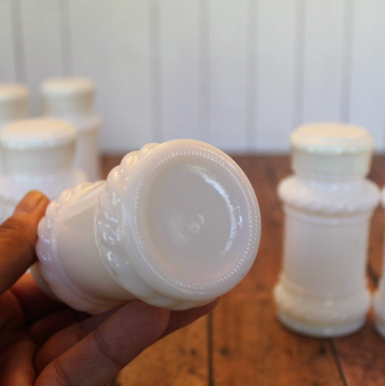 This set of 8 white glass jars includes 7 small matching jars and one larger jar. The small jars measure 3.75" tall and 2" in diameter, and the larger jar is 5" tall and 2.5" in diameter. The small jars all have a twisted rope pattern along the top and bottom of the jar.