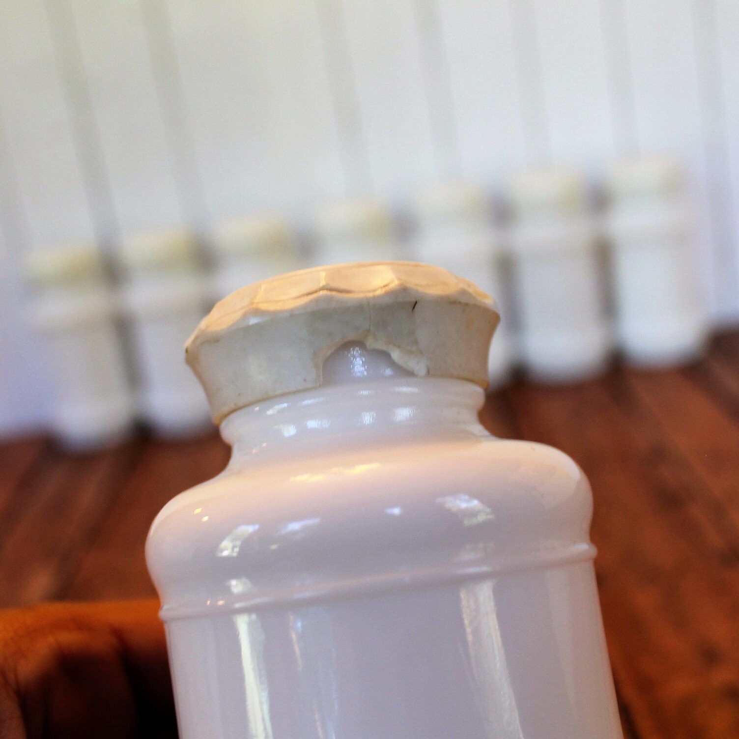 All of the jars are in nice condition with no chips or cracks - some of the caps do have cracks or some discoloration, and the cap for the large jar does have a chipped piece missing. These areas are shown in detail in the last 2 photos.