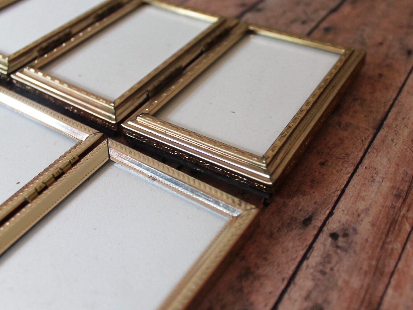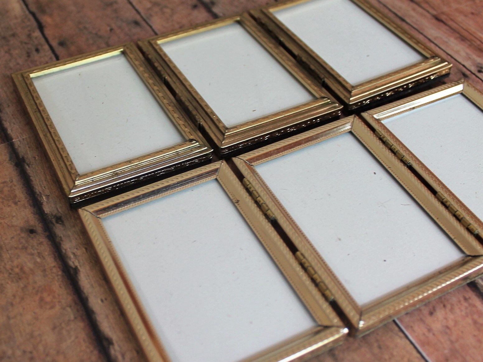 This set of 2 brass colored metal photo frames are 3-part hinged frames with three 2x3 frames in each one. The frames are nicely detailed with geometric designs along the front and sides of the frames. The frames are different styles and pattern, and have clear glass inserts over all of the photo openings and cardboard backing pieces on all 3 frame sections.