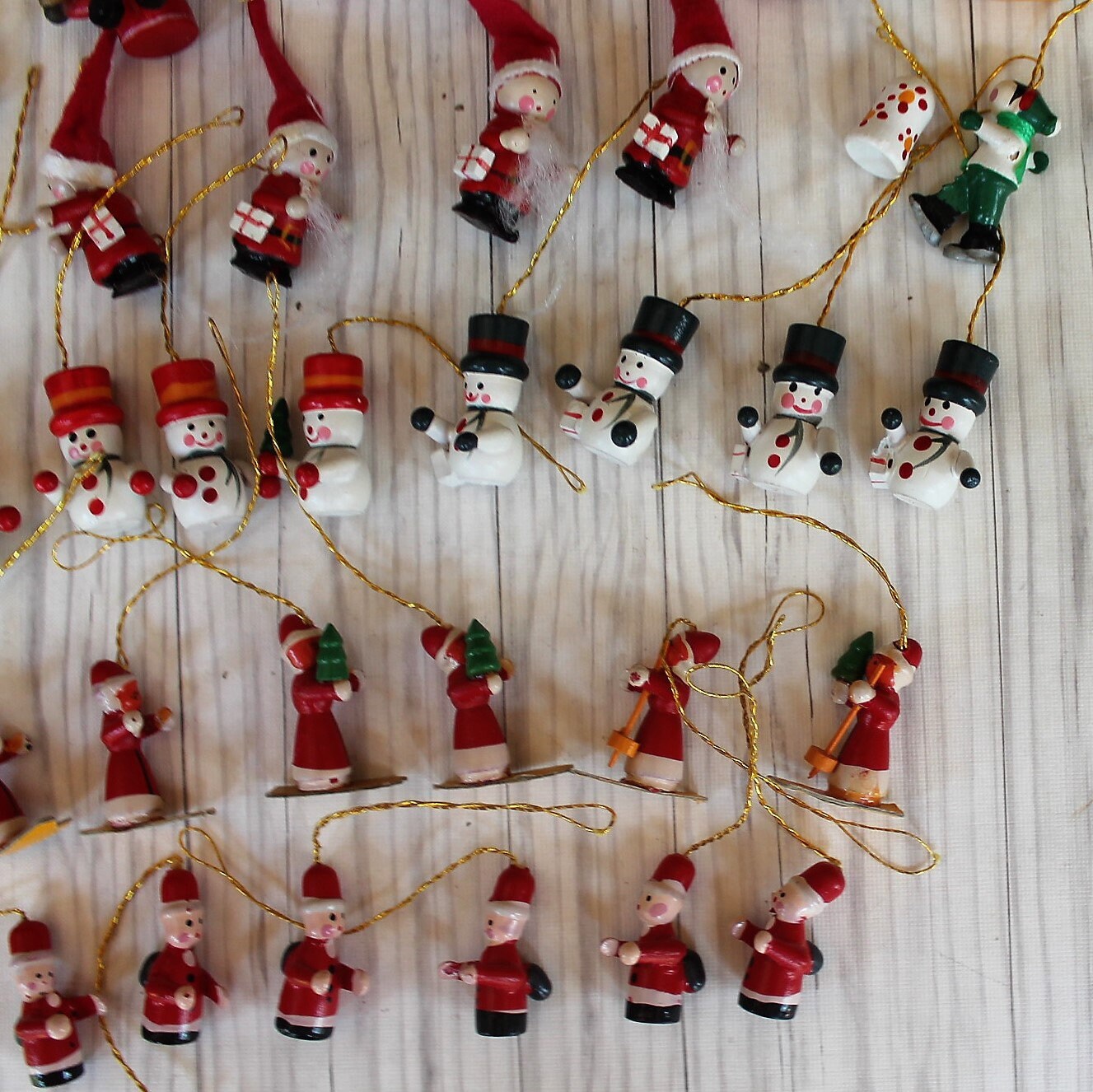 This cute set of miniature wooden ornaments includes 33 coordinating ornaments. These ornaments are quite small, measuring from under 1" tall to 2" tall. There is several different styles of ornaments, including Santas, snowmen, angles, and elves.