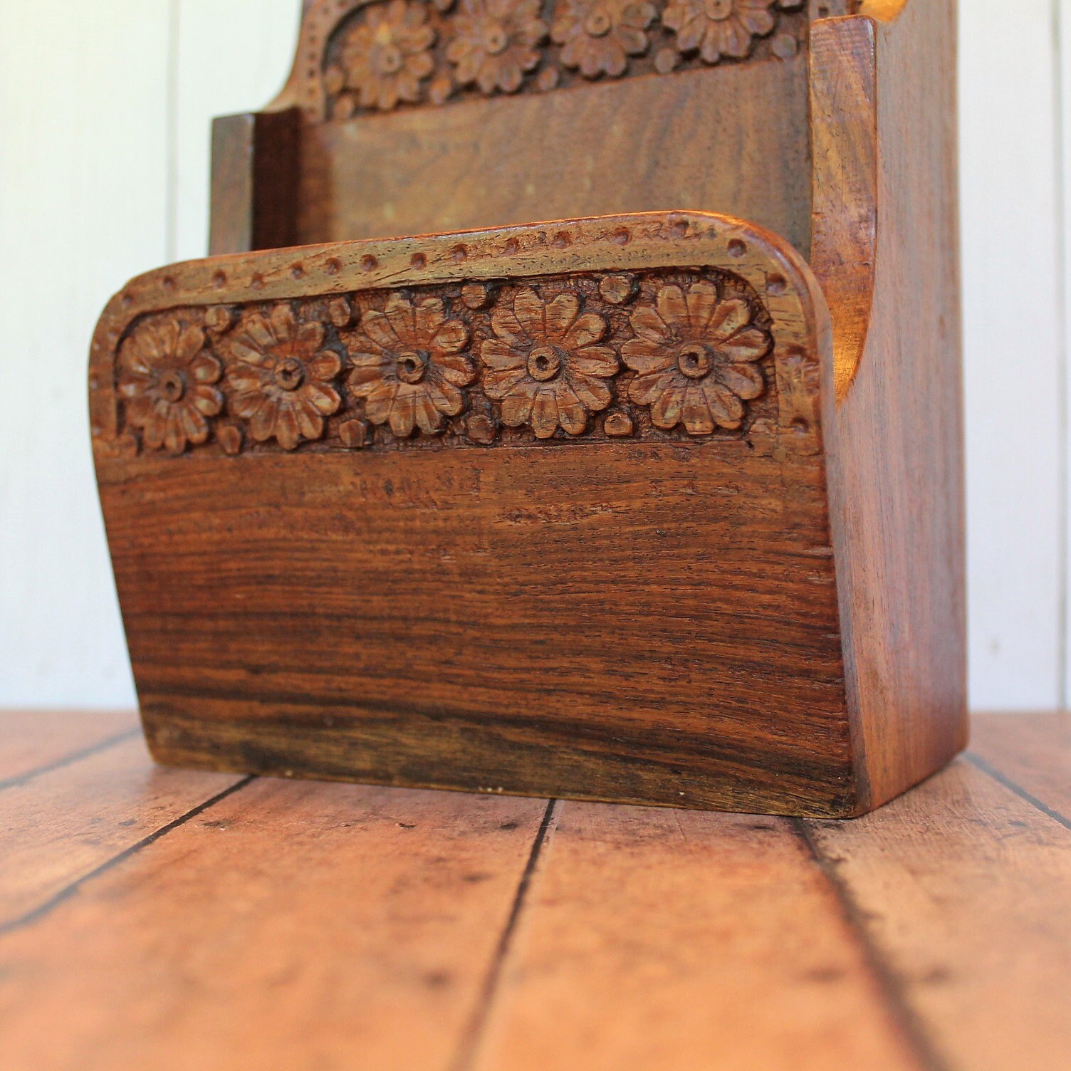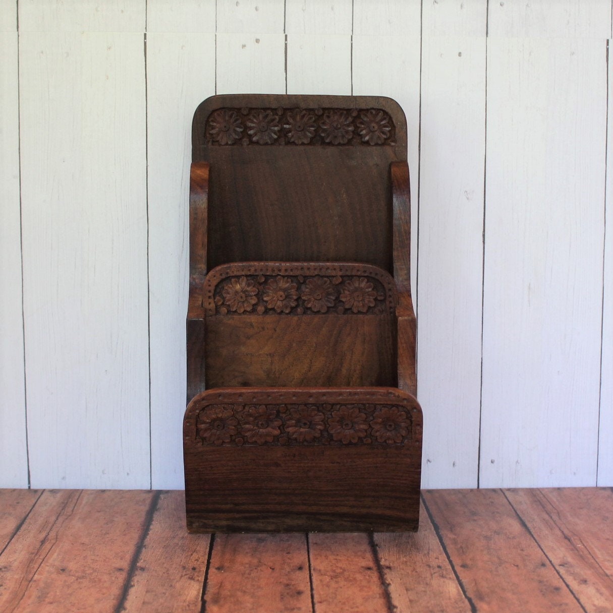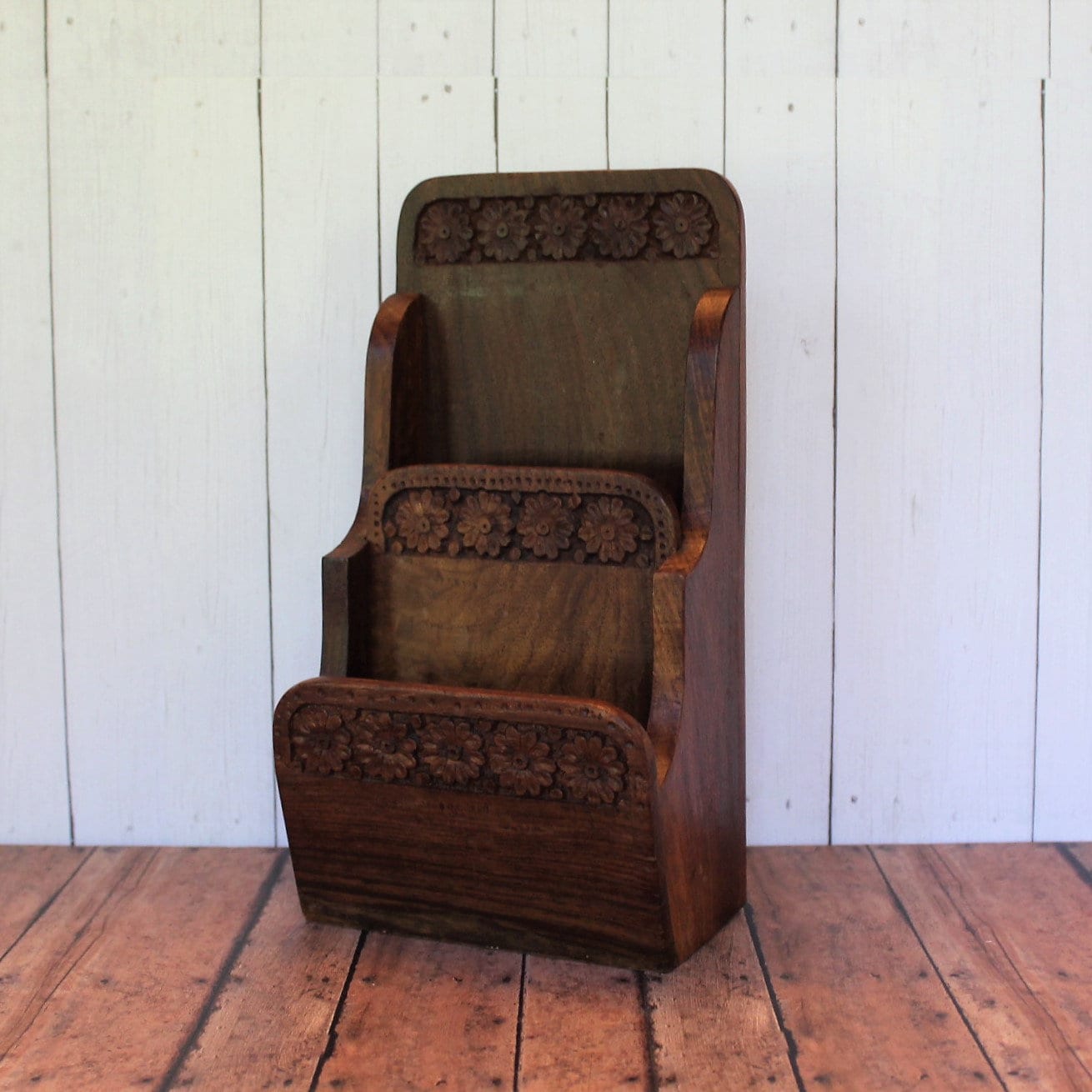This wooden letter organizer is 10.25" tall, 5.5" wide, and 3.75" deep. The organizer has 2 vertical compartments to hold paper. The front edge of each section is decorated with a carved floral design. There are no holes or hangers for hanging this piece.