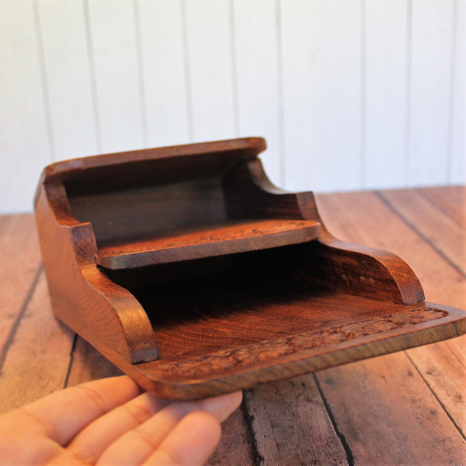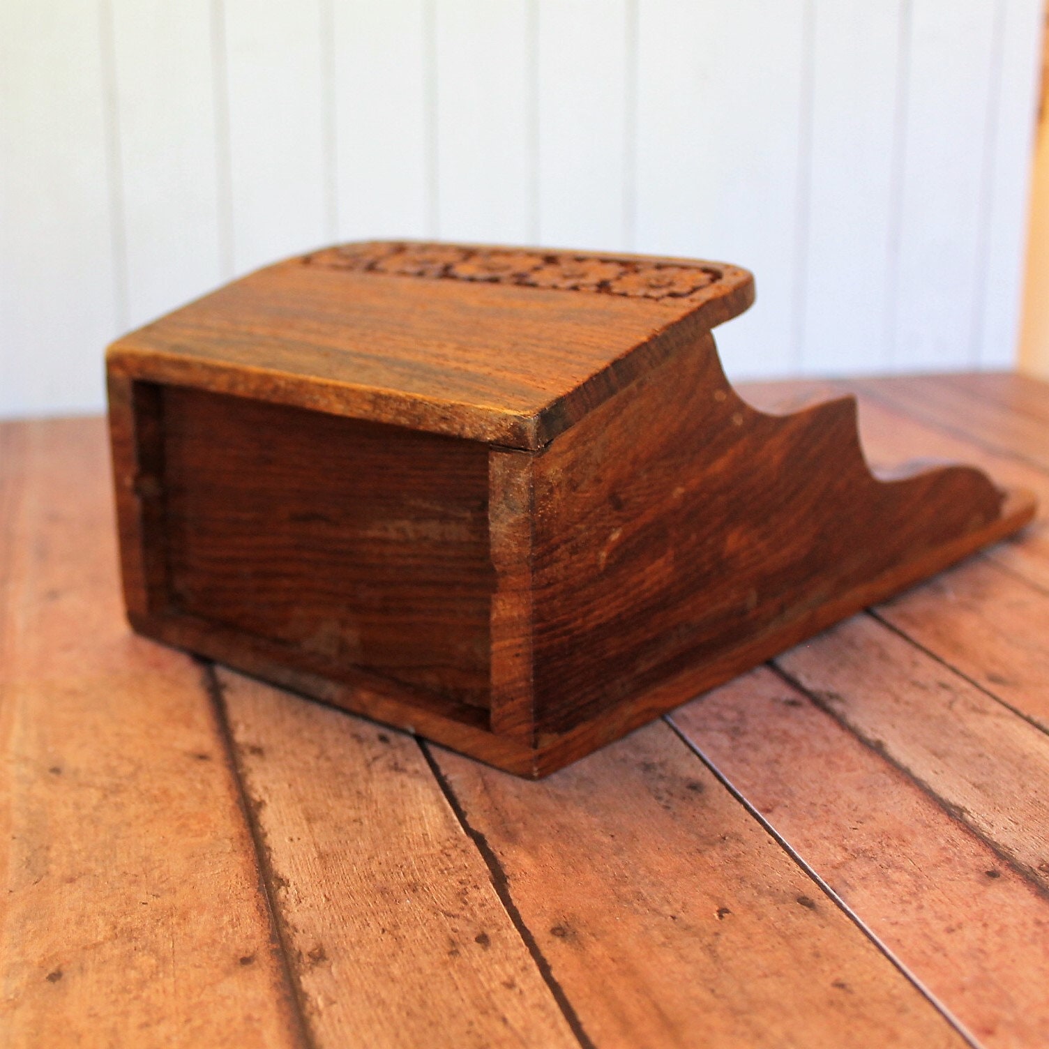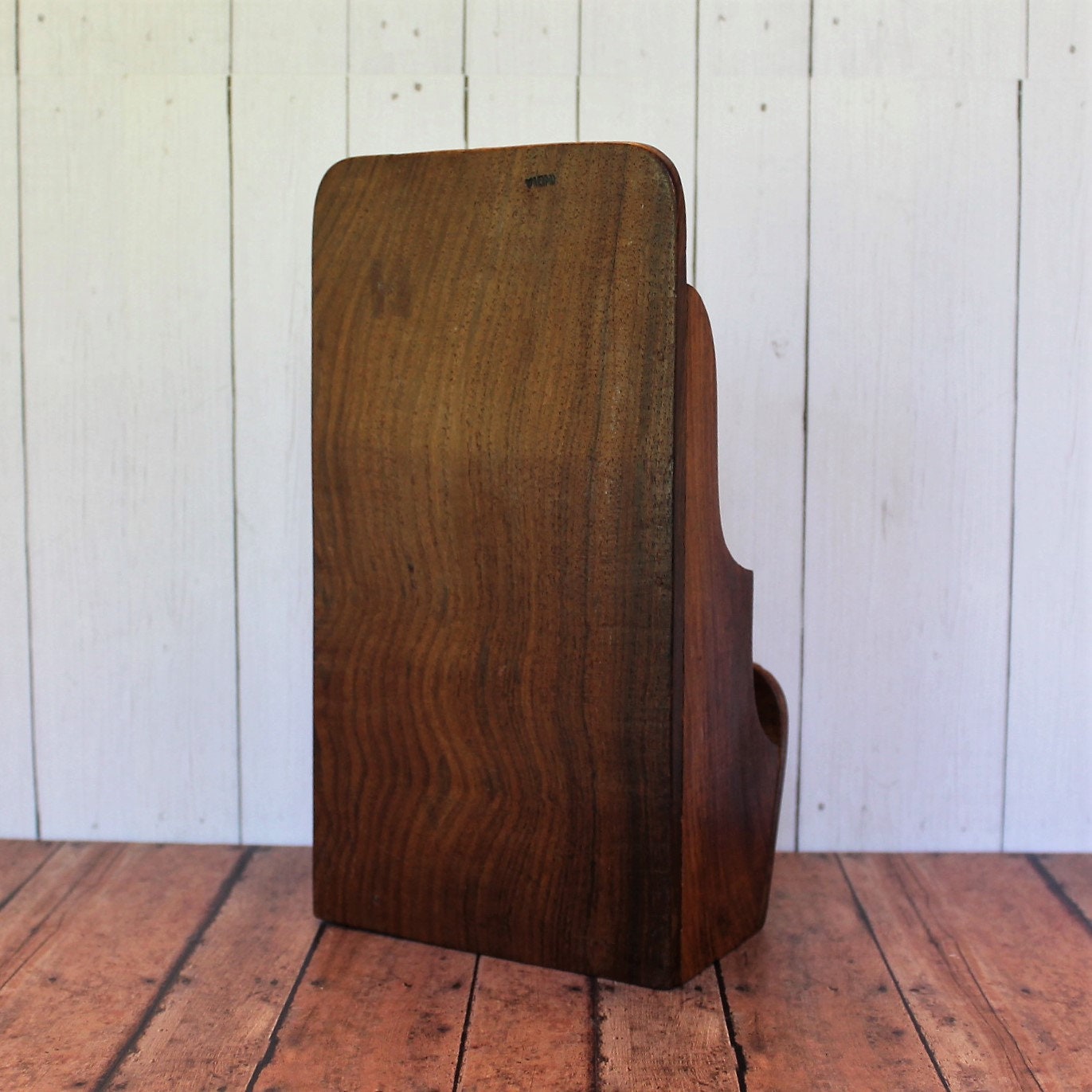 This wooden letter organizer is 10.25" tall, 5.5" wide, and 3.75" deep. The organizer has 2 vertical compartments to hold paper. The front edge of each section is decorated with a carved floral design. There are no holes or hangers for hanging this piece.