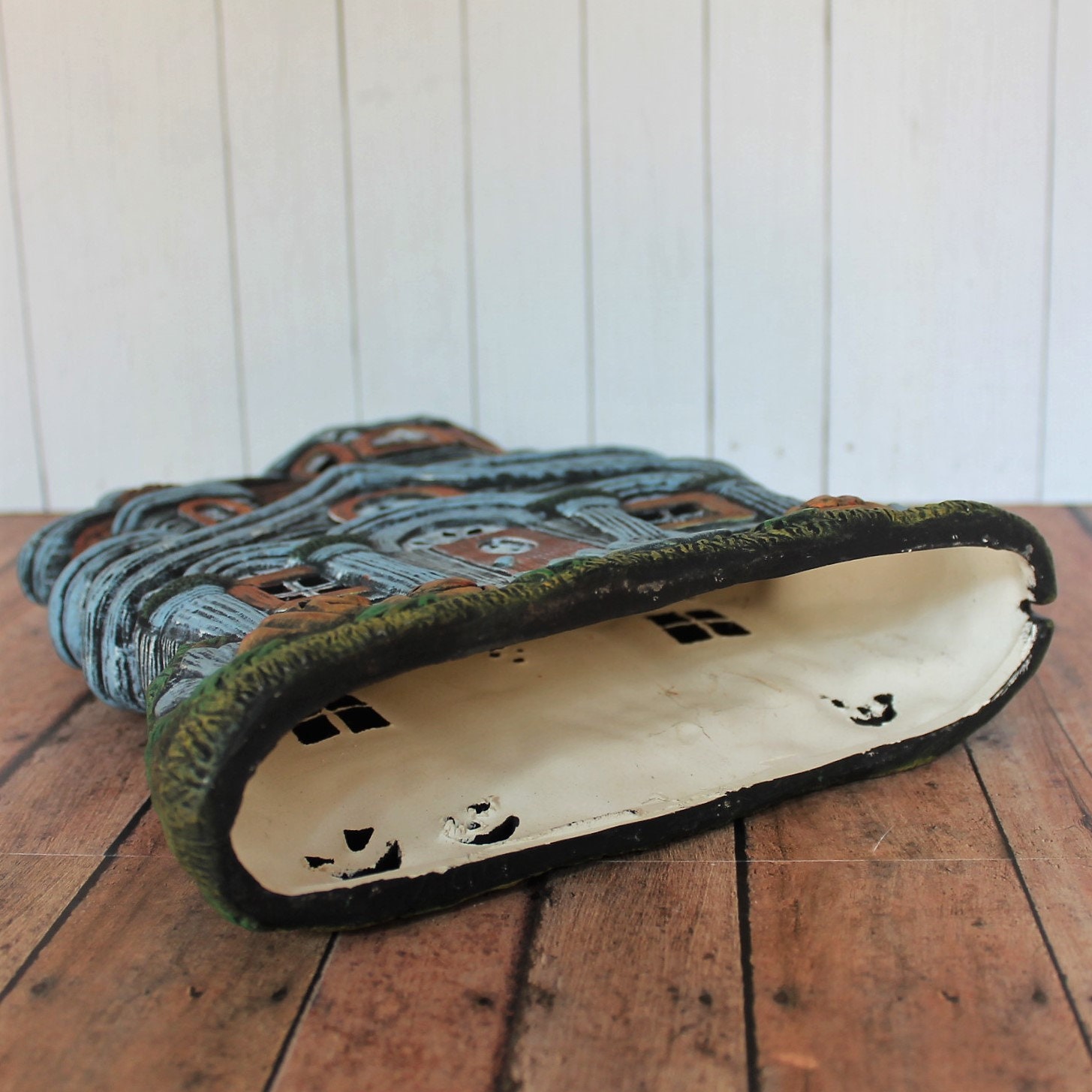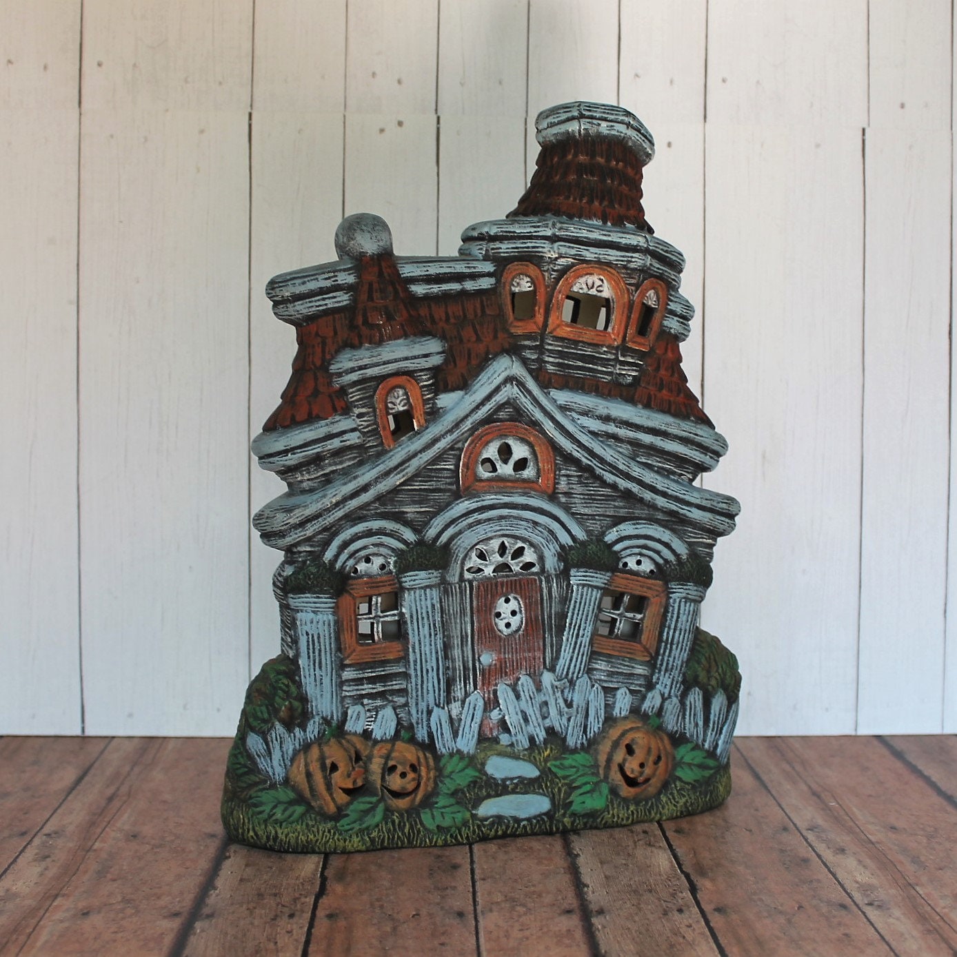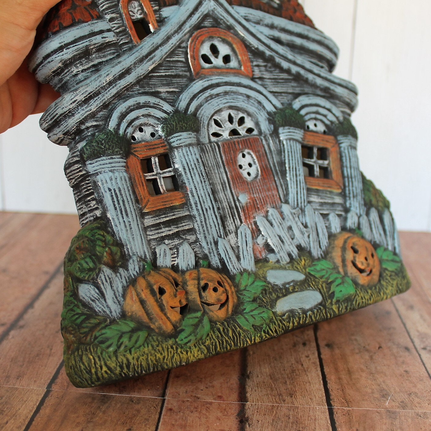 This ceramic haunted house is 12" tall, 8.5" wide, and 2.5" deep. The house is painted with shades of gray, and accented with brown and orange windows and doors. The front and back of house have the same scene, just in reverse. The windows, door, and pumpkins have cutout areas for light to shine through. The base of the piece is thin, and the opening is 1.75" across. There is a small opening on one side of a cord to pass though.