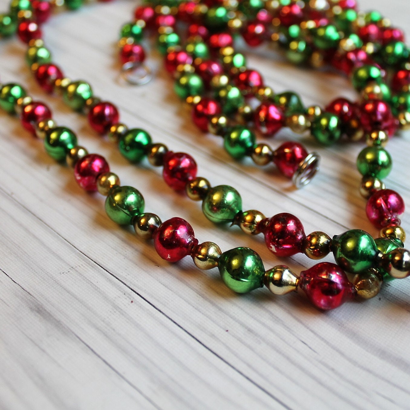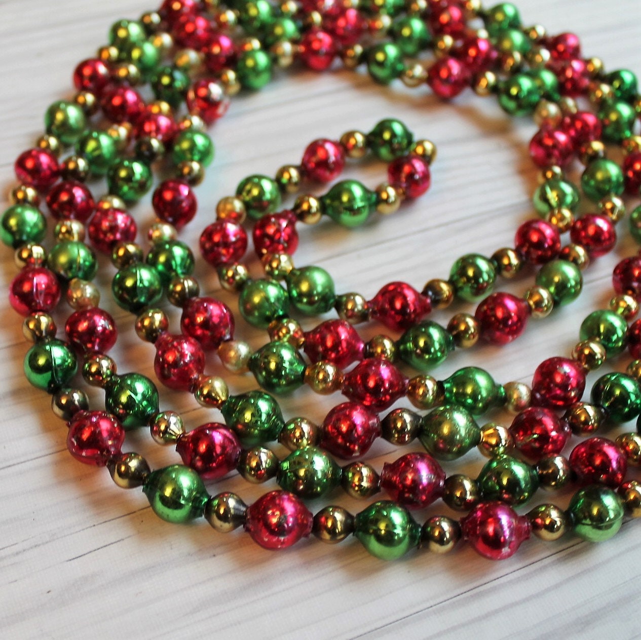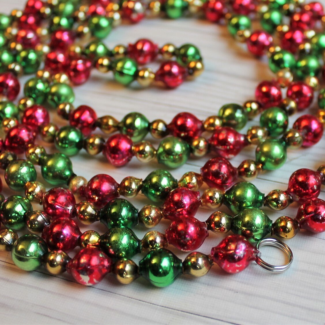 This traditional style mercury glass bead garland was restrung from salvaged beads that were taken from several different damaged strands. This garland has larger green and red beads, alternating with smaller gold beads. The ends of the garland is secured with small metal ring for hanging. This listing is for one 7.5' (90 inch) strand of garland. The green and red beads are 1/2" in diameter, and the smaller gold beads are 1/4" in diameter.