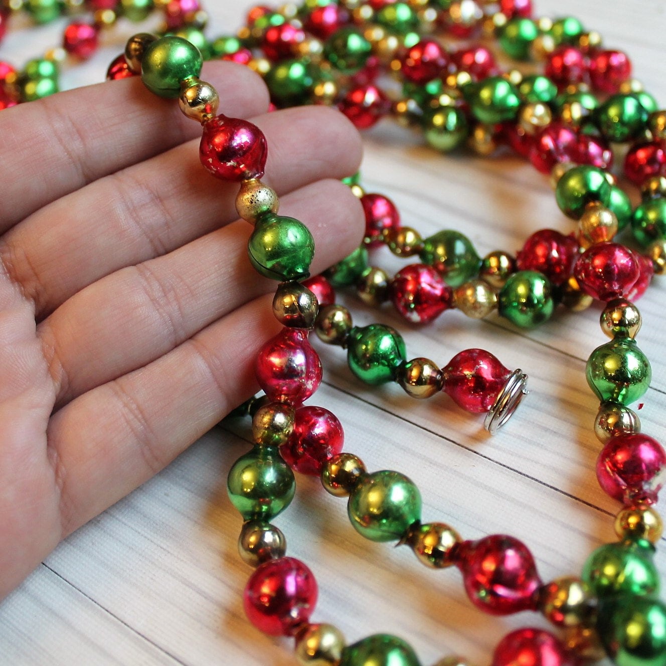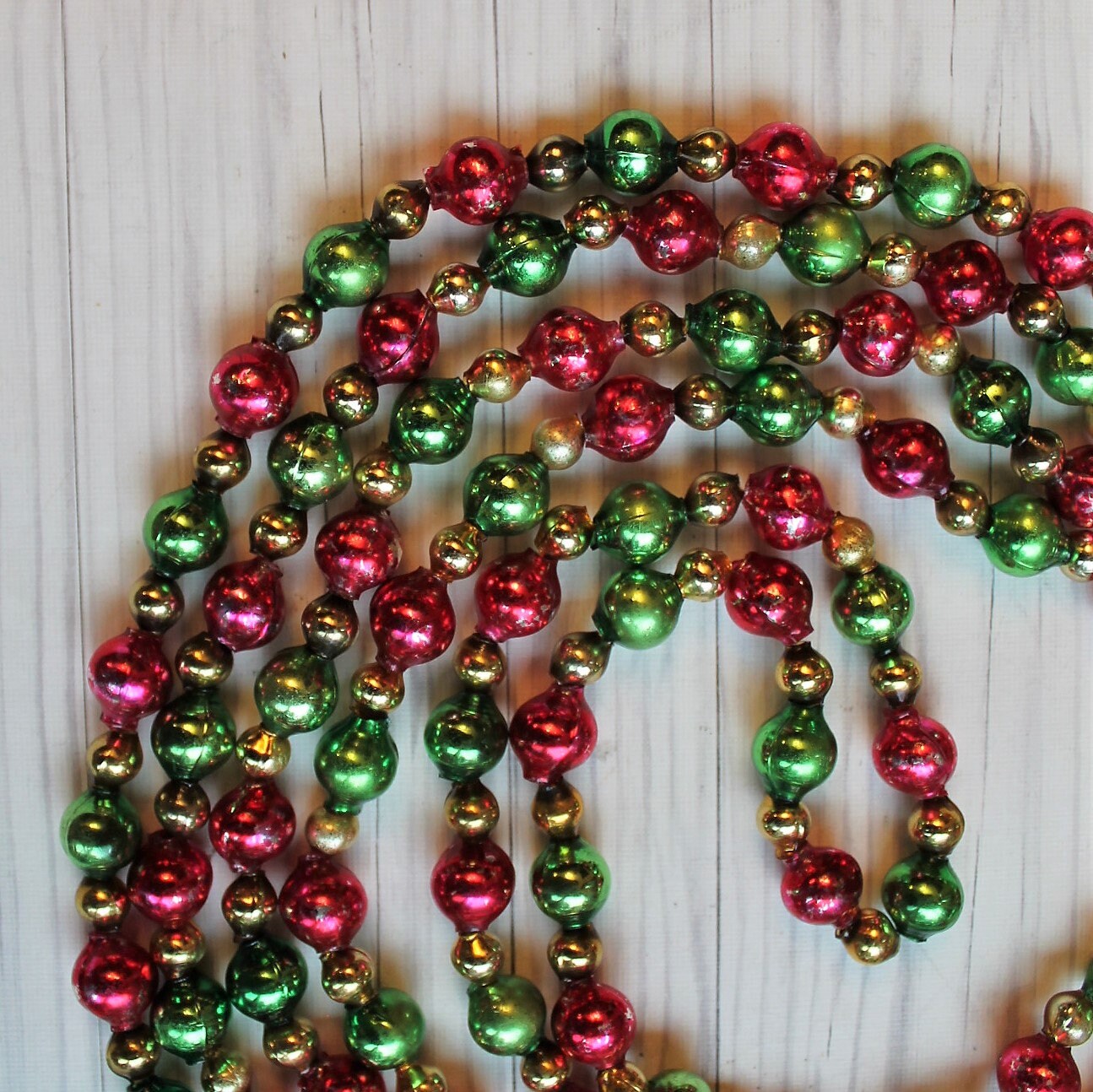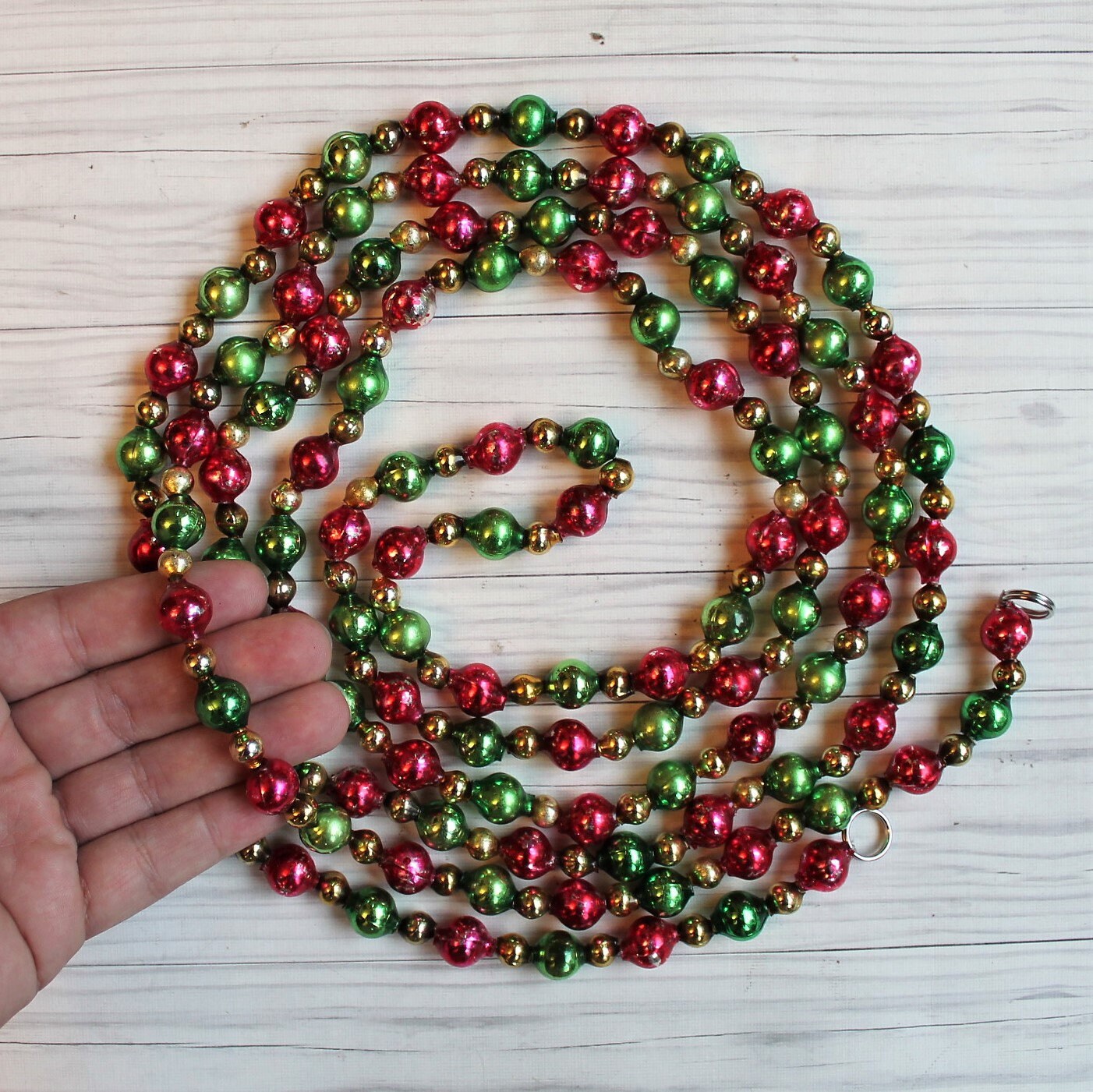 This traditional style mercury glass bead garland was restrung from salvaged beads that were taken from several different damaged strands. This garland has larger green and red beads, alternating with smaller gold beads. The ends of the garland is secured with small metal ring for hanging. This listing is for one 7.5' (90 inch) strand of garland. The green and red beads are 1/2" in diameter, and the smaller gold beads are 1/4" in diameter.