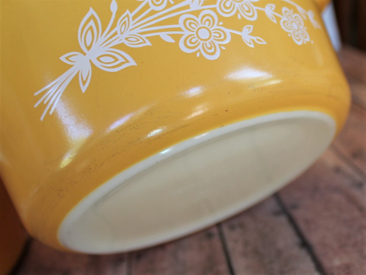 All of the casseroles and lids are in very good condition with no chips or cracks. All of the graphics are bright and clear. The middle casserole 474 does have some light wear and scratches along the bottom rim - this is shown in detail in the last photo. There are some light scratches and utensil marks on the insides of the casseroles from use.